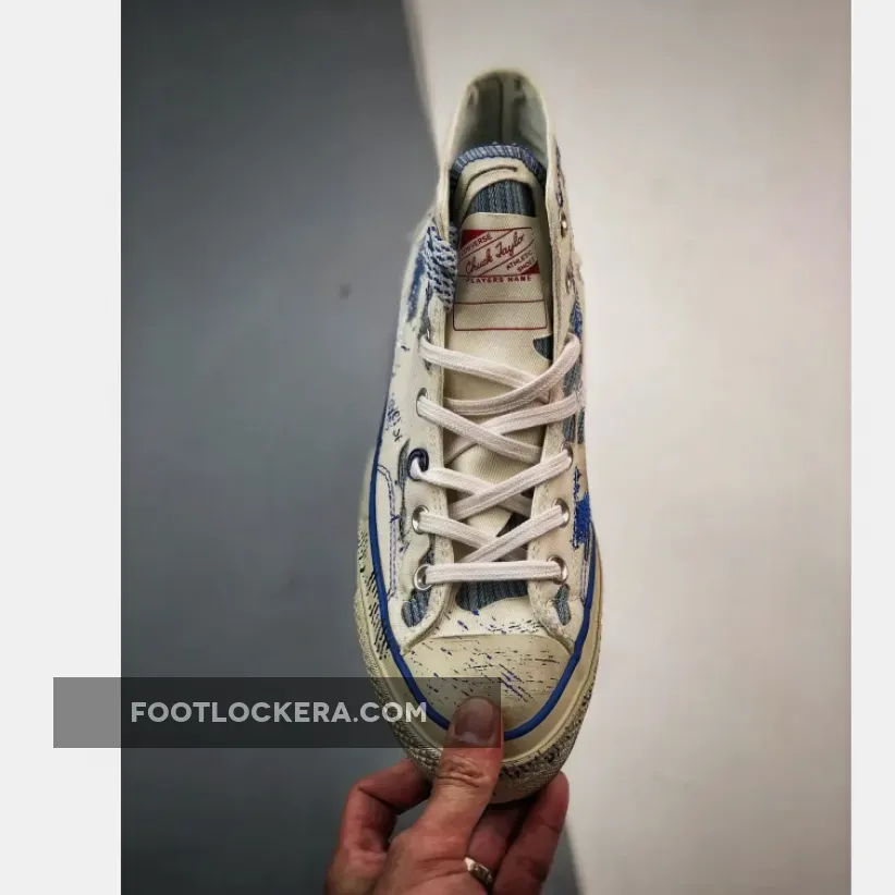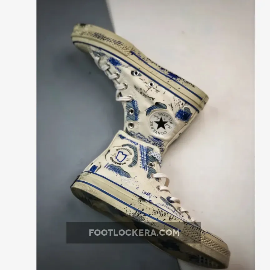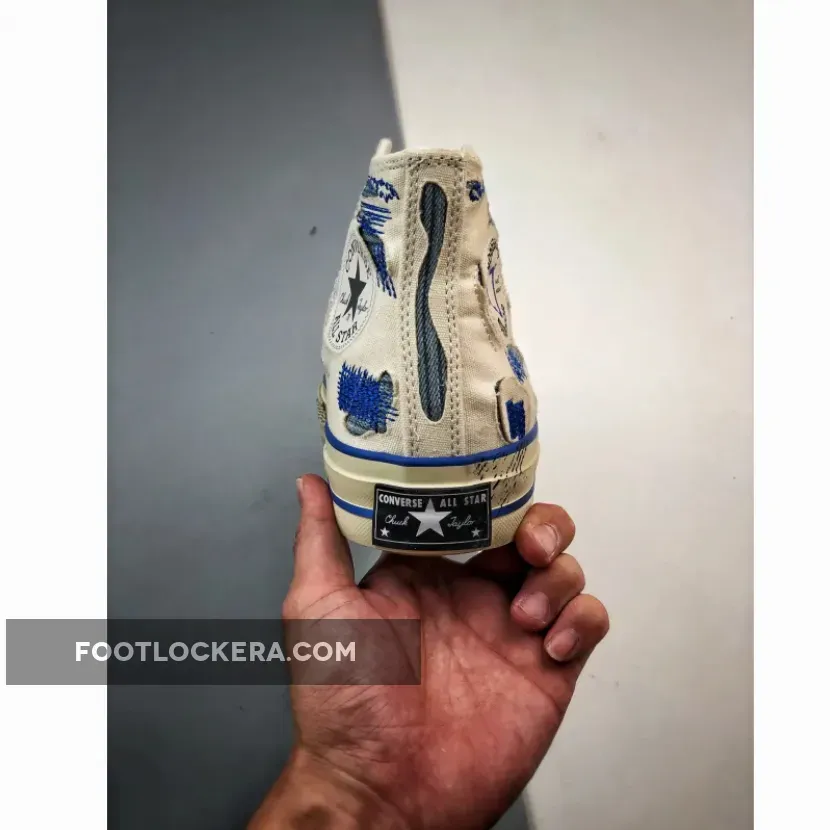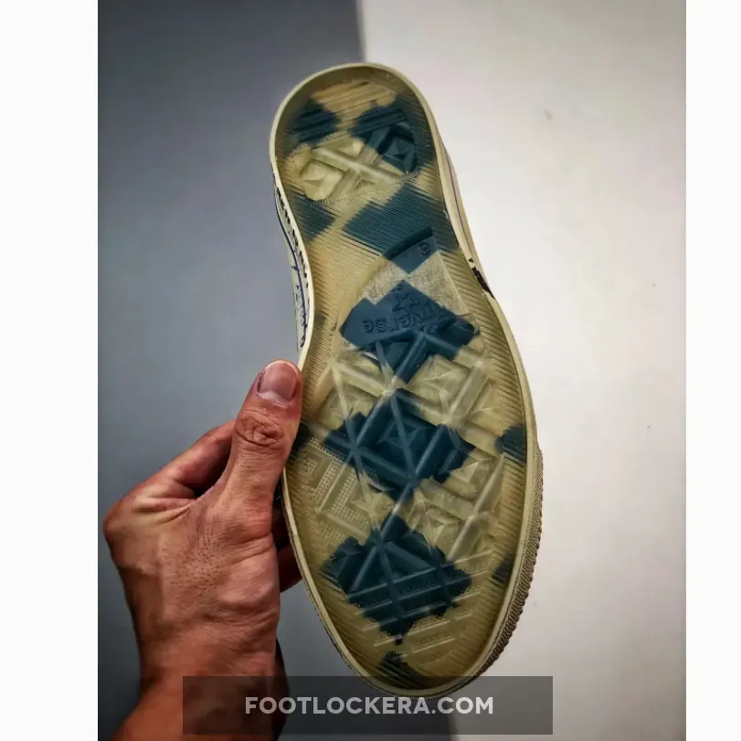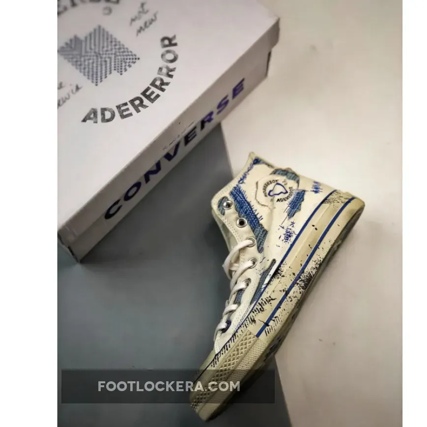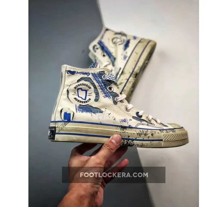 This collaborative colourway features a sail white canvas construction with exposed underlays flaunting blue knitted fabrics. Chaotic blue stitches and co-branded stamp marks maintain the disorganised makeover. Ader Error branding adorns the lateral ankle, while the signature Chuck 70 patch sits on the medial panel. Red Converse labels make up the tongue on the right shoe, with contrasting blue Ader Error branding on the left. The sail white rubber toe cap and midsole have scuff marks, stains, and chipped paint graphics to keep the design consistent. Co-branded nameplates on the heel celebrate the second collaboration between the two brands. The yellowing translucent outsole featuring blue and white plaid patterns wraps up this anarchic Chuck 70 High makeover.