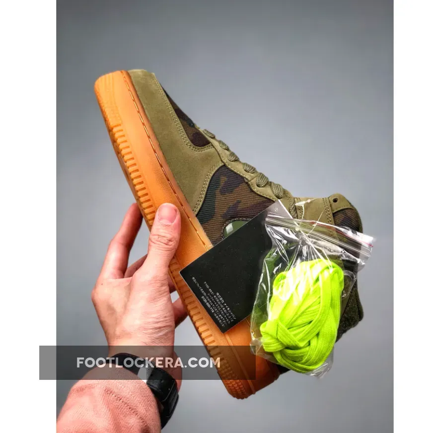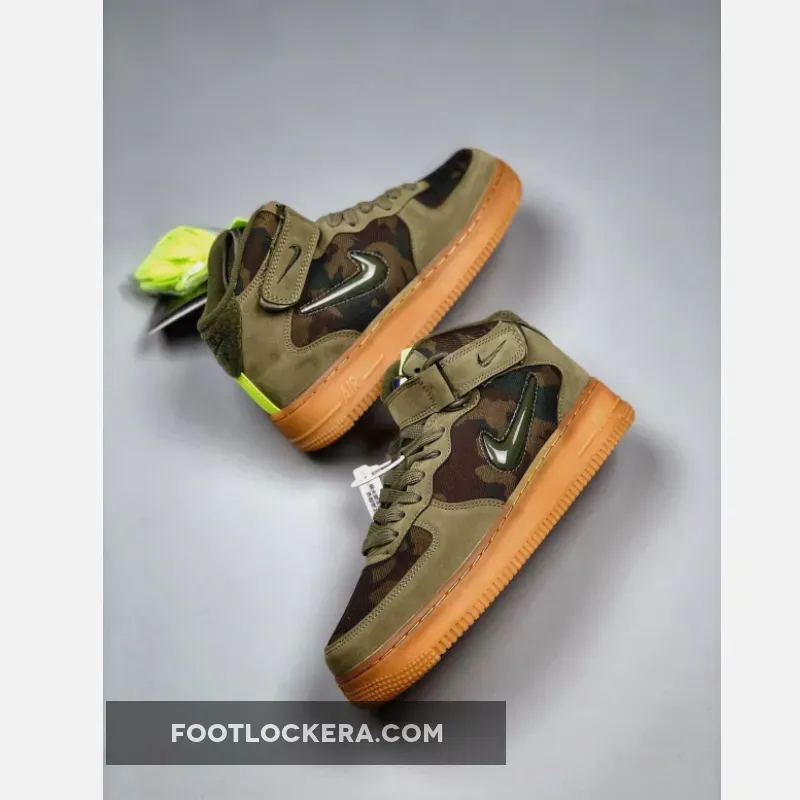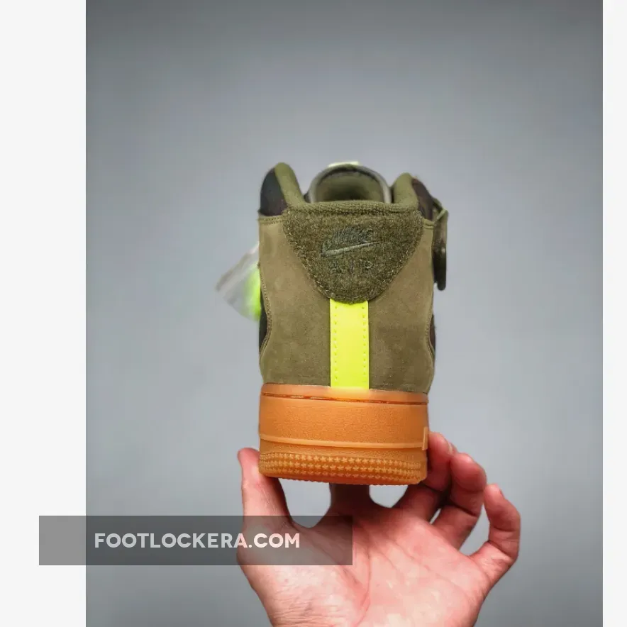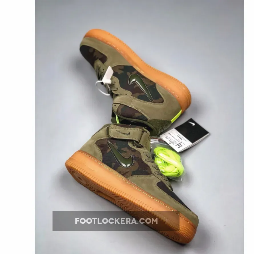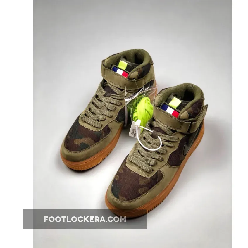 Dressed in a Medium Olive, Dark Army, and Volt color scheme. This Nike Air Force 1 Mid is highlighted with camouflage print, Volt accents and a removable French flag patches on the tongue.