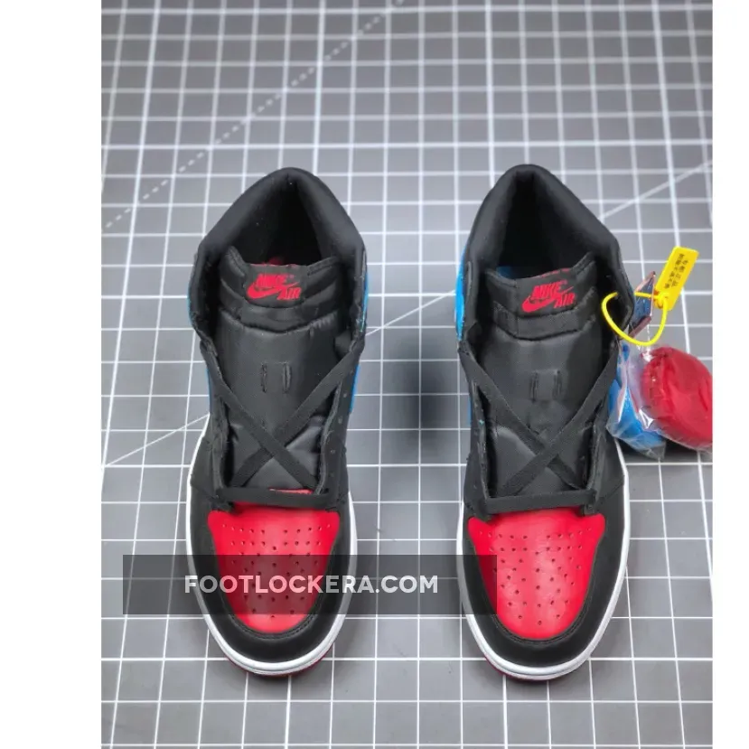 This womens Jordan 1 is composed of a black tumbled leather upper with red and university blue overlays. A white midsole, red outsole, and classic Nike branding on the tongue complete the design. These sneakers released in February of 2020 and retailed for $170.