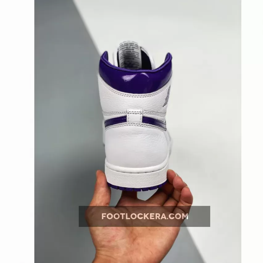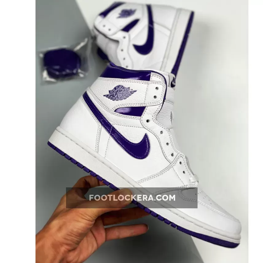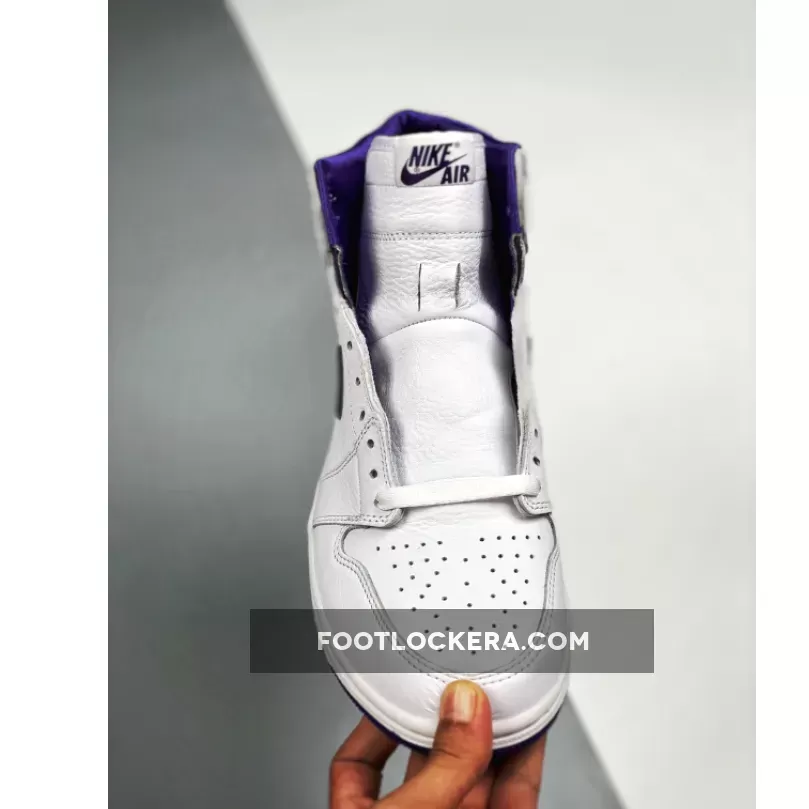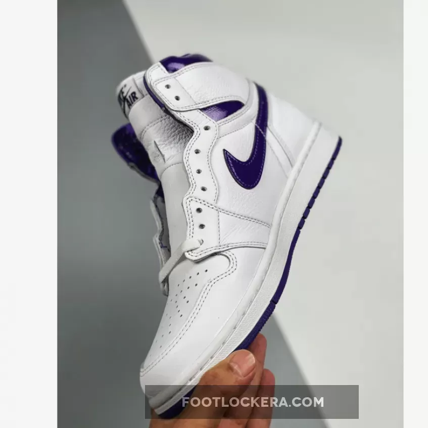 Dressed in a White and Court Purple color scheme. This Air Jordan 1 looks very similar to the OG “Metallic Purple” Air Jordan 1s, featuring a White leather upper with satin sockliner, Purple Swooshes, ankle collar, Wings logo, tongue branding, insoles, and rubber outsole.
