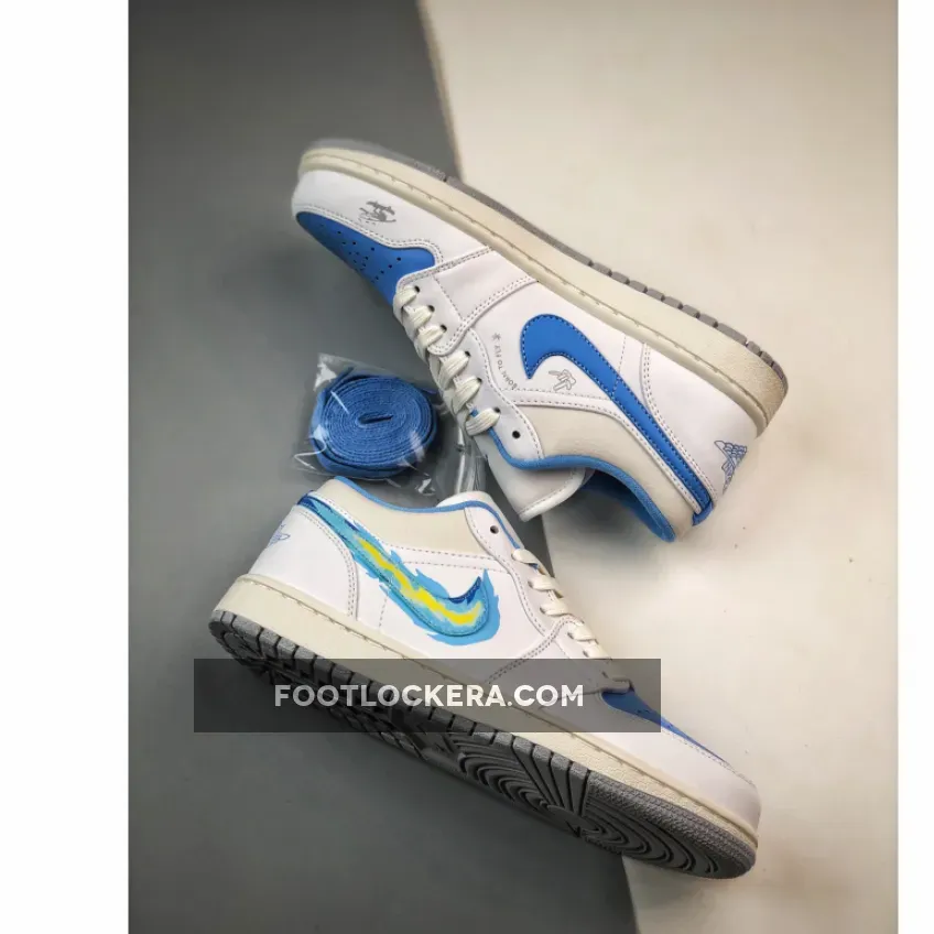 Seen here in an all-leather upper, the model features hits of cream/white with accenting university blue shades seen throughout. This blue hue takes over the toebox, Jordan branding, and sockliner, while all panels (minus the collar’s creamy hit) take on a stark white finish. Along the midfoot, the Swoosh logo gets covered in a blue flame graphic on the lateral side, while the medial side features a solid university blue Swoosh. Although this medial side forgoes the custom graphic, there are unique details like “Born To Fly” text and skate-friendly graphics in a grey hue. Back on the heel, the Jordan Wings logo appears drawn on the upper in university blue. Finishing the custom graphics are the nods to skateboarding on the reverse of the tongue, with the left sneaker showcasing an on-fire skateboard and the right hosting a book titled “Just Skate.” Rounding out the design is the sail midsole paired with a grey rubber outsole.