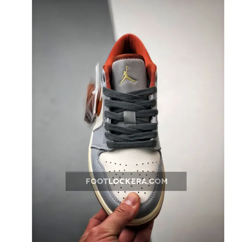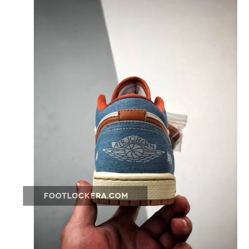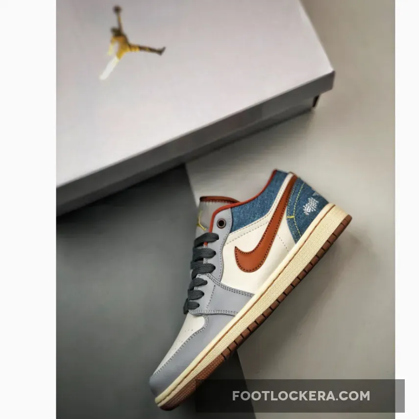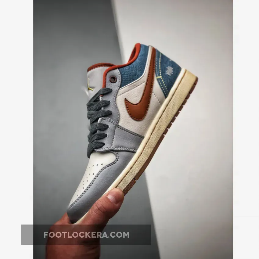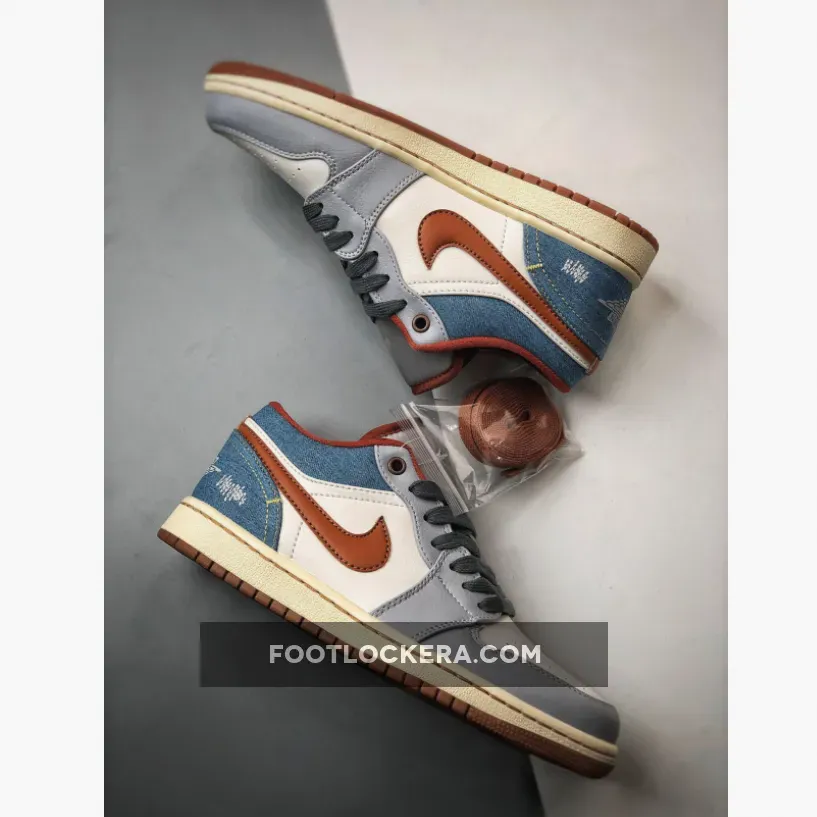 This Air Jordan 1 Low variant artfully integrates denim into its design, focusing on the heels and collars. The heels, in particular, showcase patch-stitching, adding an element of rugged sophistication to the sneaker. This is complemented by a leather construction on the forward half, where tumbled off-white uppers are elegantly overlaid with Football Grey accents at the forefoot, tongue, and laces, creating a harmonious blend of textures.