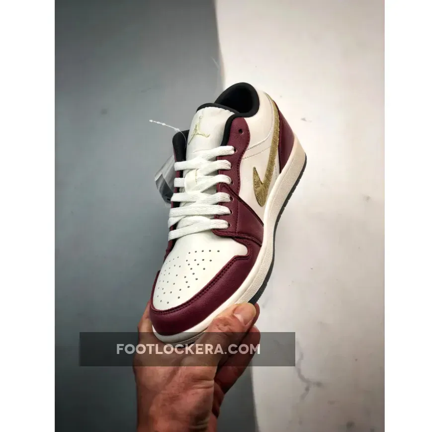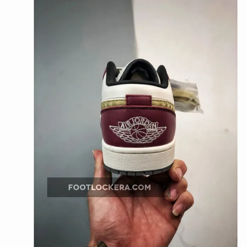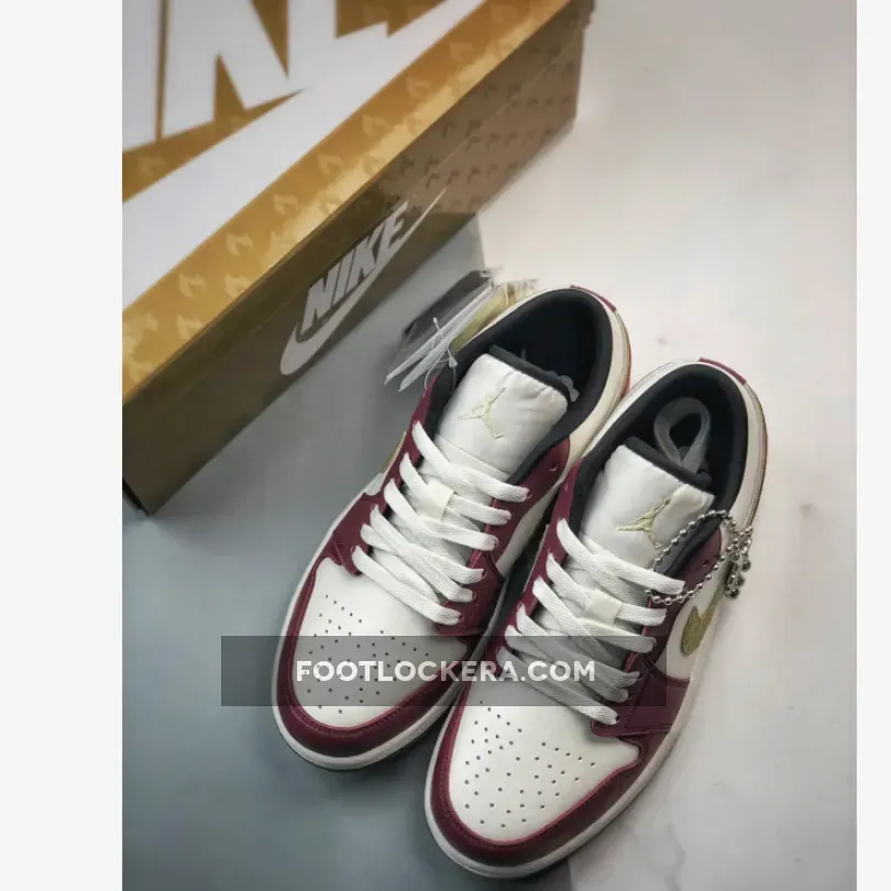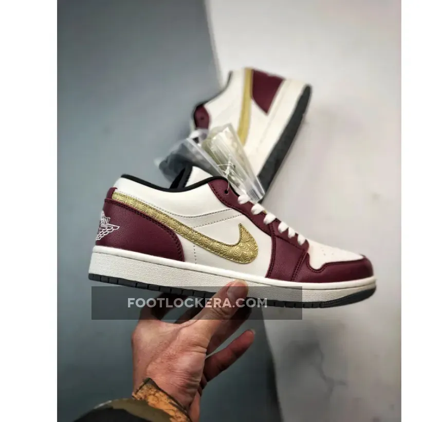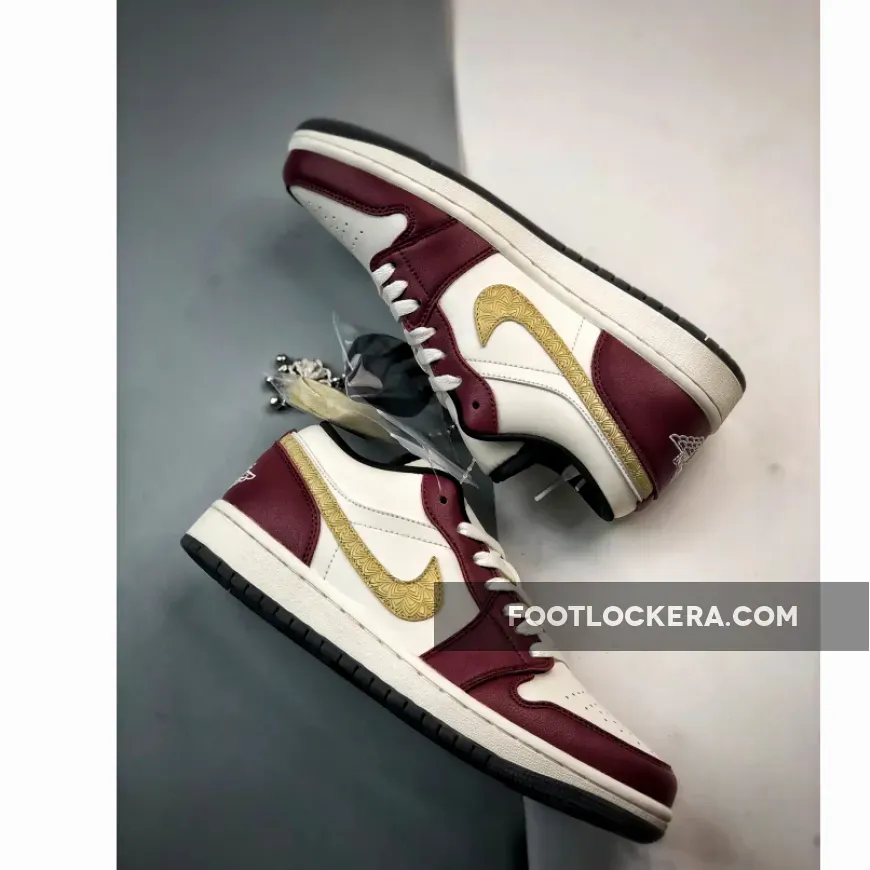 This special edition shoe showcases a Sail leather base and Dark Team Red overlays, complemented by Metallic Gold Swoosh logos. The silhouette showcases a sail white leather underlay with wine red leather overlays, emitting a vintage look. Luxury and celebration meet with Gold embroidery on the tongues and heels, along with matching insoles motifs. The sockliner flaunts a Jumpman logo sitting atop a golden Chinese New Year motif to immerse you in the vibrant festivities. The sail white midsole and grey semi-translucent rubber outsole round out the sneaker’s design. The package is complete with special ornament hang tags and a Jordan-branded red envelope, a nod to Chinese New Year traditions. The sneaker comes in a gold Nike shoe box decorated with scaly graphic patterns.