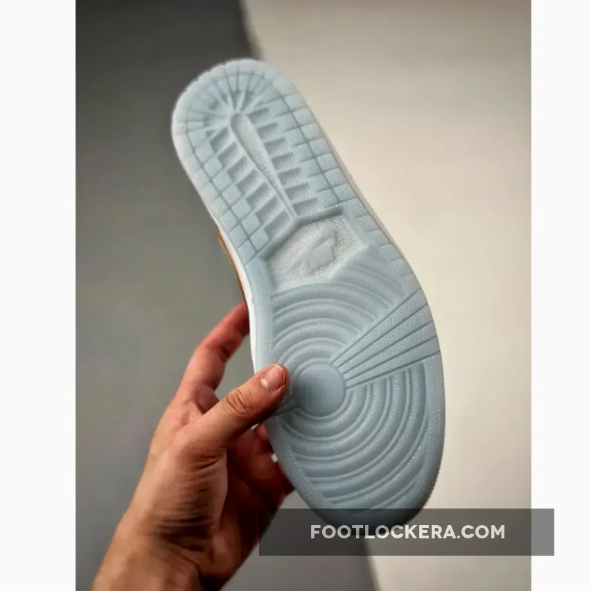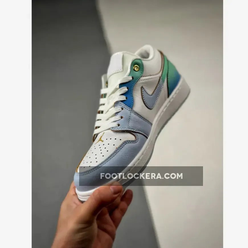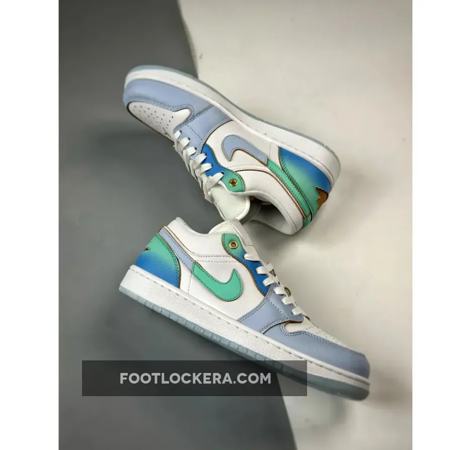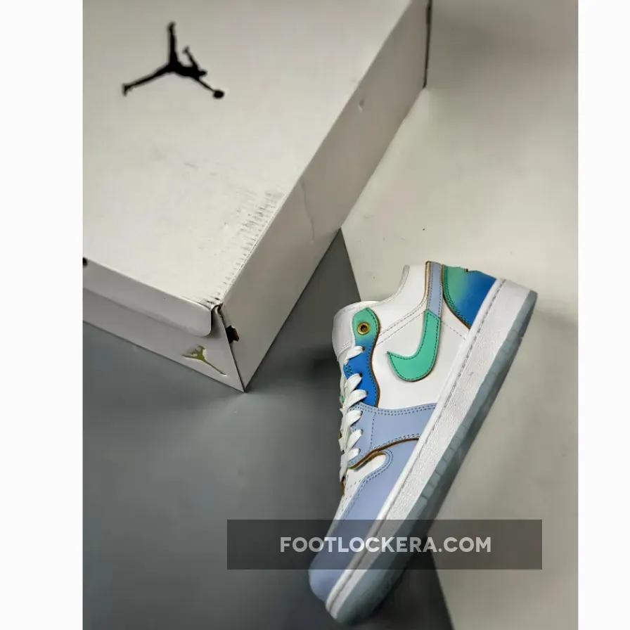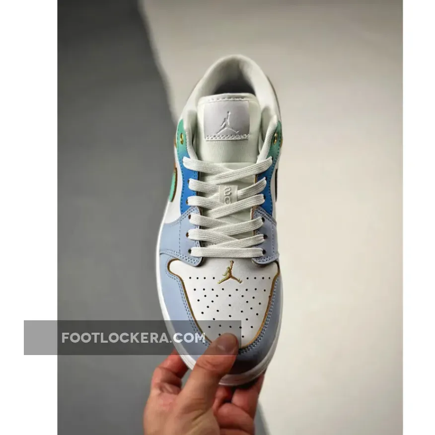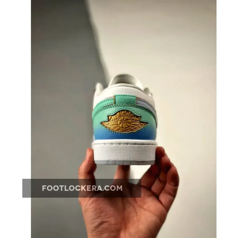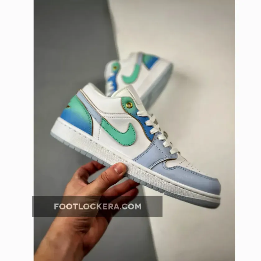 the Air Jordan 1 Low comes dressed in a White, Emerald Rise, Football Grey, Ice Blue, and University Blue color scheme. The sneaker blends smooth and tumbled leather materials, along with mesh tongues and a soft sockliner. The base has a “White” leather exterior paired with tumbled leather overlays. The eyestay and heel counter are painted with a gradient finish that fade from turquoise to mint. Finishing details include a Gold Jumpman logo on the vamp, a Wings logo on the heel, a White midsole and icy translucent outsole.