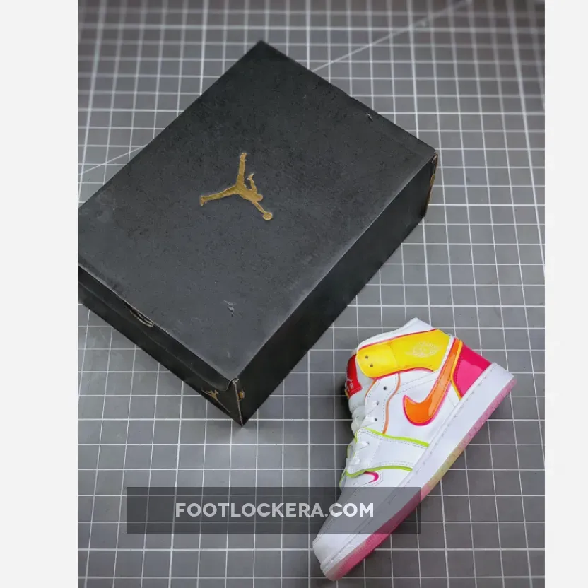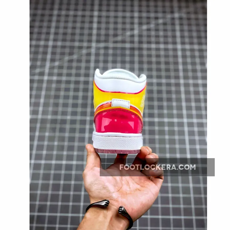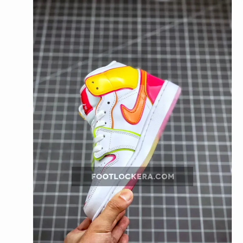 Made for big kids, the Air Jordan 1 Mid SE GS ‘Edge Glow’ enlivens the classic silhouette with fluorescent pops of color. In addition to highlighter piping, the white leather upper is contrasted by glossy coated overlays in contrasting orange and fuchsia hues at the collar and heel. Pink trim outlines the shiny orange Swoosh, while a matching pink Jumpman tag adorns the nylon tongue. The mid-top rides on a white rubber midsole, reinforced underfoot by a two-tone translucent rubber outsole.