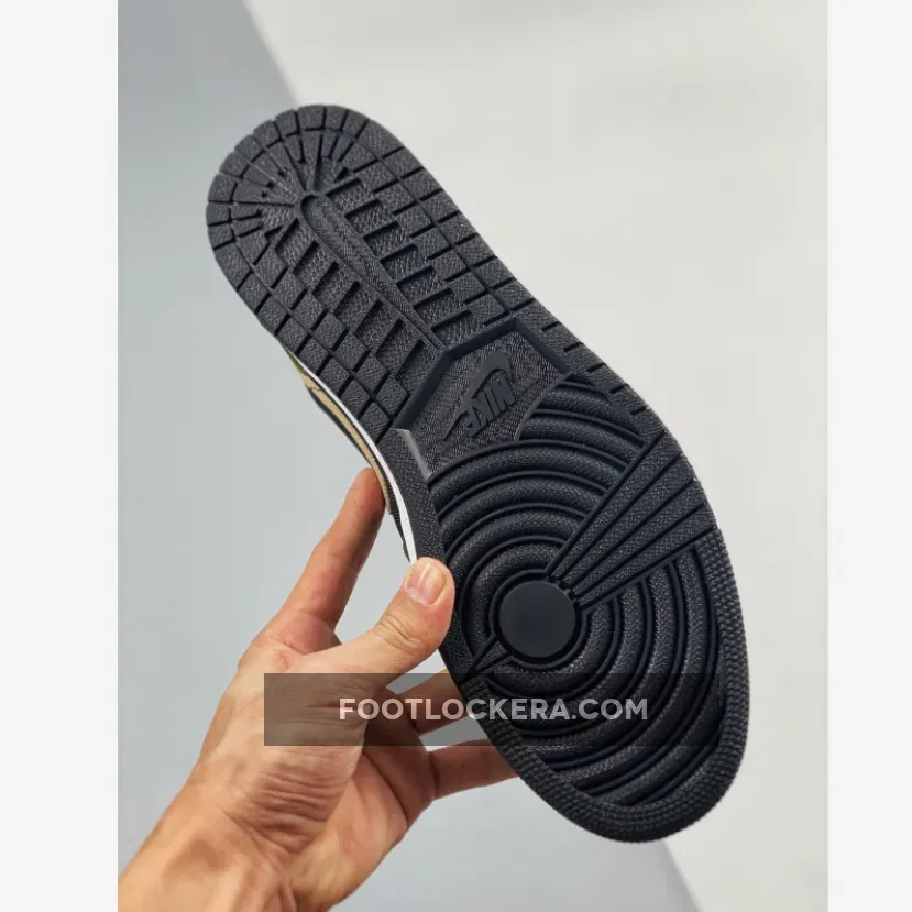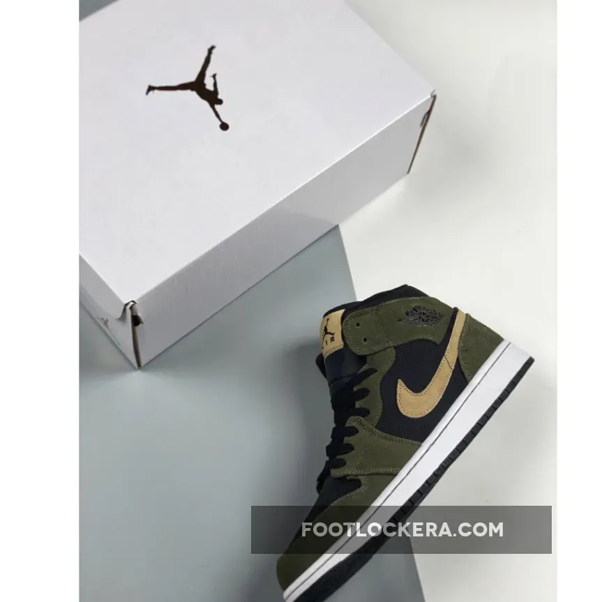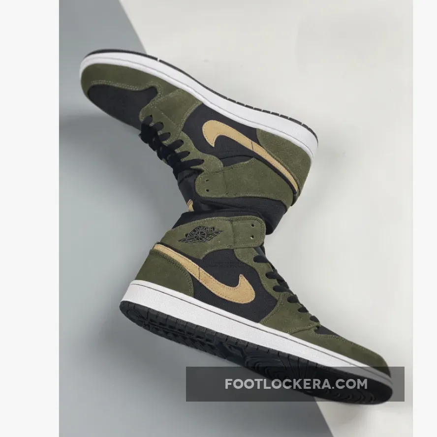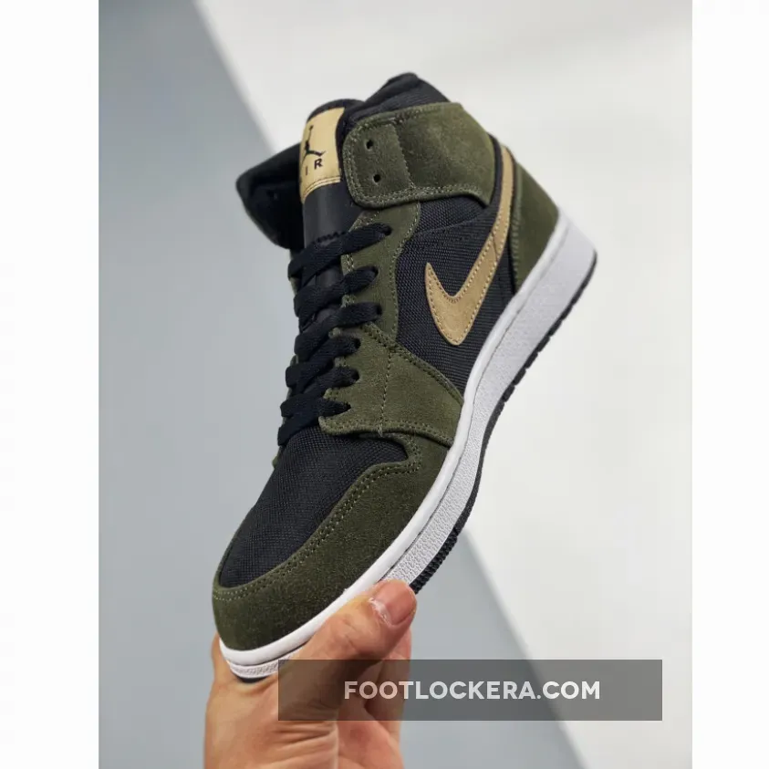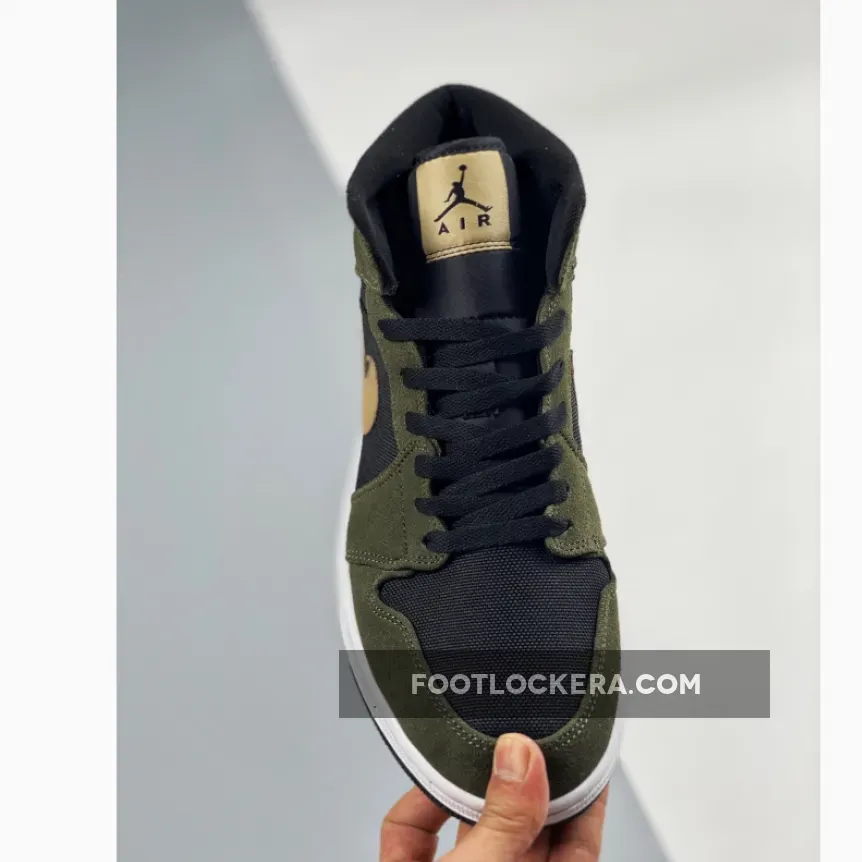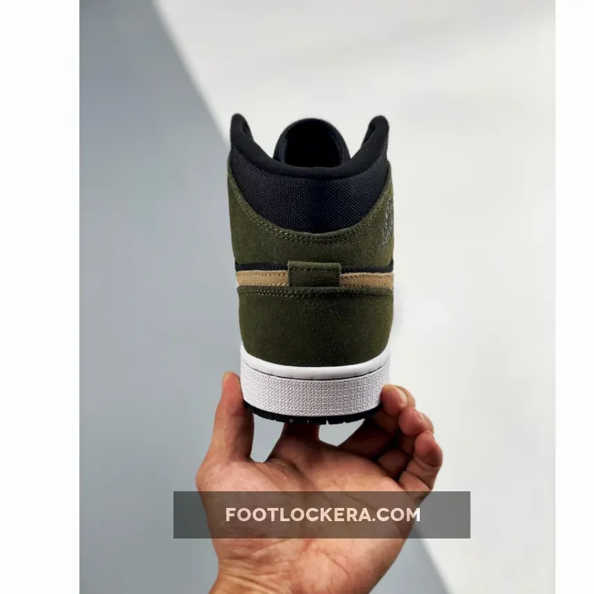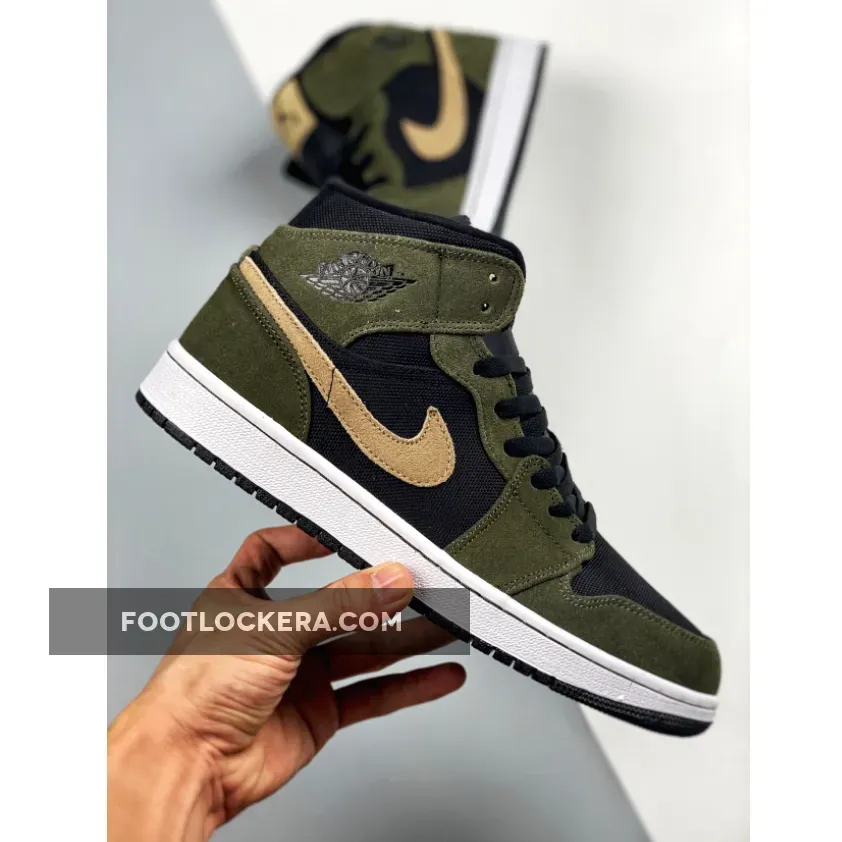 This offering of the mid-top Air Jordan 1 features a Black ballistic mesh upper with Olive suede overlays. A Khaki-colored suede Swoosh on the sides atop a White midsole and Olive Green rubber outsole completes the design.