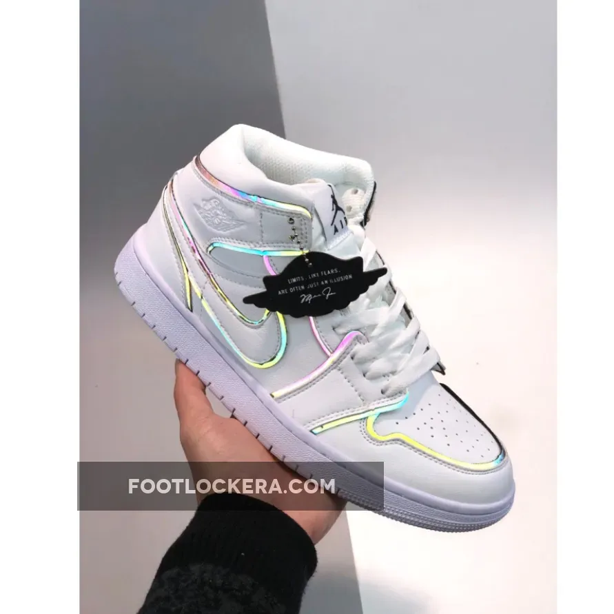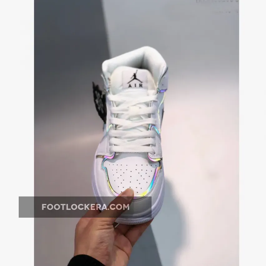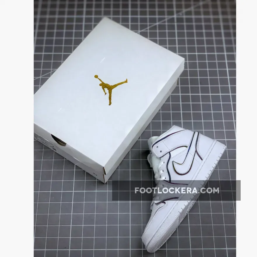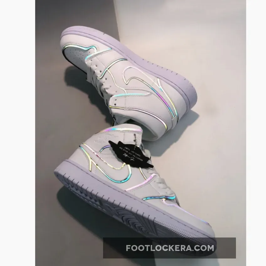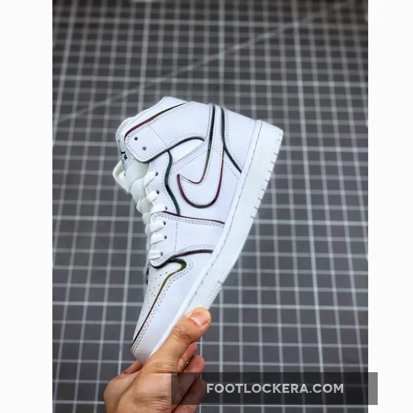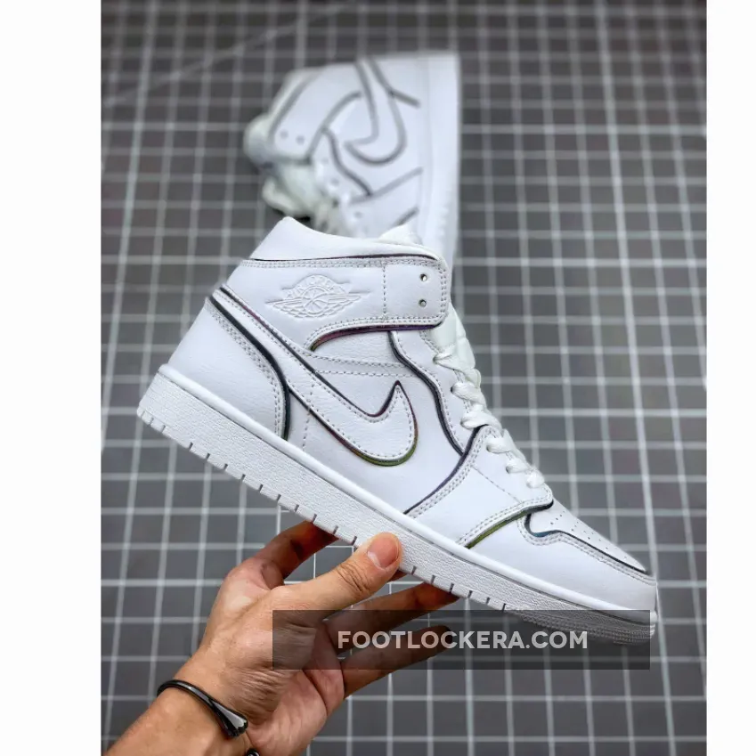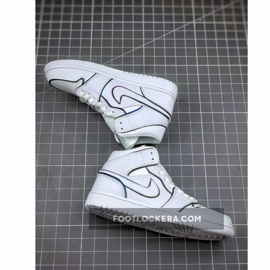 Clean & classic! Air Jordan 1 Mid ‘Iridescent Reflective’ offers a sleek white leather upper with reflective trimming for a cool, eye-catching look. Quality feels solid & comfortable, with breathable perforation & Air cushioning. Perfect for daily wear or casual style! #AJ1 #Sneakers #Reflective #Women #White #Comfort #Style