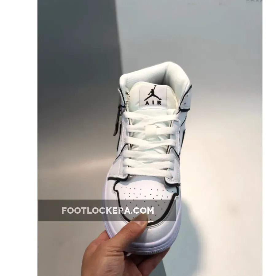 this mid-top Air Jordan 1 features White leather on the upper while perforations land on the toe. In addition we have tonal Wings logo on the ankle while Black trimming is used throughout, similar to the Bloodline release. However that trimming is 3M Reflective and will feature bright iridescent colors.