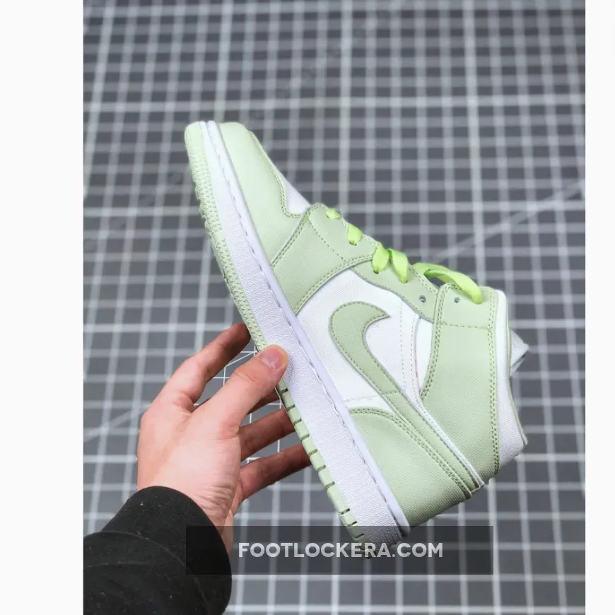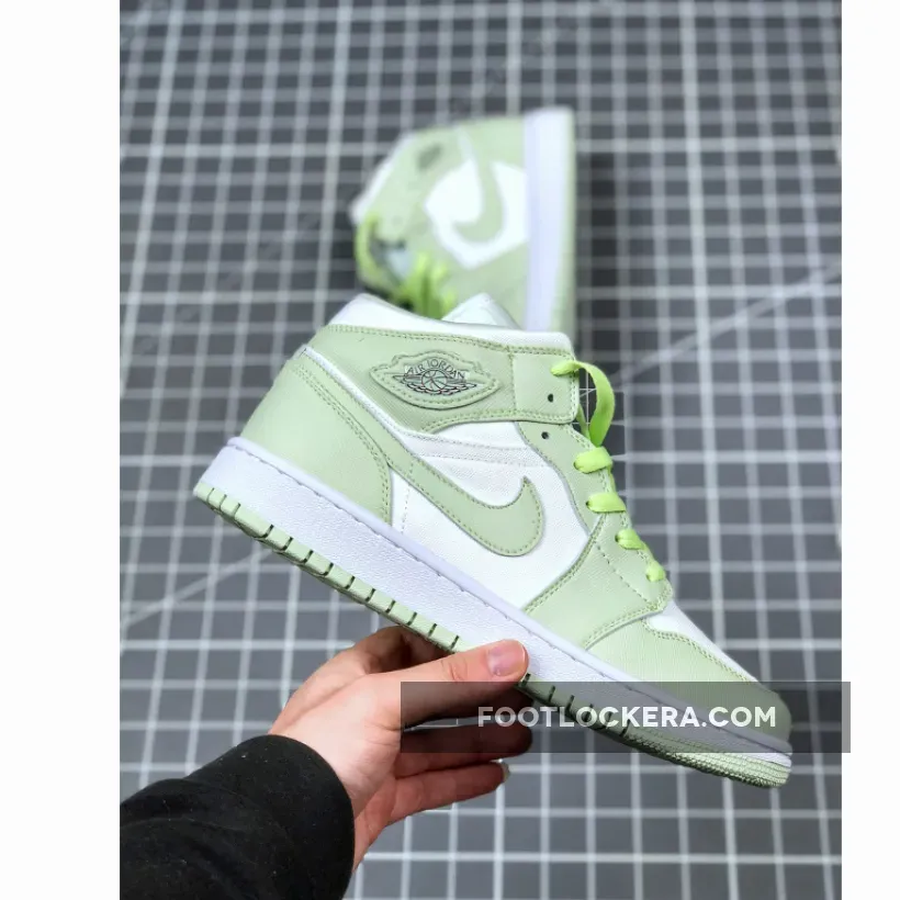 And while not as experimental as aforementioned takes, this newly surfaced women’s iteration also employs an unconventional approach as it presents the Jordan 1 Mid in a far-from-OG color scheme and construction; Light greens and white divvy up toe boxes, lace guards, heel panels, and more, which all boast an atypical canvas twill construction. Branding across the upper gets both the “Spruce Aura” and fabric treatment, but the ball-and-wings insignia on the lateral ankle sports a slight fraying.