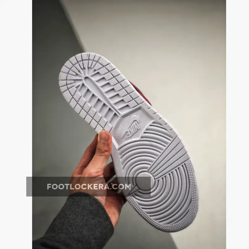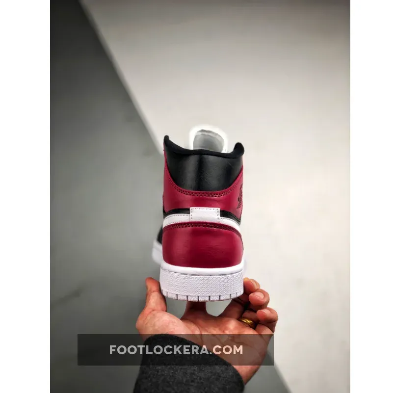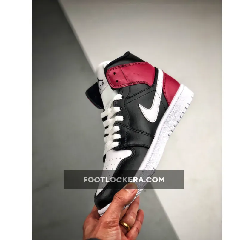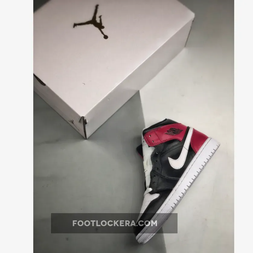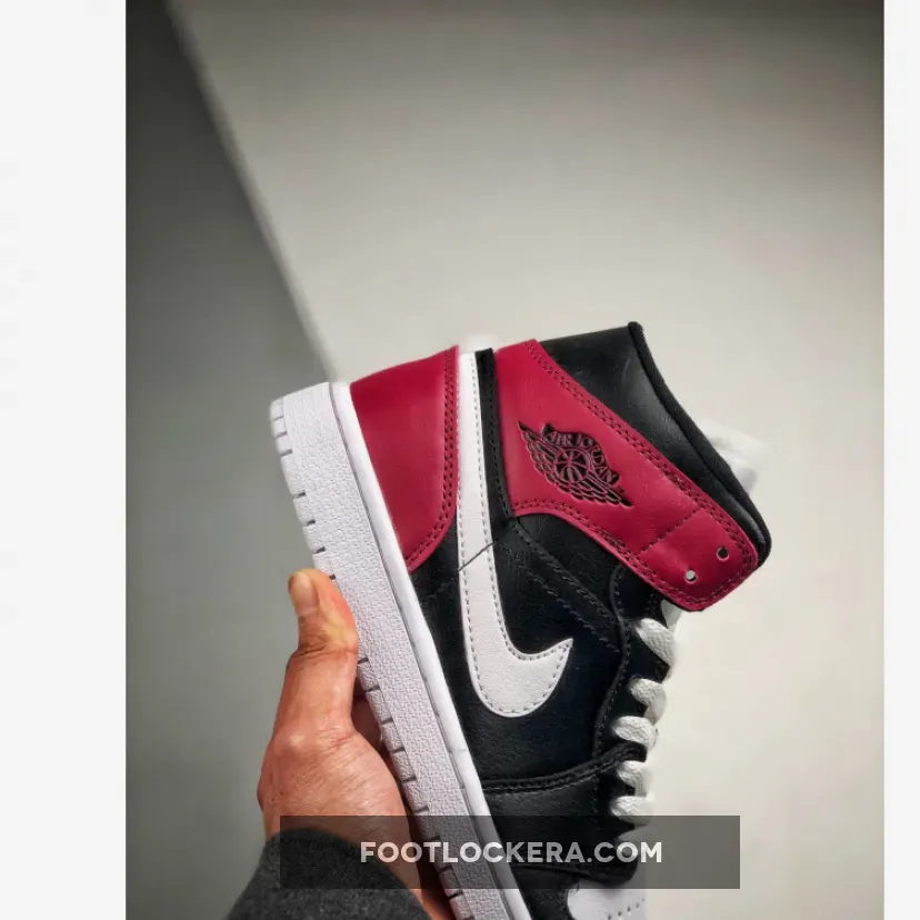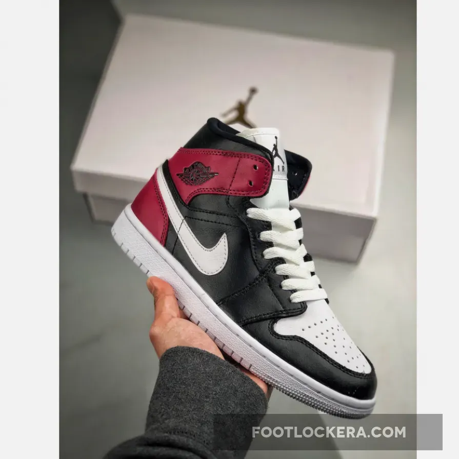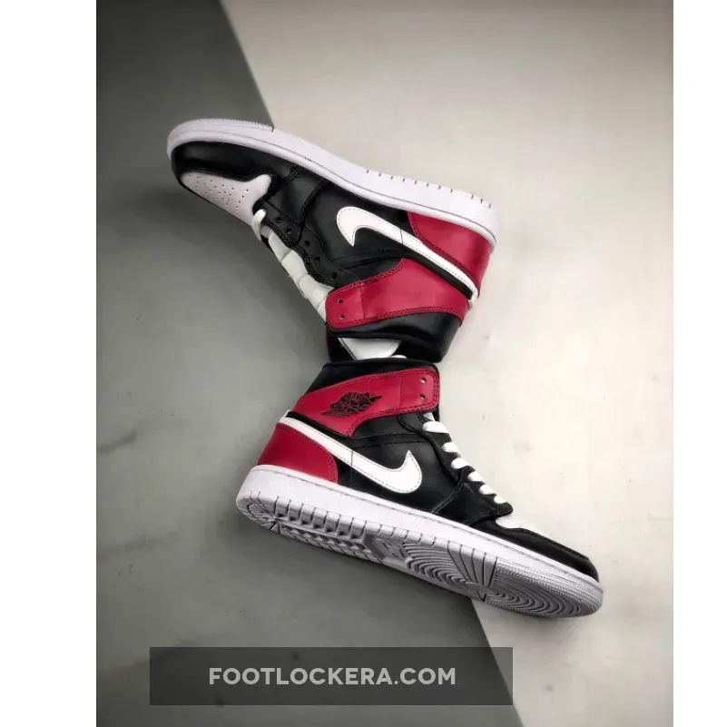 This offering of the mid-top Air Jordan 1 features White leather on the toe and Swoosh with Black leather overlays on the toe, side panels and upper collar. Noble Red is used around the heel completed with a solid White rubber sole.