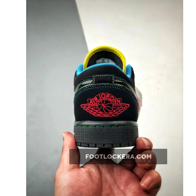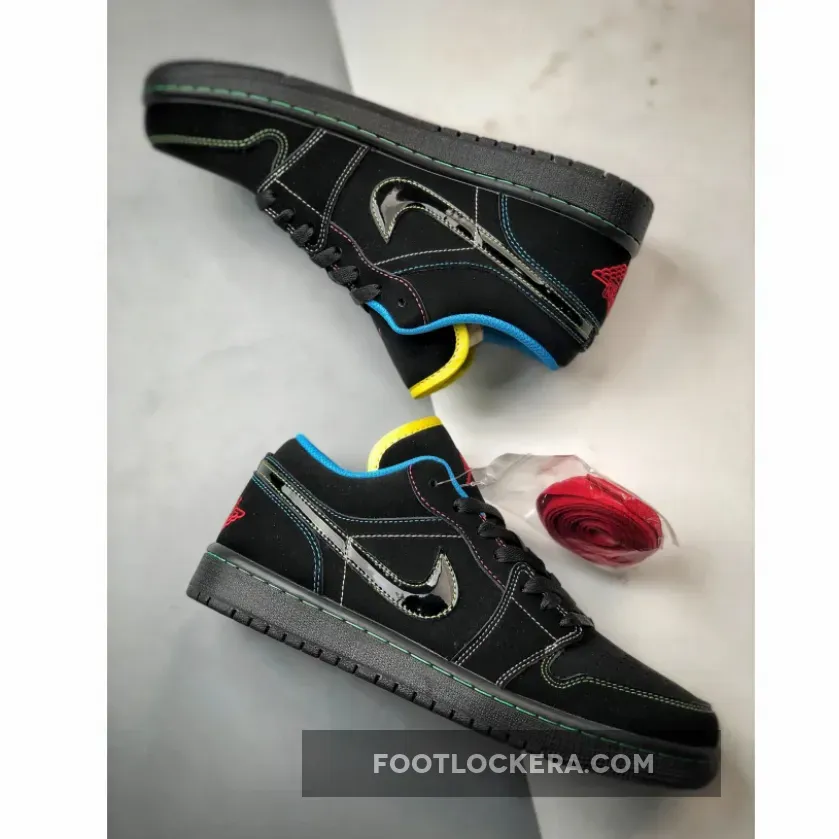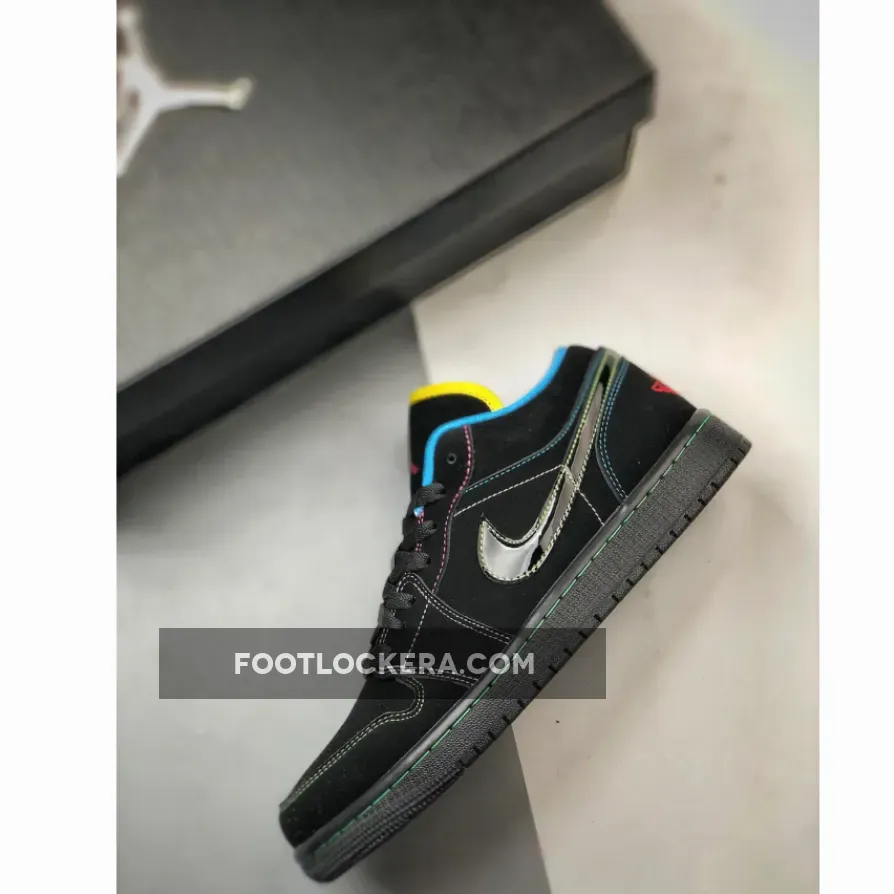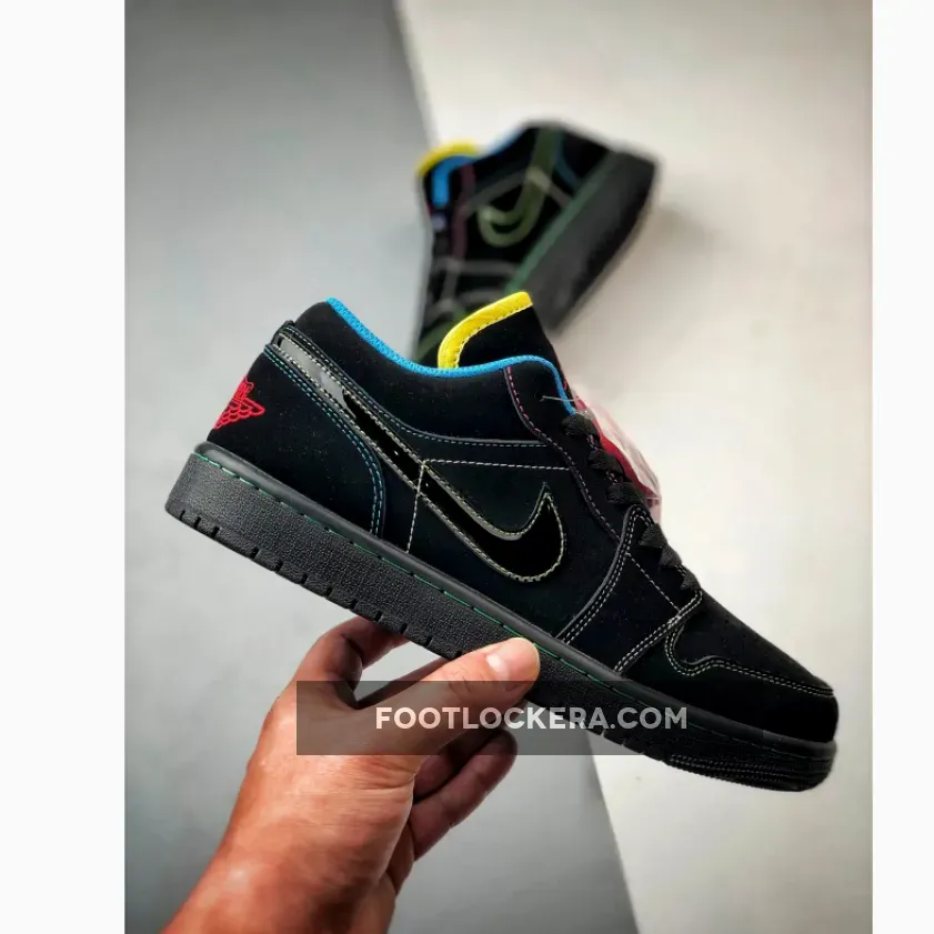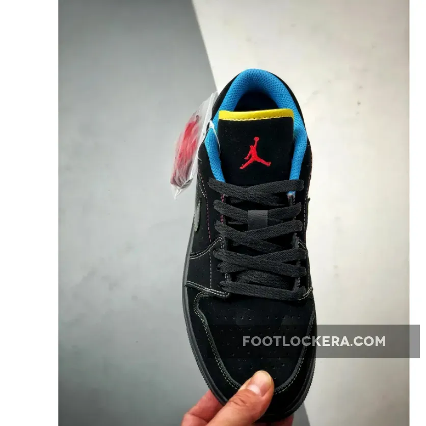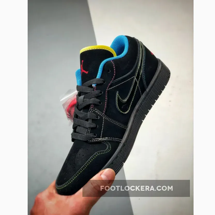 the Air Jordan 1 Phat Low in a black nubuck upper with a glossy faux-croc-skin swoosh and multi-colored contrast stitching.