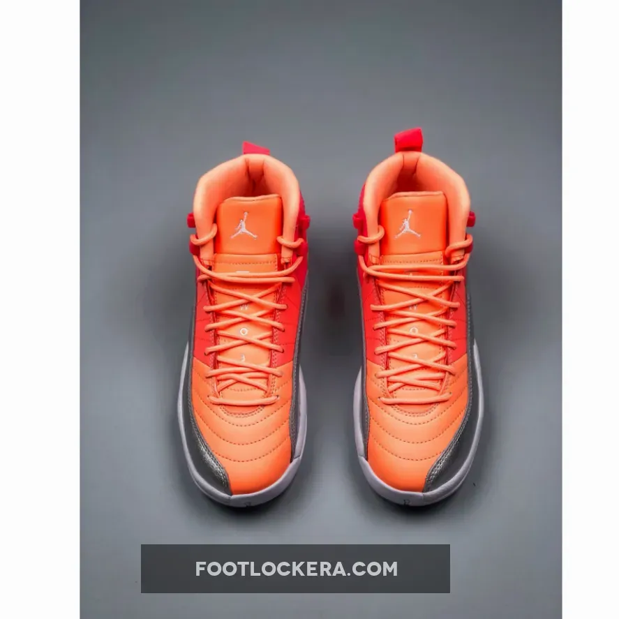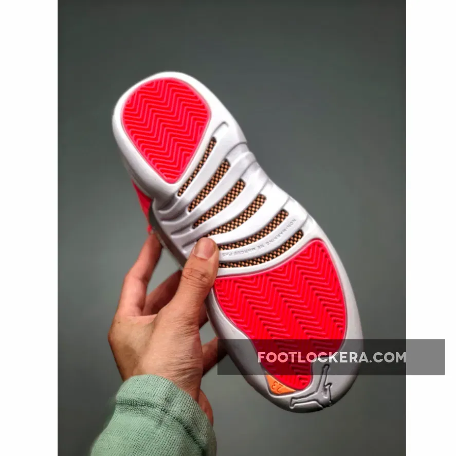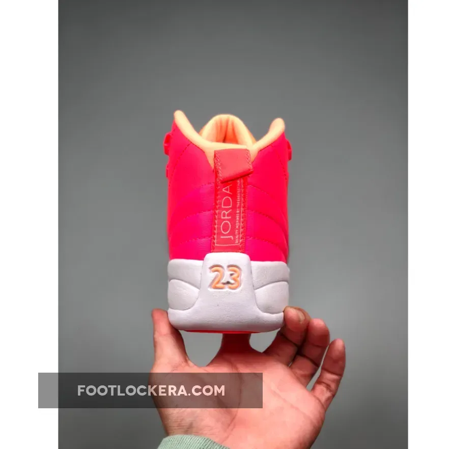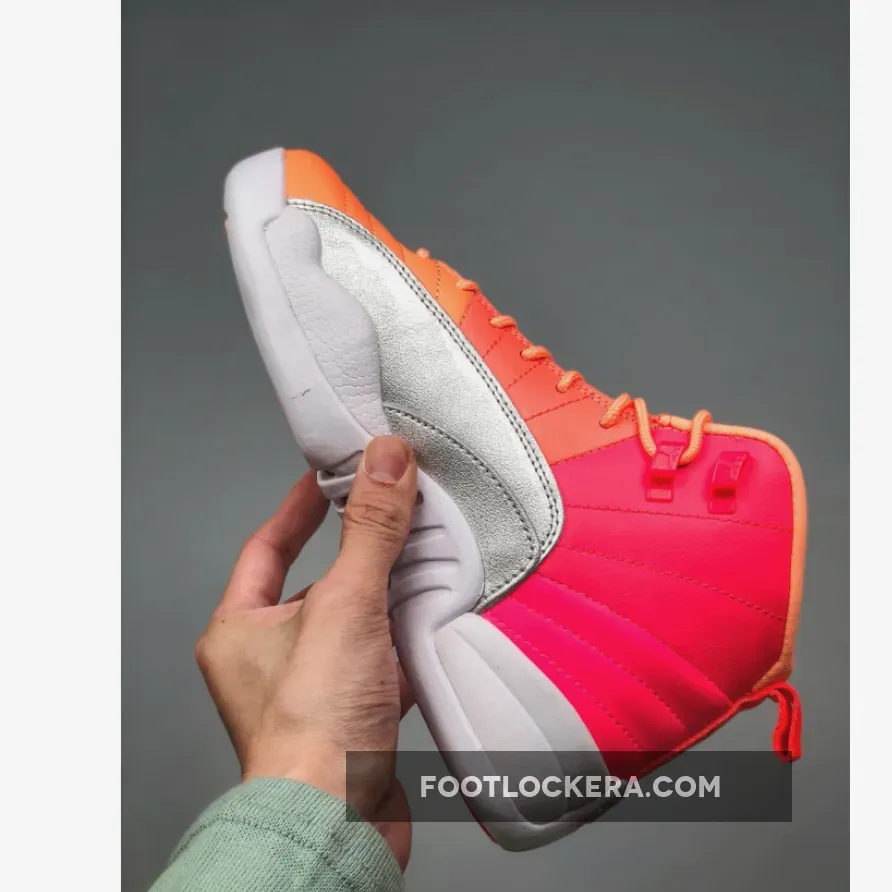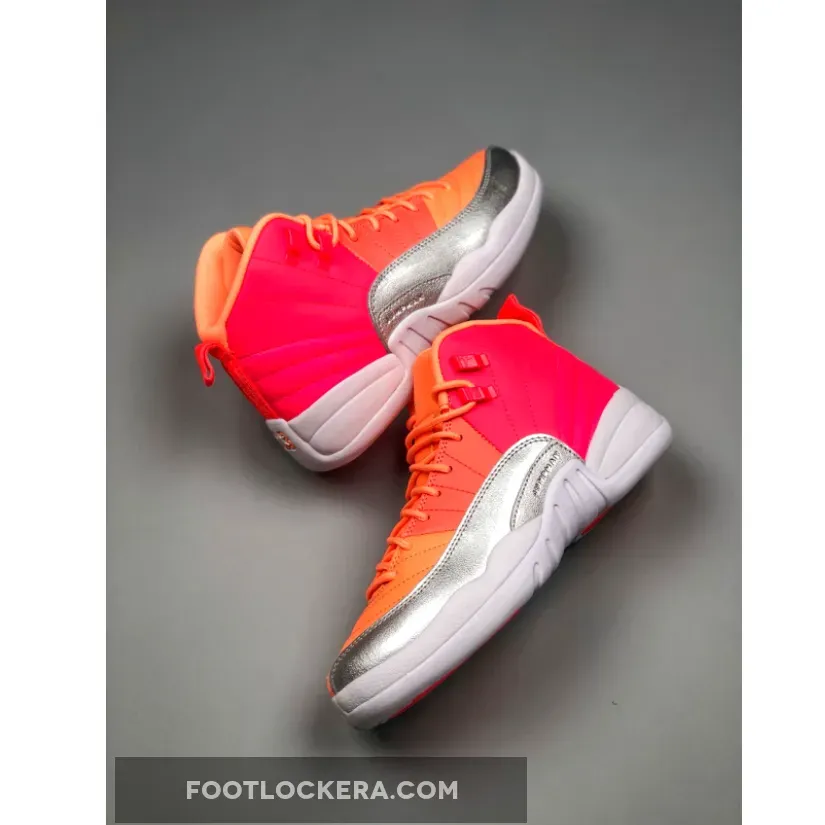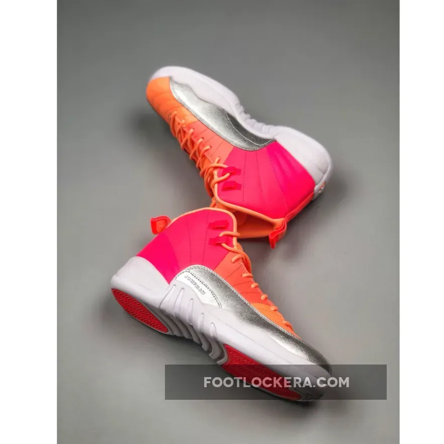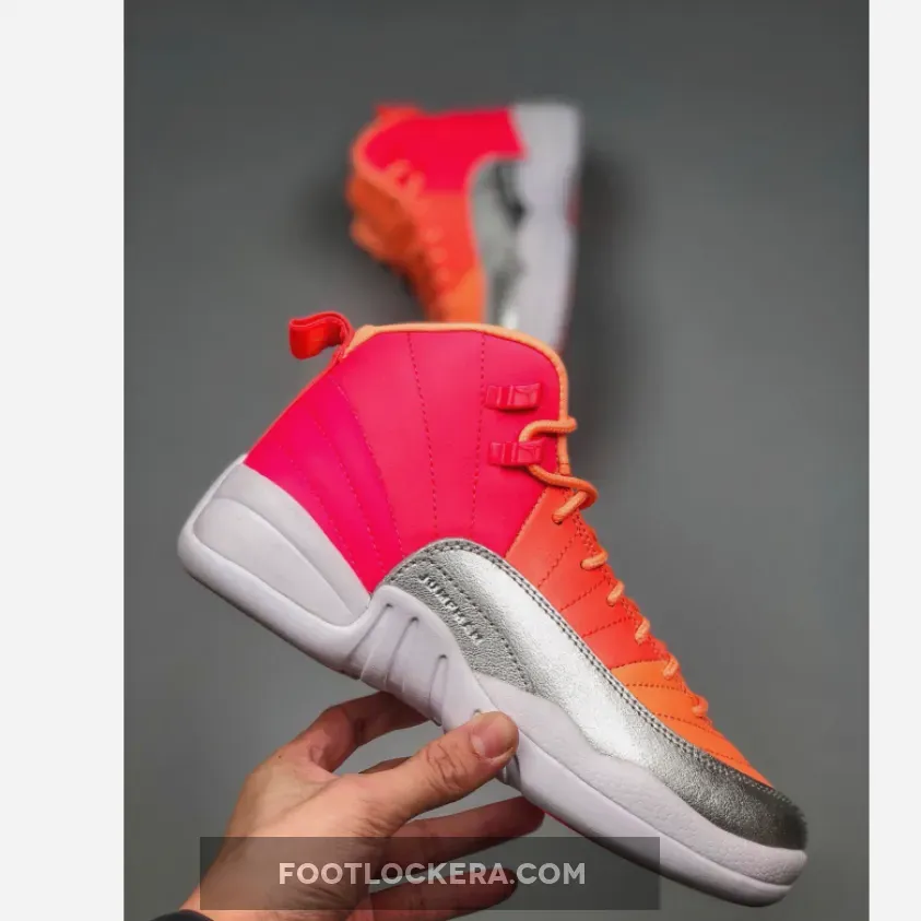 Dressed in a Racer Pink, Hot Punch, Bright Mango, and White color scheme. This Air Jordan 12 is highlighted with a tricolored upper in Orange, Punch, and Pink hues with Silver overlays.