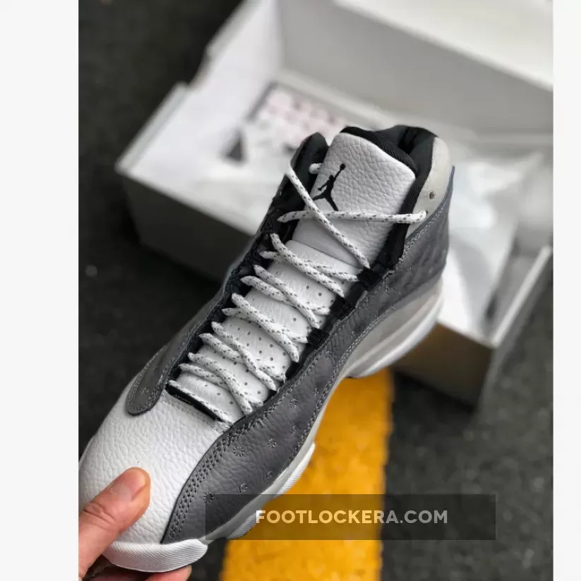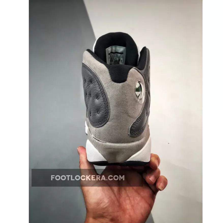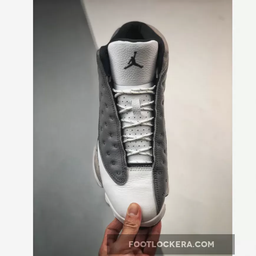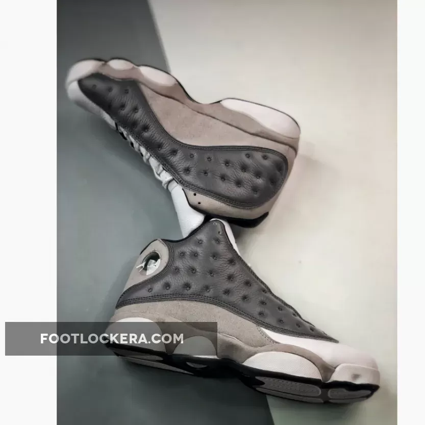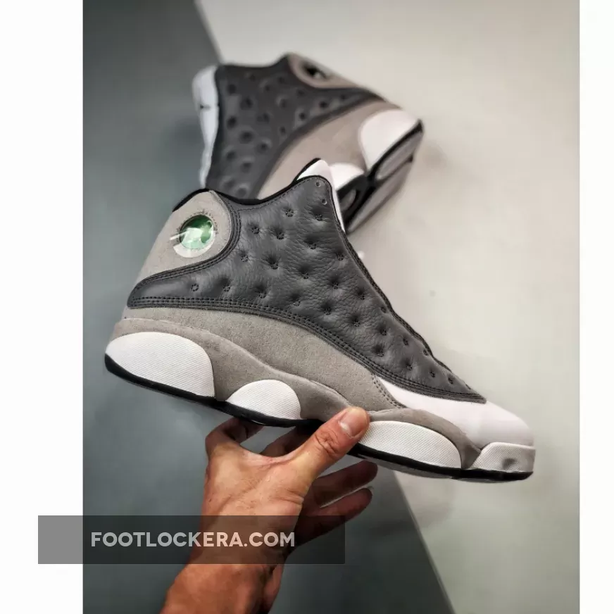 Dressed in a Atmosphere Grey, White, University Red and Black color scheme. This Air Jordan 13 features a Dark Grey leather upper with a lighter shade of Grey on the mudguard and riding up the heel. A White leather toe, Black lining, Red accents and the models signature hologram heel logo completes the design.