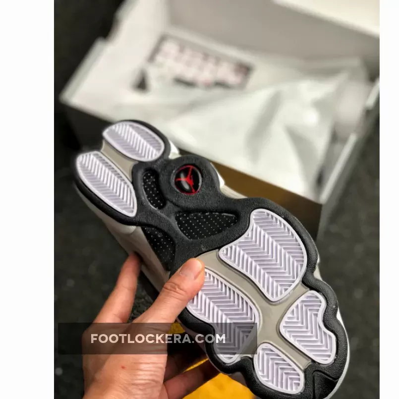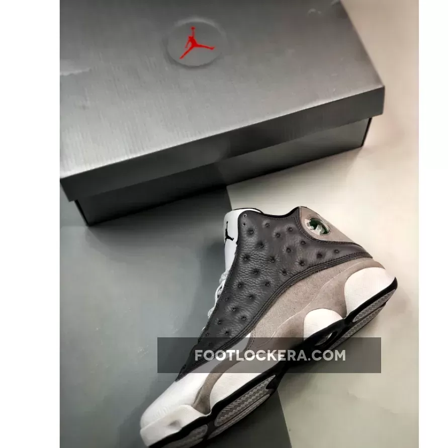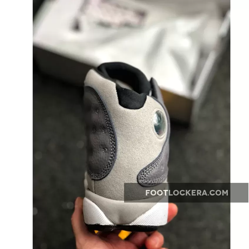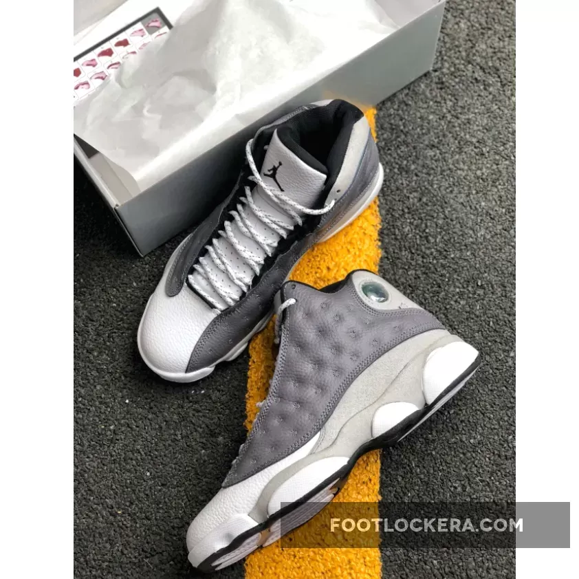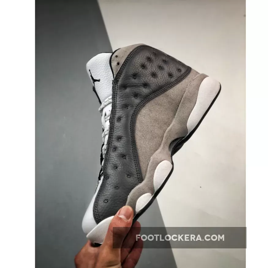 Dressed in a Atmosphere Grey, White, University Red and Black color scheme. This Air Jordan 13 features a Dark Grey leather upper with a lighter shade of Grey on the mudguard and riding up the heel. A White leather toe, Black lining, Red accents and the models signature hologram heel logo completes the design.