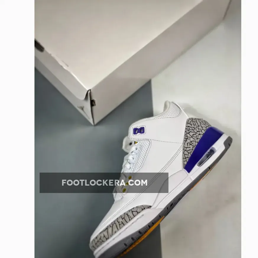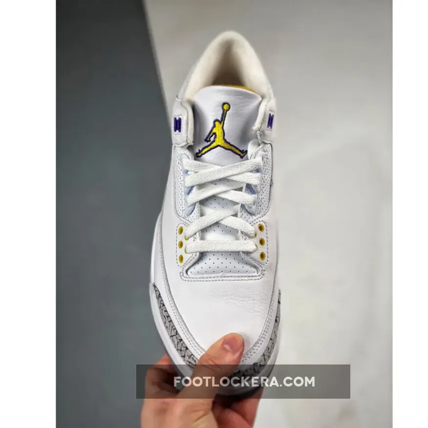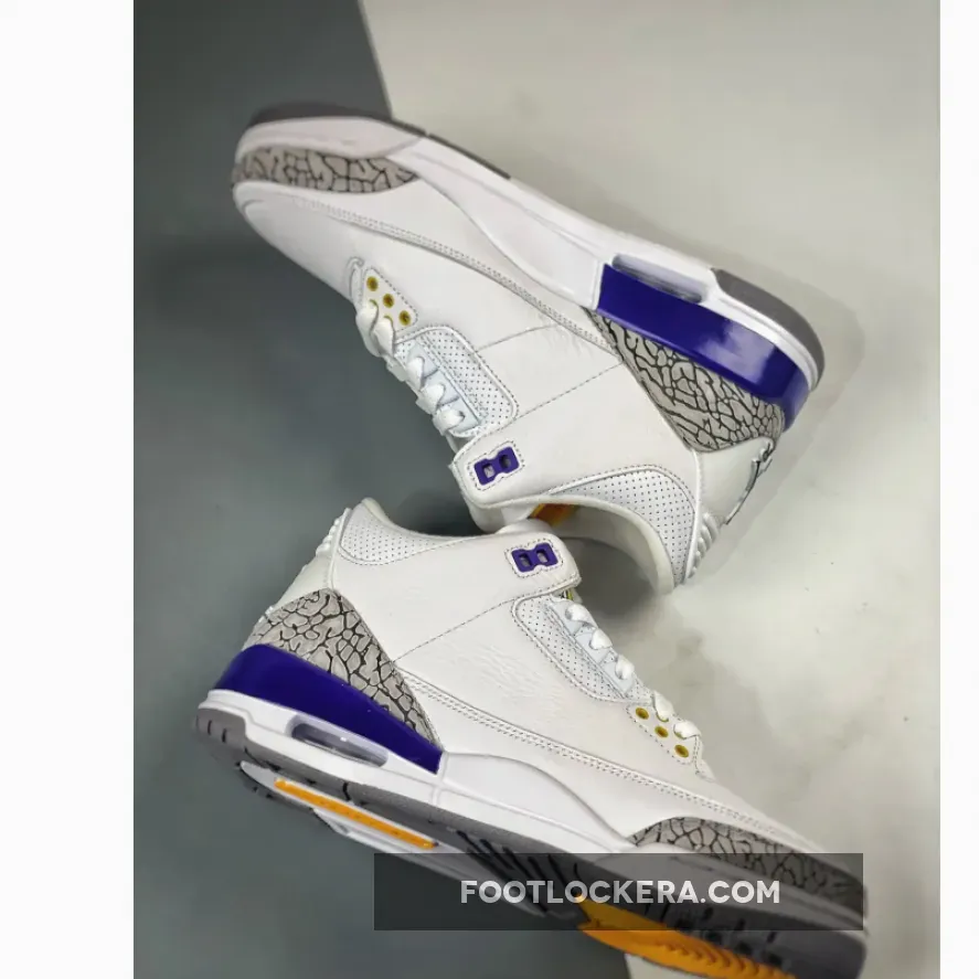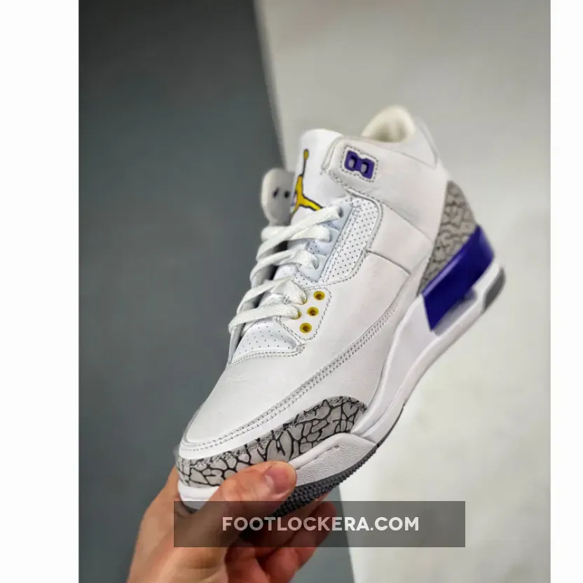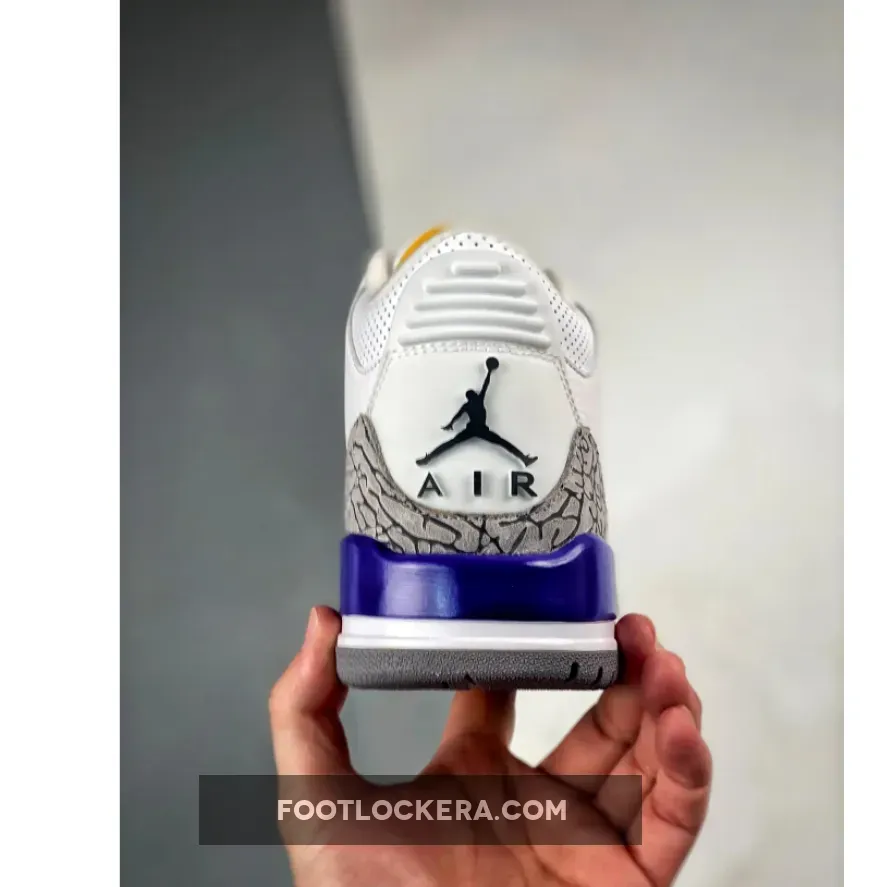 The pair comes with tradition white leather and cement elephant print, but Lakers gold and purple shades hit the heel, Jumpman branding, and lining.