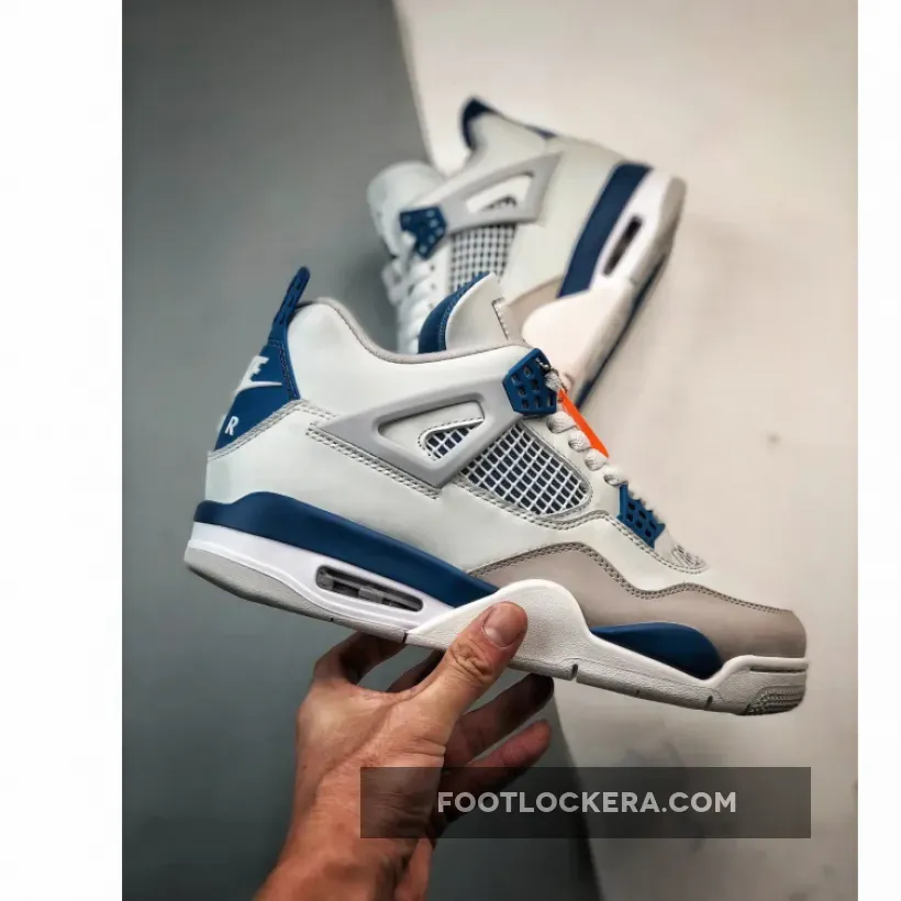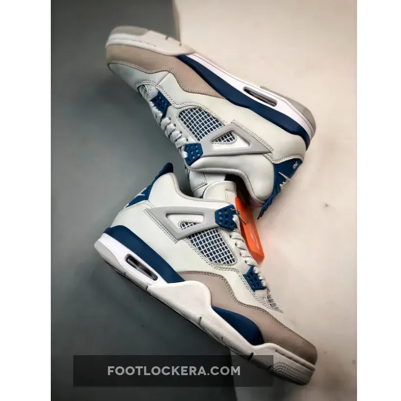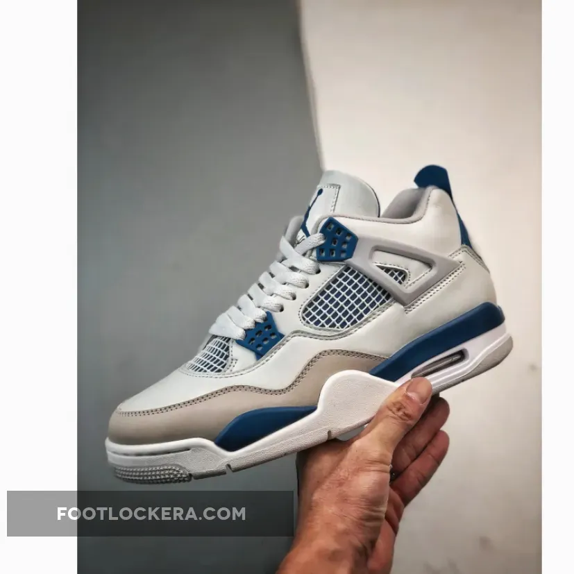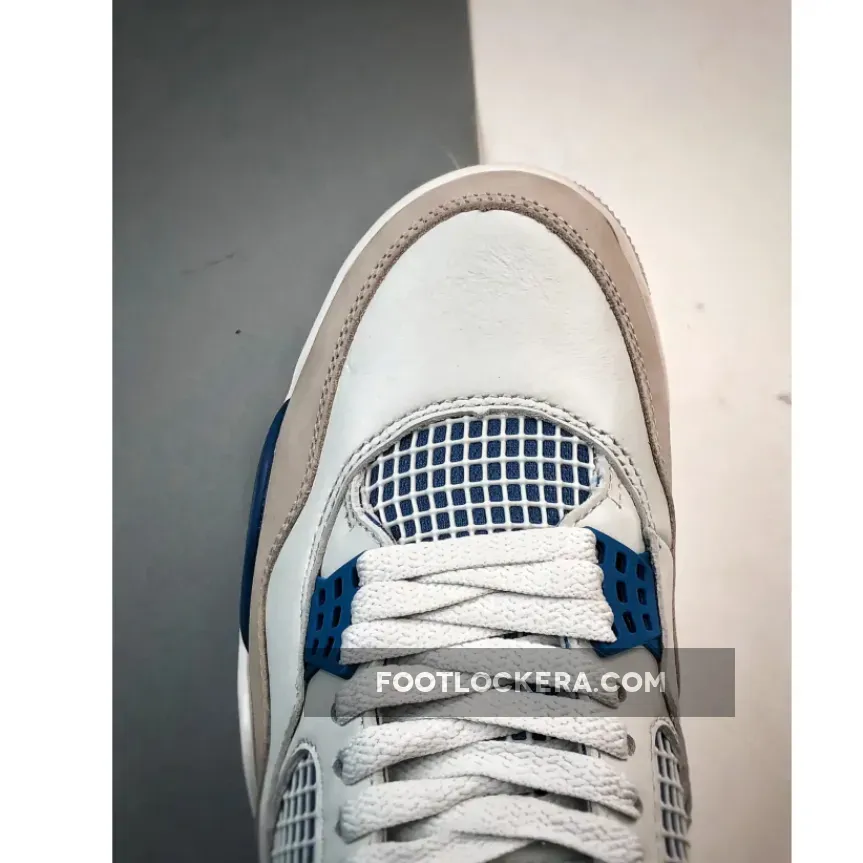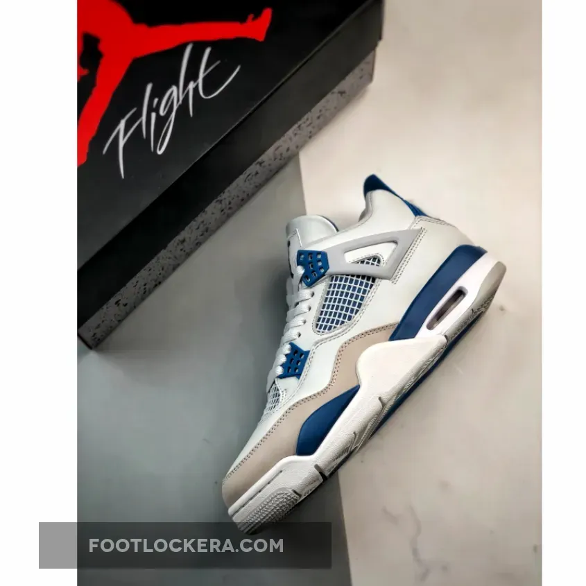 The Air Jordan 4 showcases a timeless color scheme consisting of Off-White, Military Blue, and Neutral Grey. Its upper is crafted from Off-White leather with overlays in Neutral Grey adorning the toe area. The quarter panel is equipped with a “Military Blue” underlay and topped off with the AJ4’s signature net. The design is elevated by Military Blue accents on the eyelets, midsole, heel tabs, and Jumpman logos on the tongues. Adding to the authenticity, the heels bear “Nike Air” branding in White, while a White, Blue, and Grey rubber outsole completes the overall aesthetic.