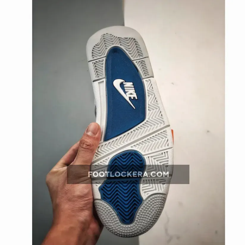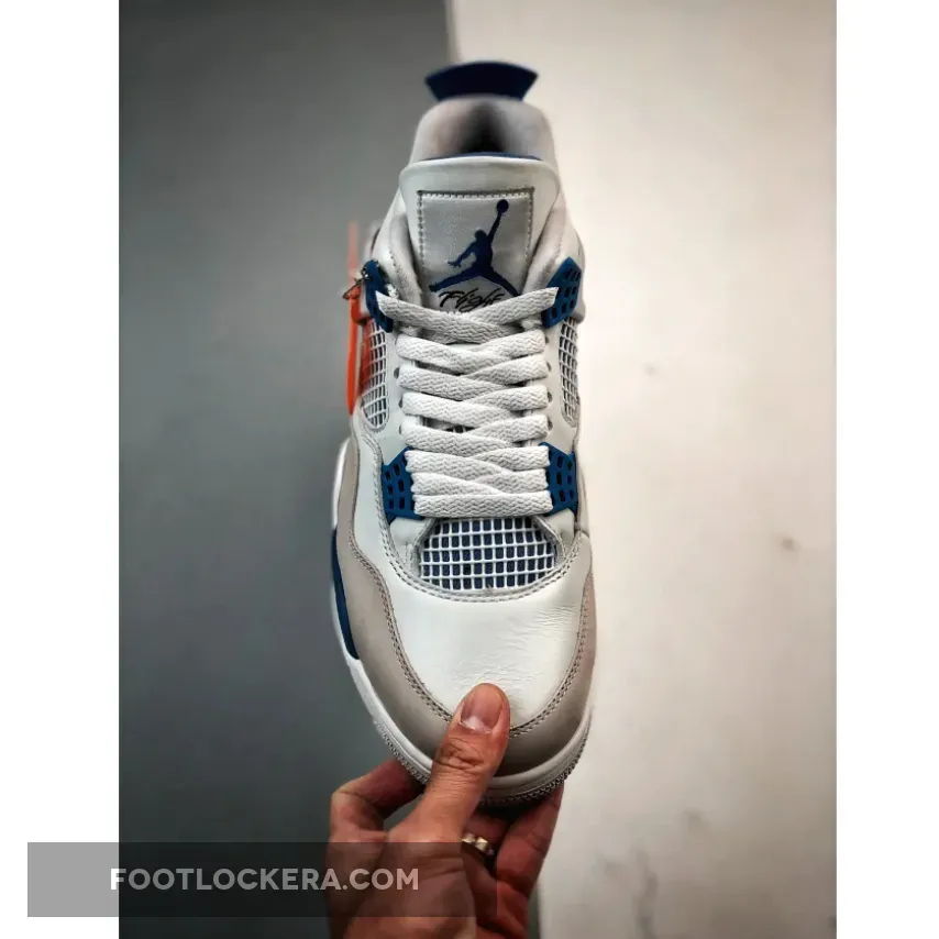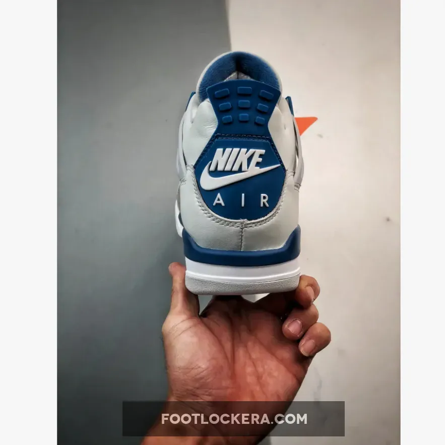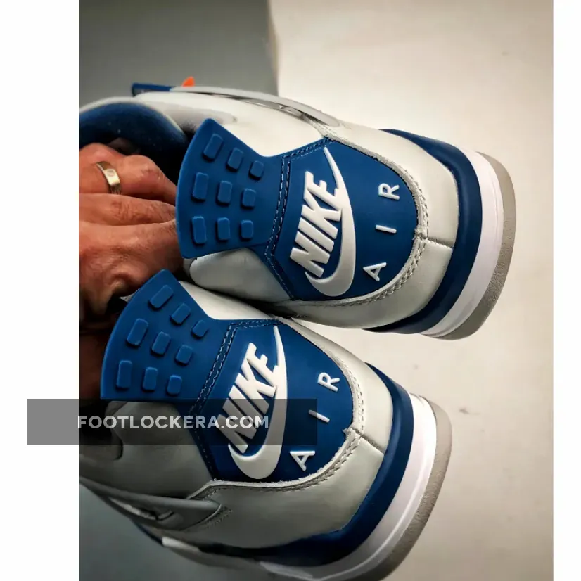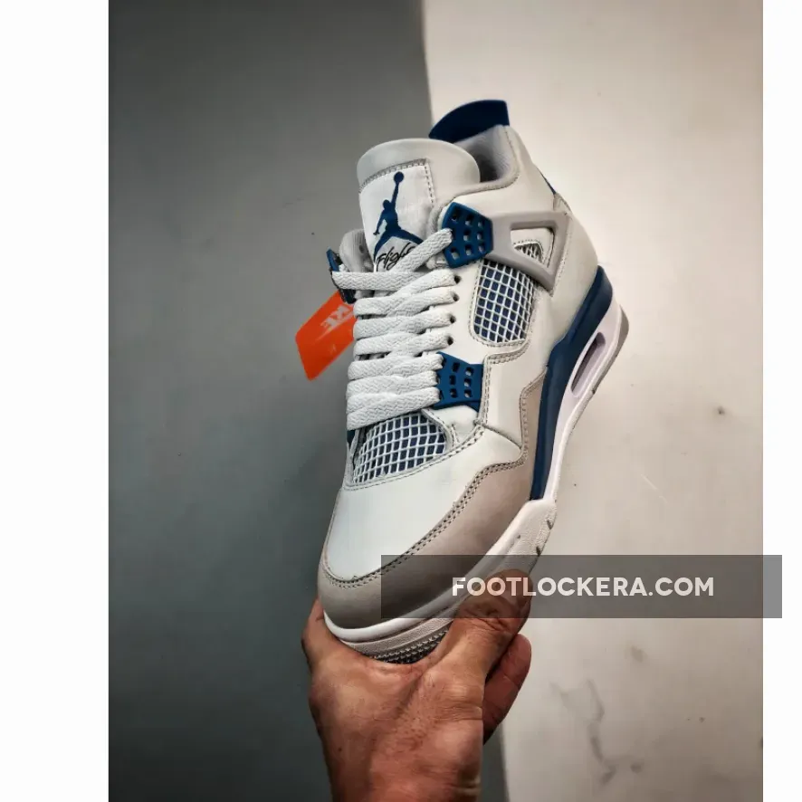 The Air Jordan 4 showcases a timeless color scheme consisting of Off-White, Military Blue, and Neutral Grey. Its upper is crafted from Off-White leather with overlays in Neutral Grey adorning the toe area. The quarter panel is equipped with a “Military Blue” underlay and topped off with the AJ4’s signature net. The design is elevated by Military Blue accents on the eyelets, midsole, heel tabs, and Jumpman logos on the tongues. Adding to the authenticity, the heels bear “Nike Air” branding in White, while a White, Blue, and Grey rubber outsole completes the overall aesthetic.