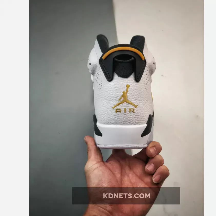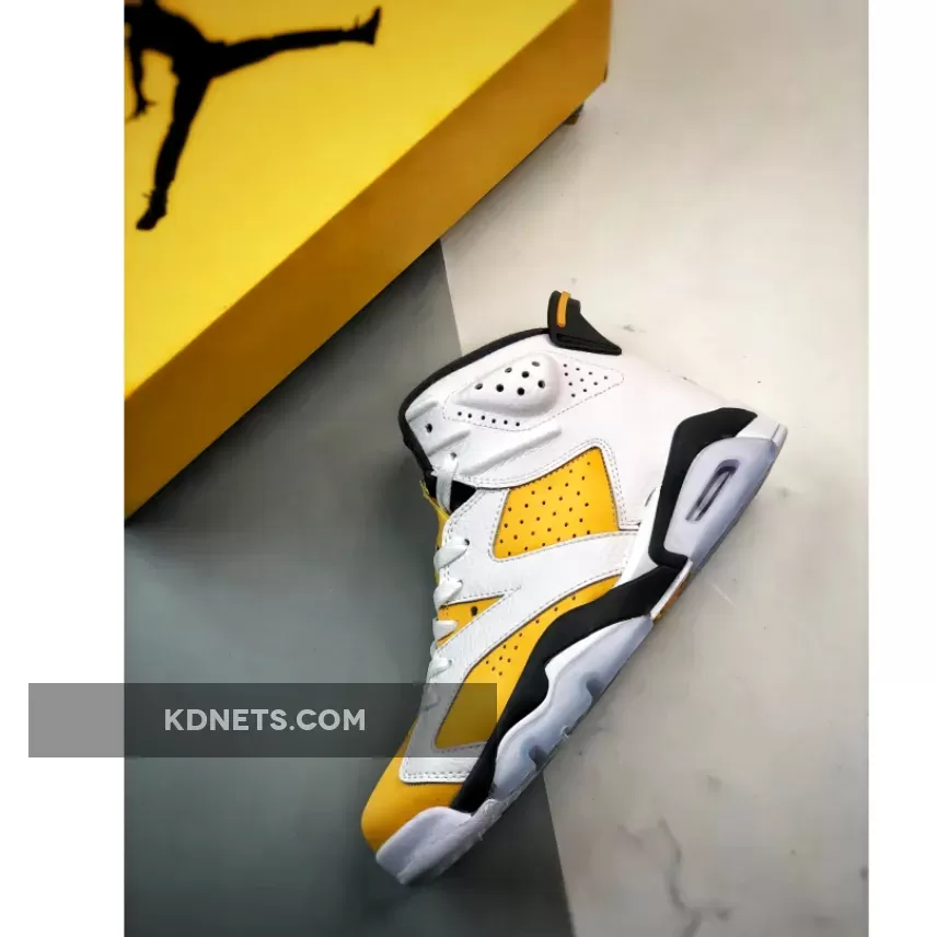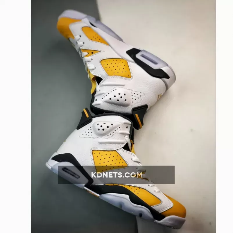 This Air Jordan 6 comes dressed in a White, Yellow Ochre, and Black color combination. The shoes could come in a ‘Carmine’-like theme. Utilizing White leather on the overlays, we have Yellow Ochre suede on the panels, toe box, hinted on the heel, lace locks, and tongue overlay.