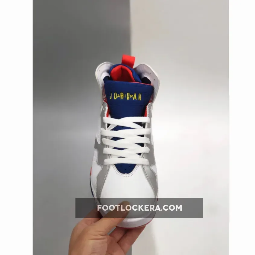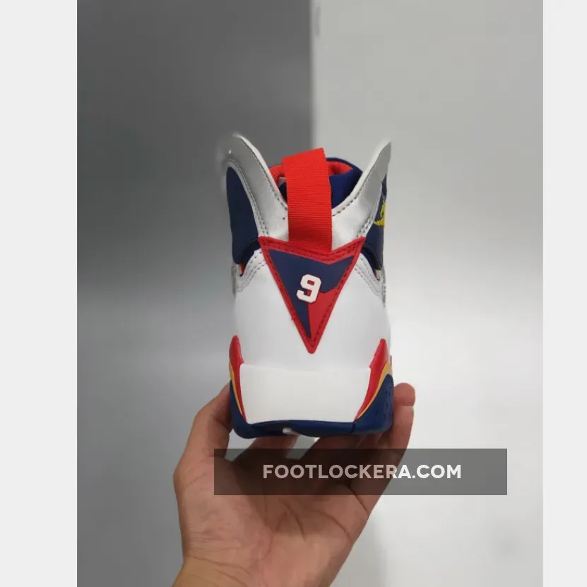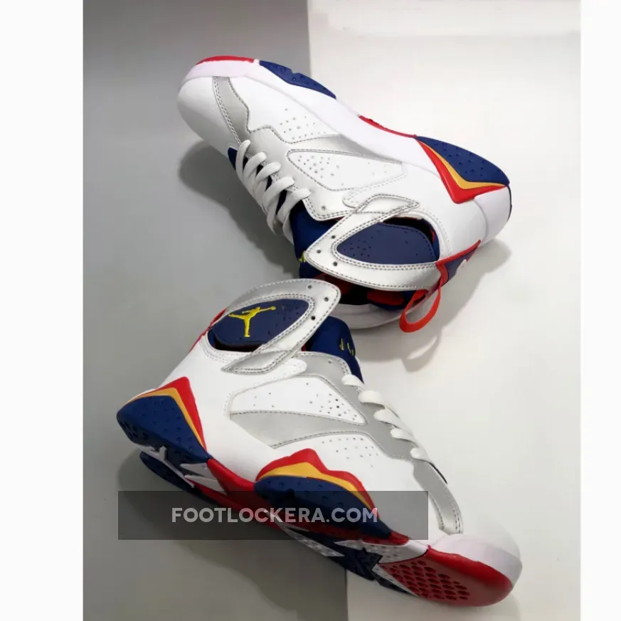 The Nike Air Jordan 7 Retro ‘Olympic’ 2012 is a retro re-release of the shoe worn by Michael Jordan en route to a gold medal with the Dream Team at the 1992 Olympic Games. The design features a white and metallic silver upper with Obsidian, metallic gold, and True Red accents. Released in July 2012, the sneaker also includes Jordan’s Olympic jersey number ‘9’ on the heel. Originally retro-released in 2004, the ‘Olympic’ also dropped in a 2016 ‘Tinker Alternate’ colorway combining a white/navy upper with a speckled midsole.