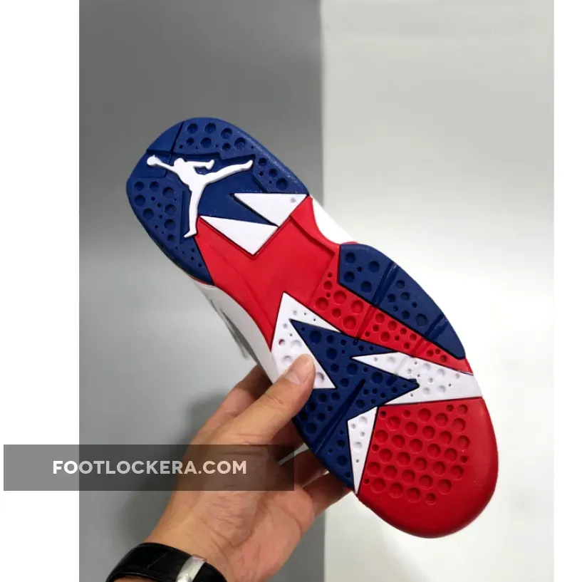 The Retro Olympic 2012 Air Jordan 7 showcases a color scheme of Obsidian, Team Red, and white with shiny gold accents on the logo and midsole. The unique inner bootie technology improves the shoes comfortable fit. It is equipped with Nike Air cushioning units in both the heel and forefoot for added support. Additionally, it incorporates a Dynamic Fit system that utilizes a molded plastic component around the ankle collar.