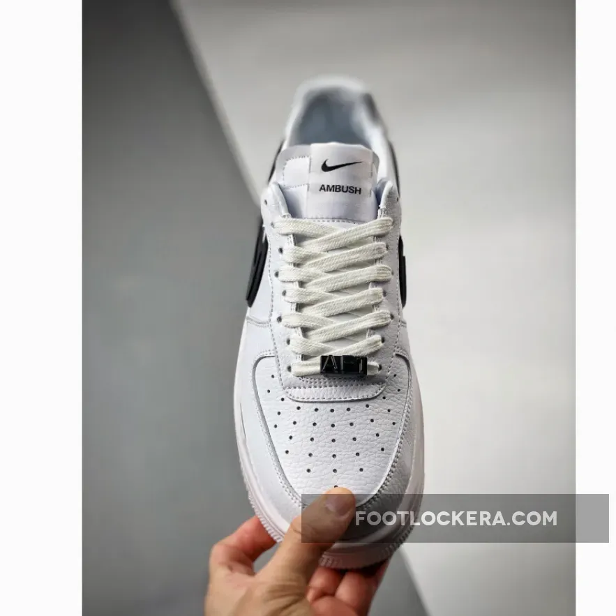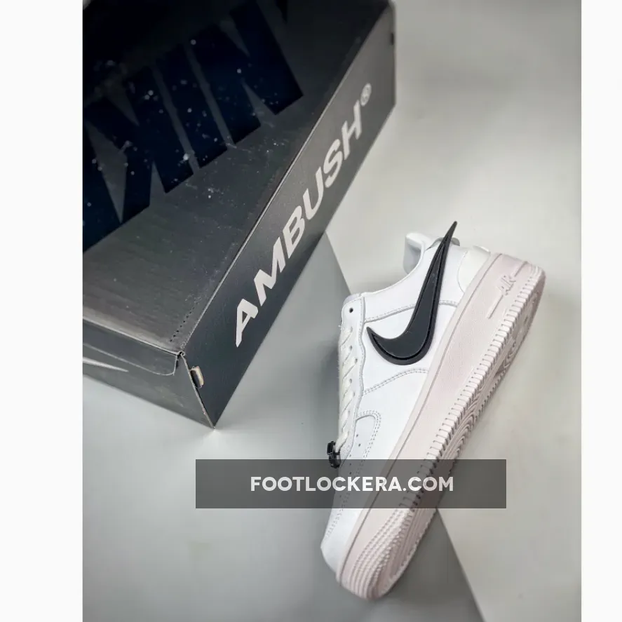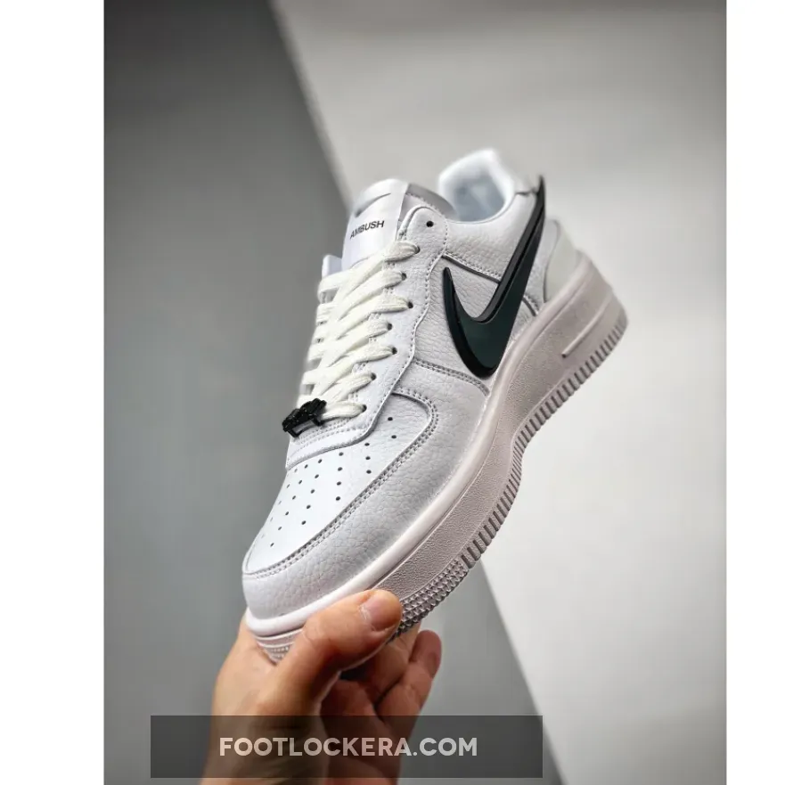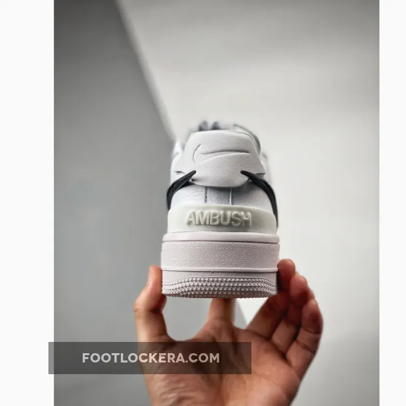 Ambush and Nike used an off-white Phantom colorway from top to bottom on their Air Force 1 collaboration. Nike used an oversized black swoosh that hangs off the heel, and black AMBUSH branding on the tongue, lace-locks, and insoles.
