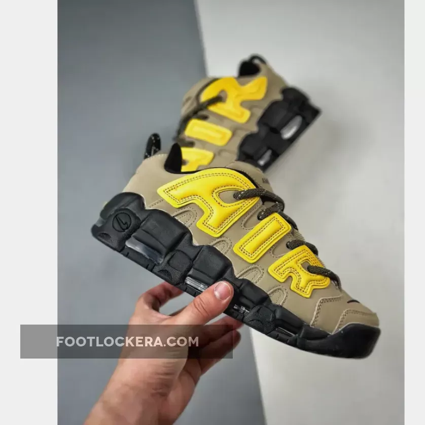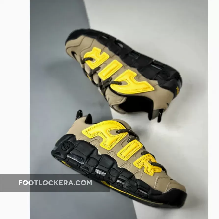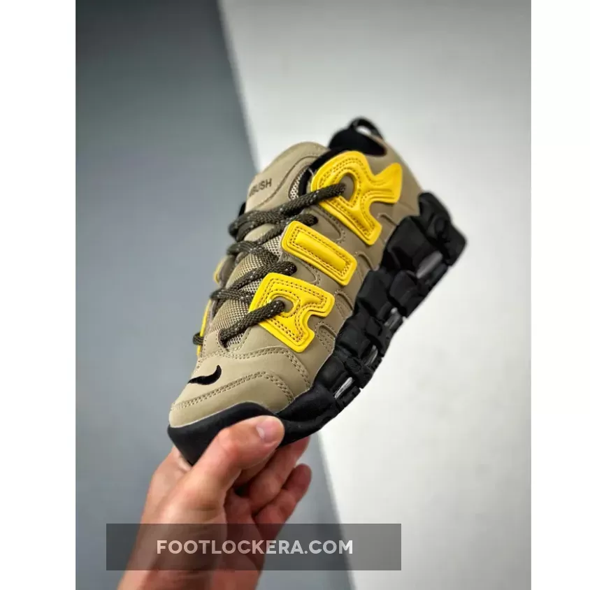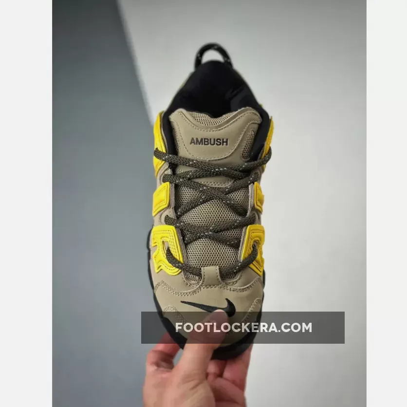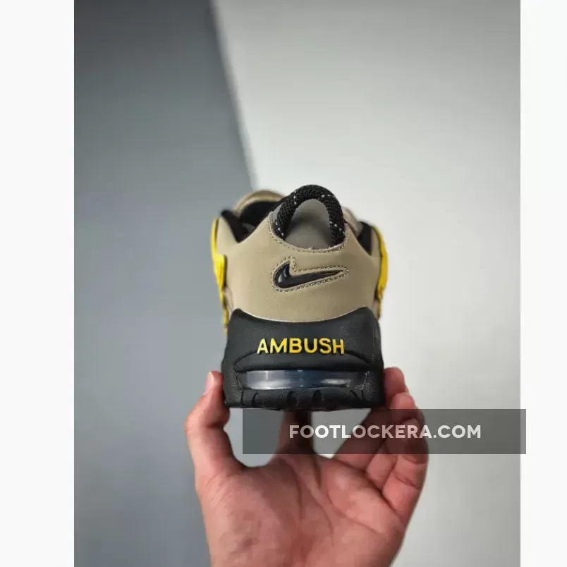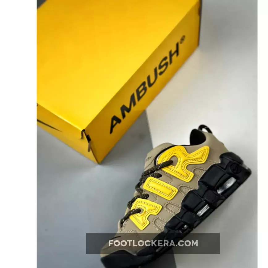 The Nike X Ambush Air More Uptempo Low ‘Limestoner’ features a Tan nubuck upper, Black embroidered mini Swoosh, and Yellow accents, creating a versatile look..