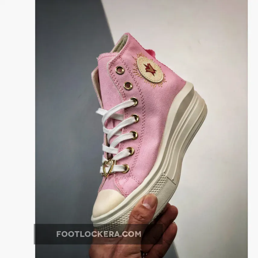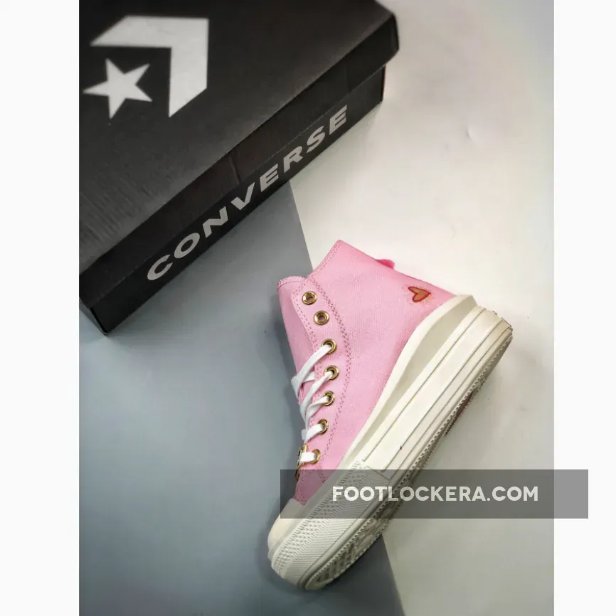 The Converse Chuck Taylor Move Platform High Hearts Pink will catch your eye with its adorable design. This high-top shoe is dressed in a durable baby pink canvas upper including the lightweight tongue and mini pull tab. It’s complemented with elegant metallic gold eyelets and a heart-shaped lace dubrae. The All-Star Chuck Taylor patch at the medial side is now designed with a pink and gold heart which matches the love-themed decor on the lateral side. Overall, a great pair for your dainty looks.