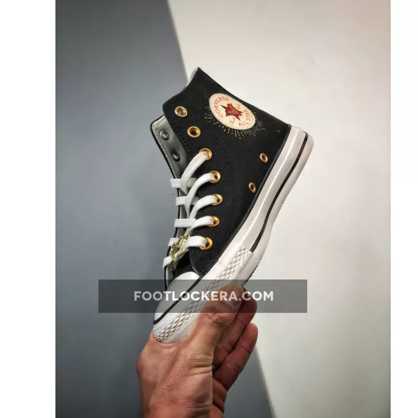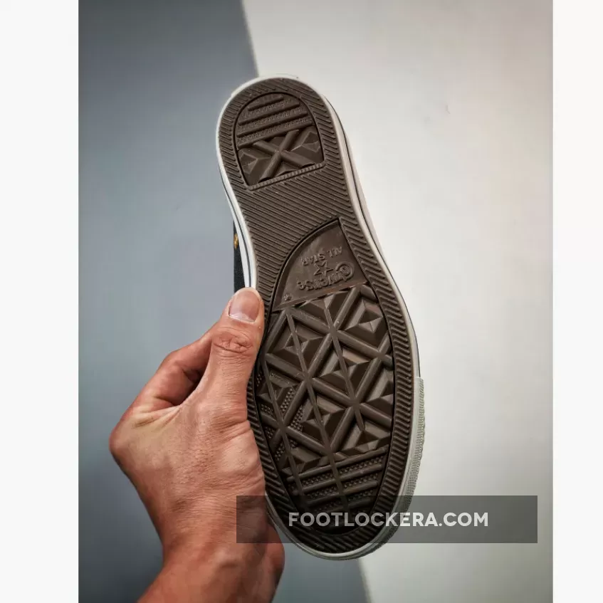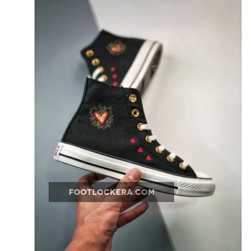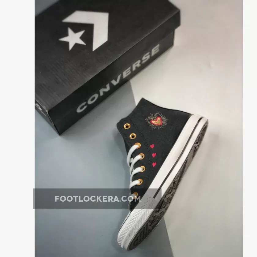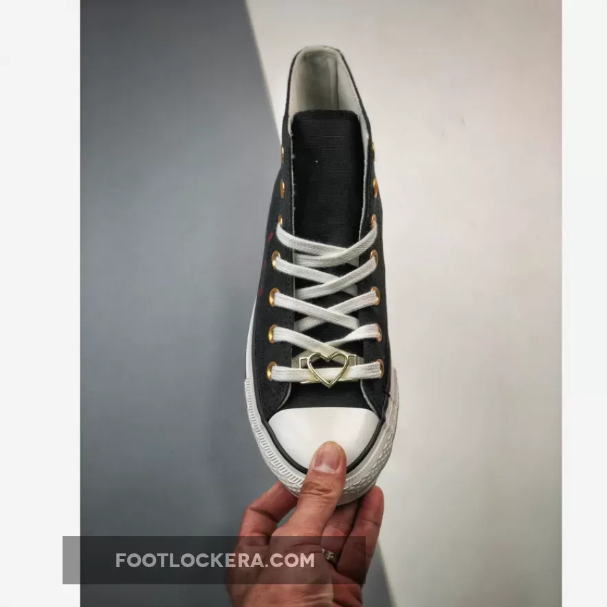 Converse’s OG classic, the Chuck Taylor, joins the brand’s Valentine’s Day Pack. Meet the Converse Chuck Taylor High Hearts Black. This high-top Chuck Taylor has a breathable cotton canvas upper in black. Metallic gold eyelets and metallic gold heart lace deubrés give the shoe a festive feel. Tiny Back Ally Brick-coloured embroidered hearts adorn the lateral side of the shoe along with a bigger gold foil heart with a red embroidered outline. The medial All Star ankle patches have light pink Converse branding and a gold star with a gold heart with a red embroidered outline layered over it.