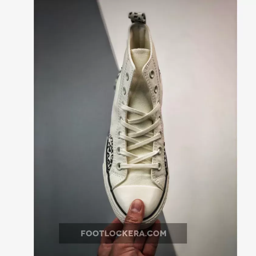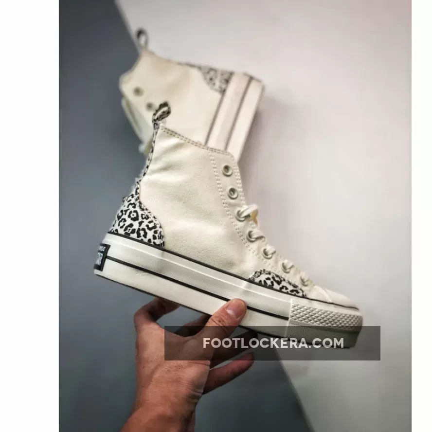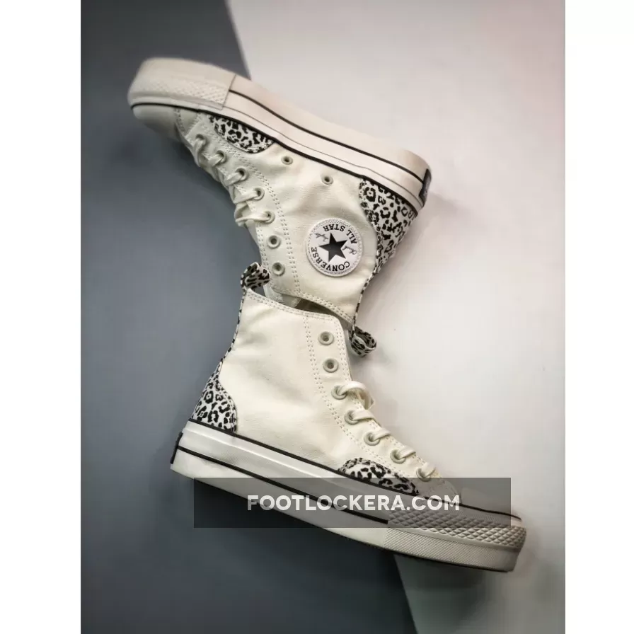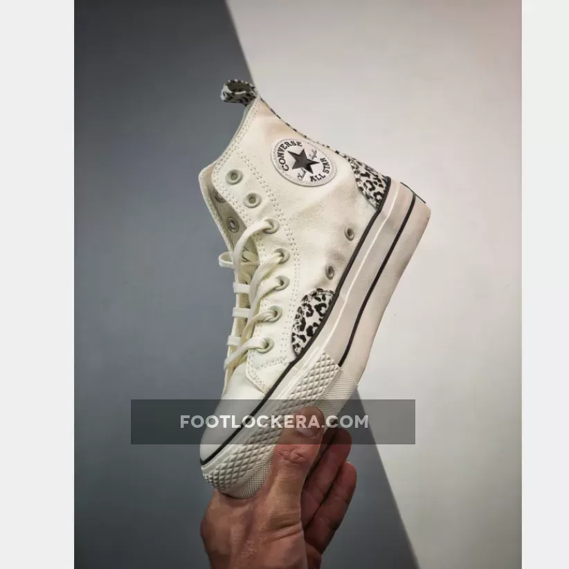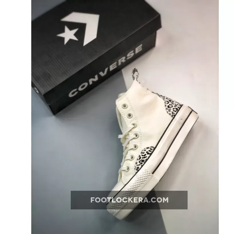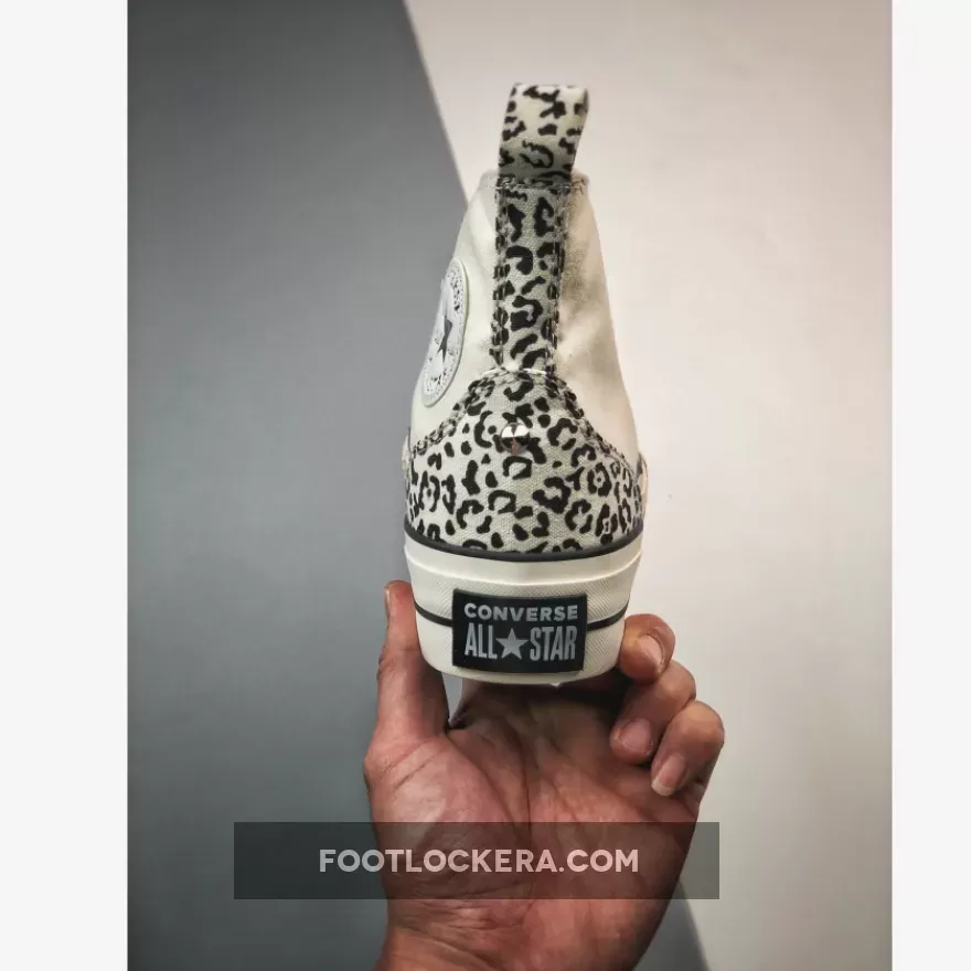 Elevate your style in an instant with the Converse Chuck Taylor Lift Platform High Leopard Egret. Decked in a fun, monochromatic look, this chic high-top pair starts with a durable white canvas upper. This colourless base is spruced up with patches of bold leopard prints on the side panels and the backside including the pull tab. Slip these on and stand out.