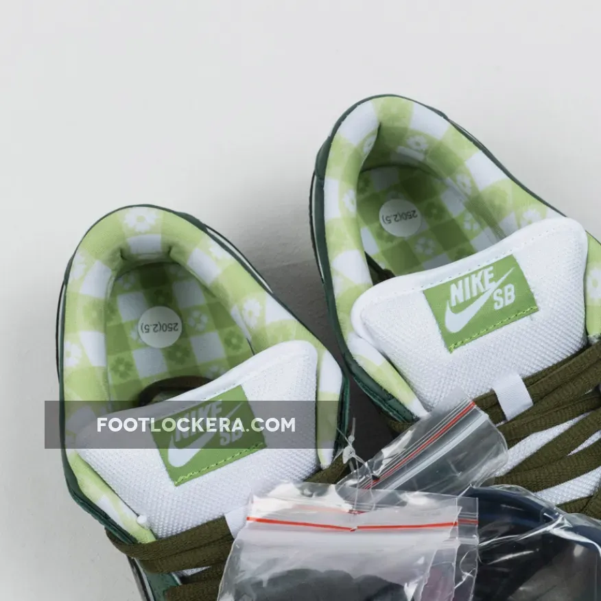 Looking closer this Nike SB Dunk Low features shades of Green throughout. In addition we have the traditional checkerboard – picnic pattern on the liner which is done in Light Green and White.