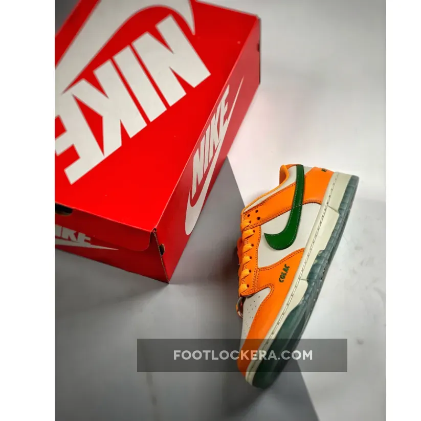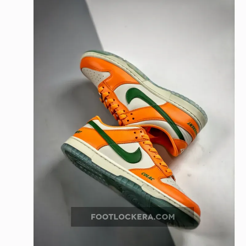 Previewed below, the Florida A&M x Nike Dunk Low comes dressed in the school’s colors consisting of a White leather base paired with the Orange on the leather overlays, laces, and lining. Elsewhere you will find Green Swooshes as well as custom details such as the school’s rattlesnake, Rattler mascot on the tongues, text behind the tongue tags, and 1887, the year the university was founded, embroidered on the heels. Lastly, you will find “COLAC” (College of Love and Charity) on the lateral forefoot with text on the heels atop a graphic translucent outsole.