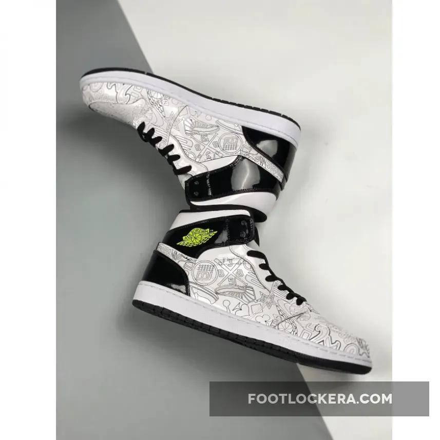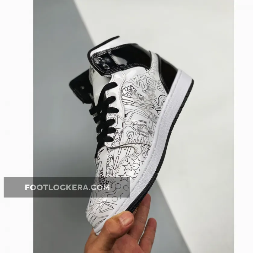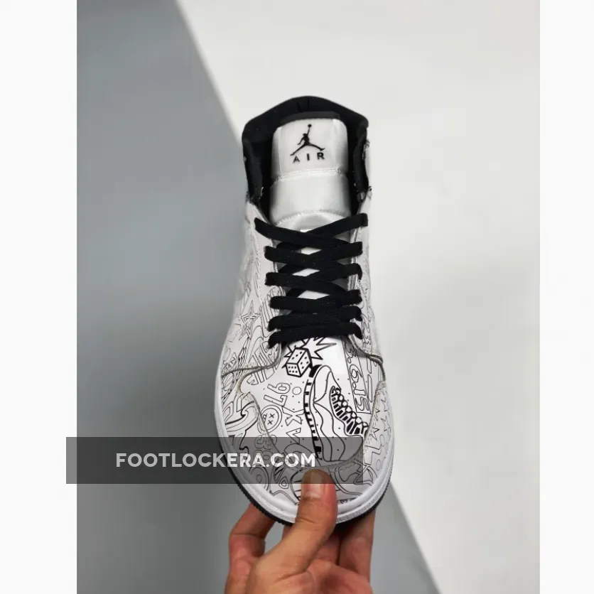 Deceptively simple, this AJ1 Mid acts as a coloring book turned shoe. Thinly penned graphics adorn the entire forefoot and much of the profile, mirroring the prints and patterns found in the aforementioned. The white backdrop only serves this inspiration, allowing one to infuse their own personality and style. Behind, the ankle flap, heel, laces, and lining are not quite as customizable, their blacked out finishes only a stage for the usual Wings and Jumpman branding.