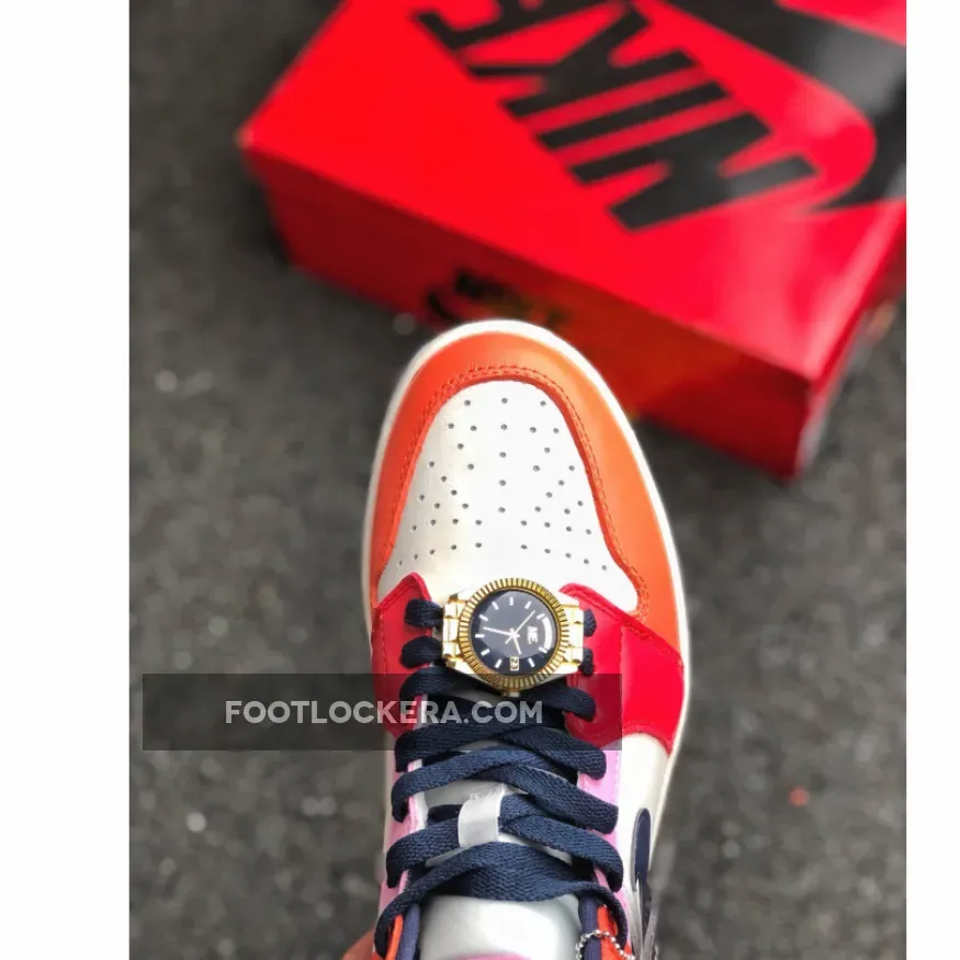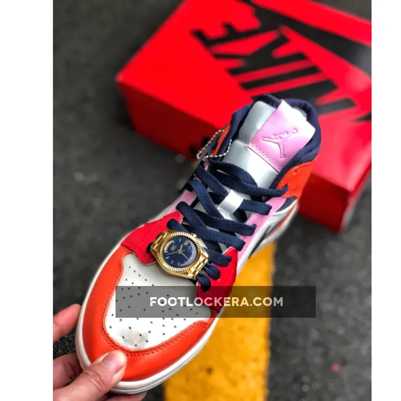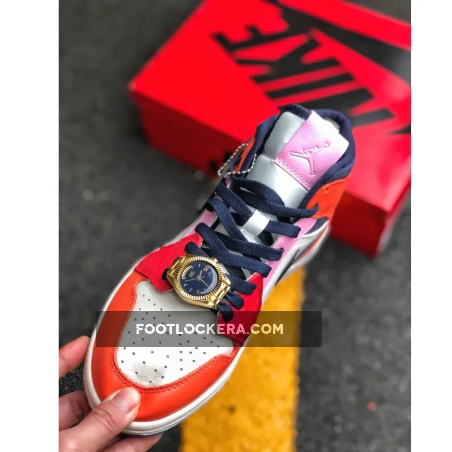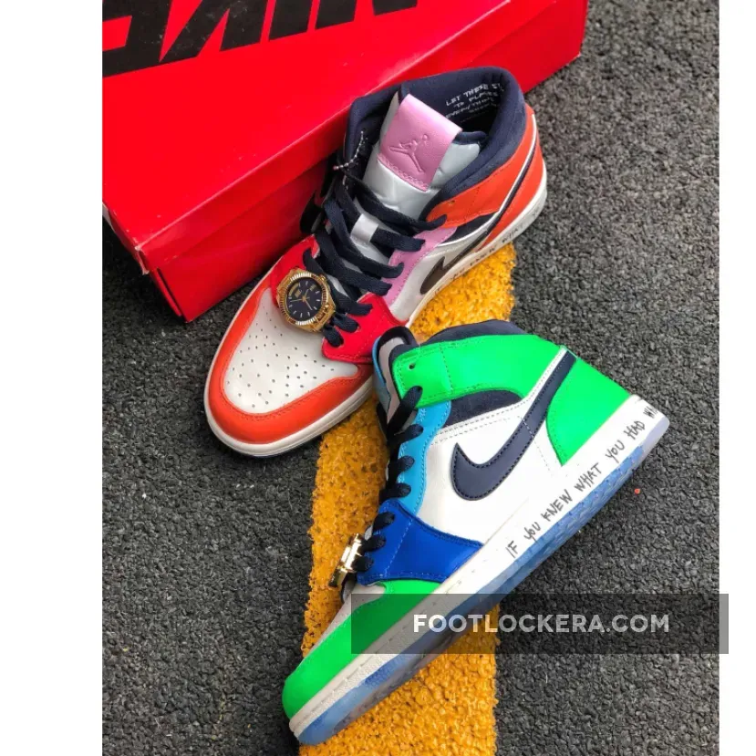 This womens Jordan 1 Mid SE is features a multicolor leather and neoprene upper. Right and left sneakers display a different set of color blocking, providing a feeling of individuality. Highlighted with text across the midsole, three sets of laces, and a watch lace jewel atop a translucent outsole completes the design. These sneakers released in November of 2019 and retailed for $130.