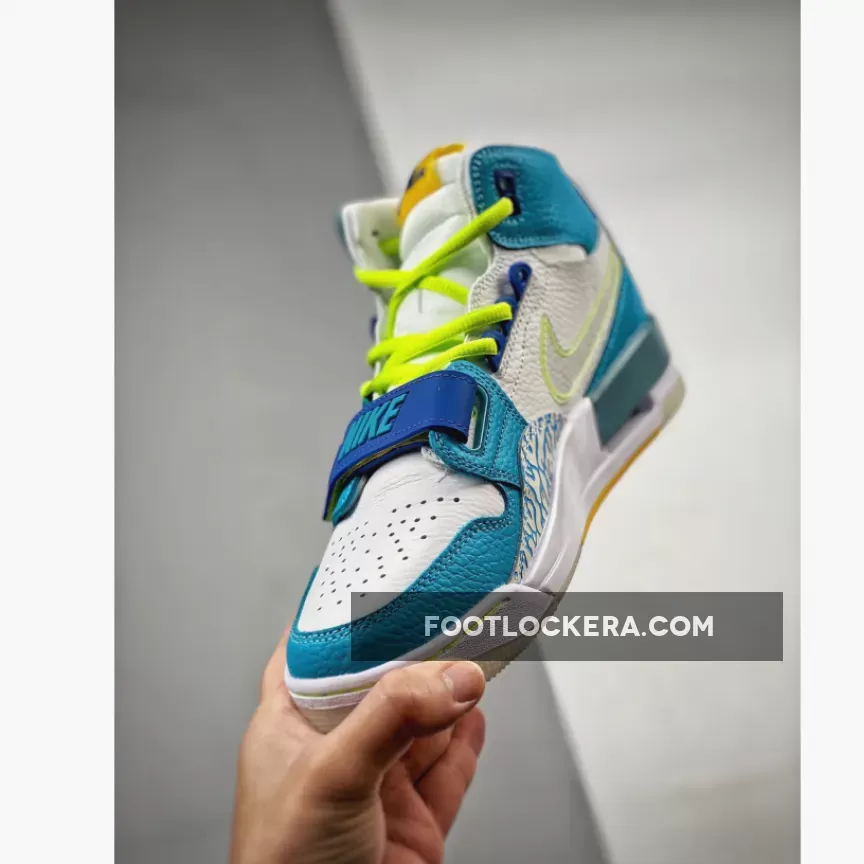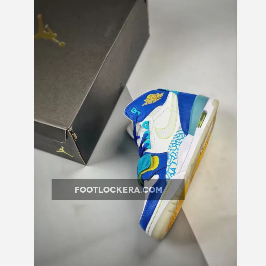 The Jordan Legacy 312 GS ‘Fly’ draws inspiration from the Air Jordan 1, Air Jordan 3 and Nike Alpha Force. Don C. designed the model, which released in March 2019 with a colorway of Blue Lagoon, Clear, Team Royal, Off White, Blue Gaze and Amarillo. The sneaker comes with an abundance of Jordan branding, a leather and synthetic upper, and a forefoot strap.