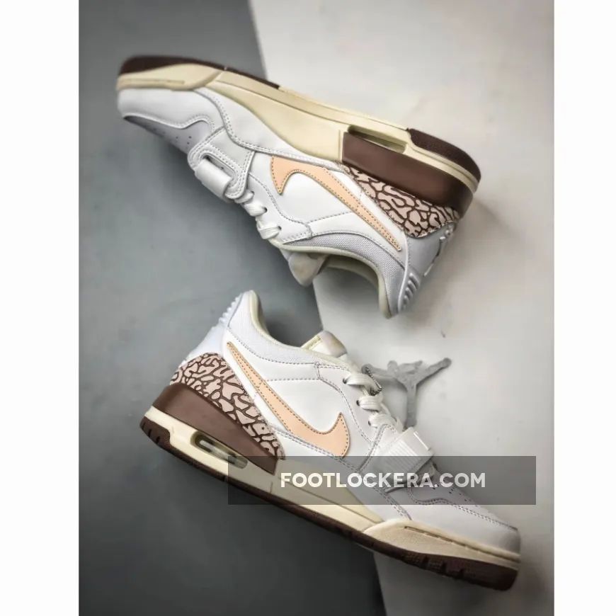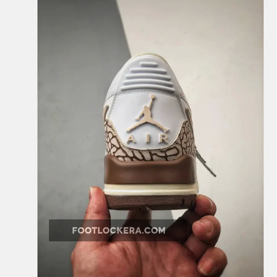 White leather makes up the base layer on this pair, joined by light tan accents on the Swoosh and lining for a tasteful contrast. The heel is adorned with a brown elephant print, echoing the detailing on the sole, while a tan Jumpman logo on the back completes the look.