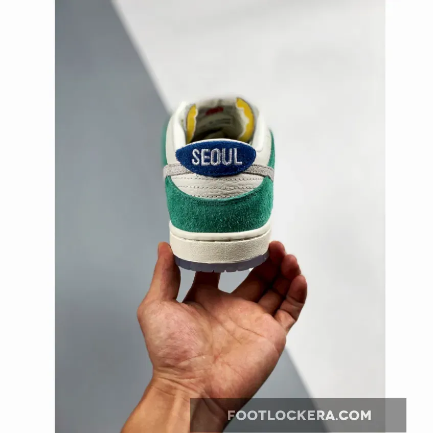 Made in collaboration with the Korean retailer, the Kasina x Nike Dunk Low ‘Road Sign’ features colors inspired by the signage that lines the major highway connecting Busan and Seoul. The upper combines off-white leather with Neptune Green suede overlays and a grey suede Swoosh. Navy blue heel tabs replace Nike branding with ‘Busan’ and ‘Seoul’ on the left and right shoe. Additional details include Kasina’s logo on the lateral heel and the retailer’s name printed in Korean lettering on the tongue tag.