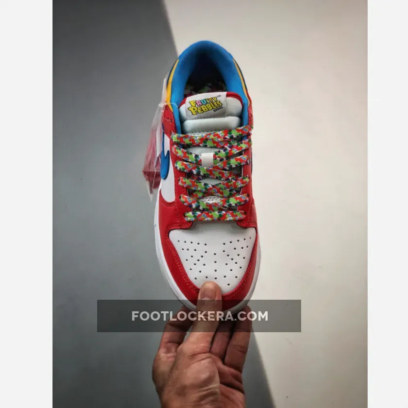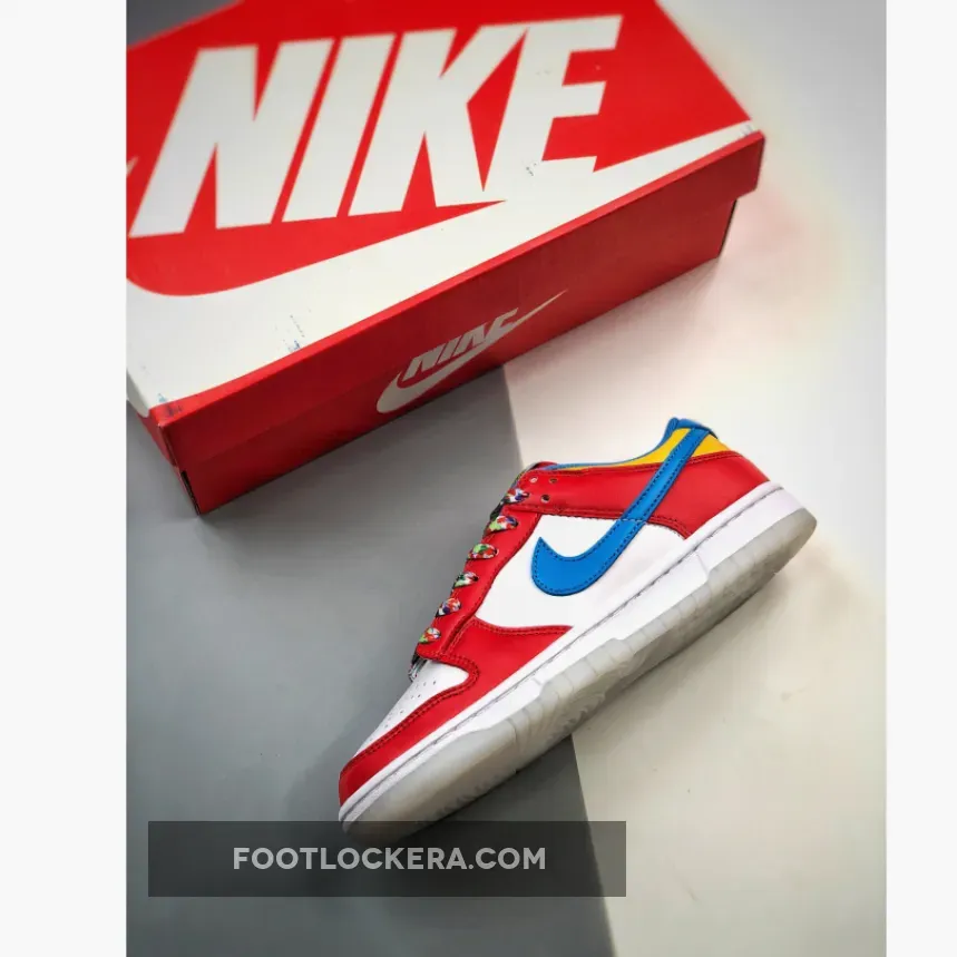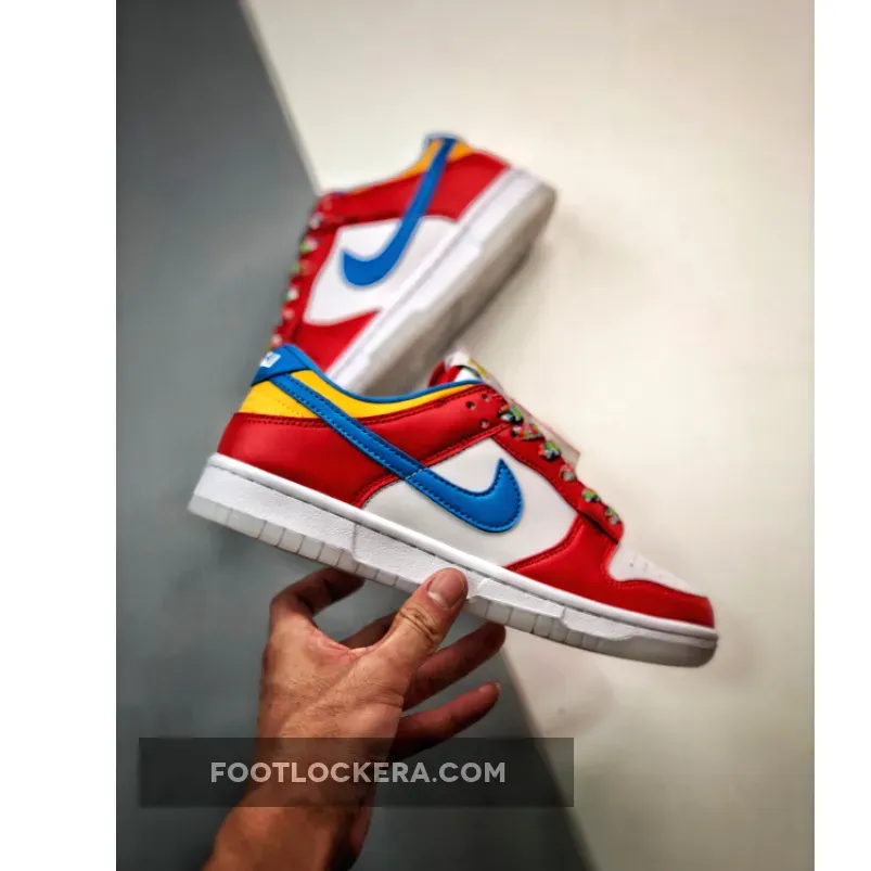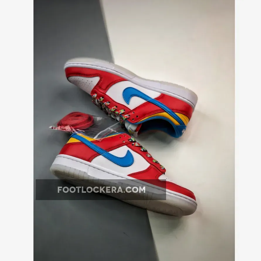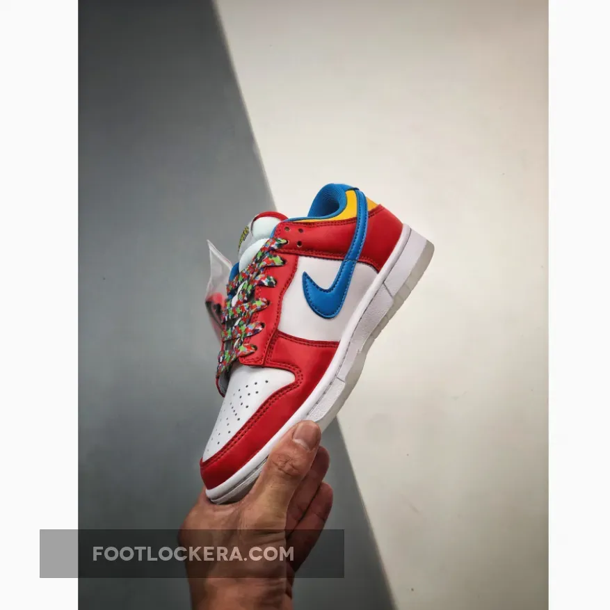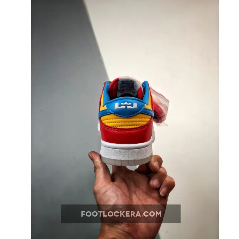 Look out for the delicious LeBron x Nike Dunk Low Fruity Pebbles. This fun sneaker features a vibrant, cereal-inspired colourway that will surely perk up your mood. The smooth white leather base covers the perforated toe and quarters while red animates the forefoot, throat and heel overlays. Blue enters the picture via the Swoosh and heel tab.Finally, pops of yellow complete the eye-catching palette. Finishing touches include the multicoloured laces and the vivid cereal graphics found at the insole.