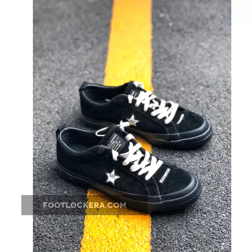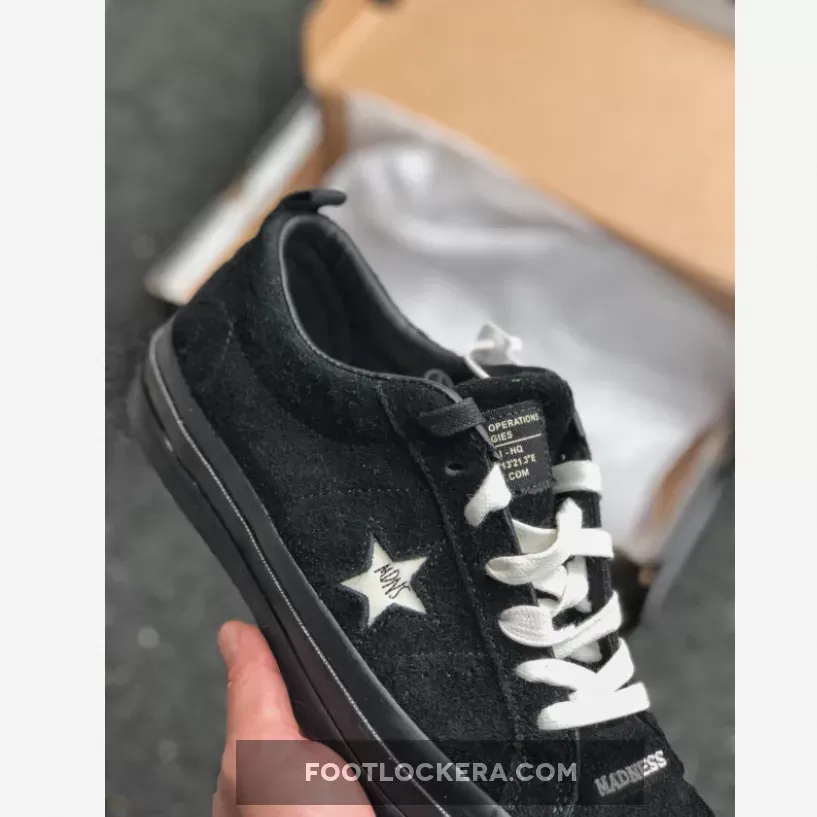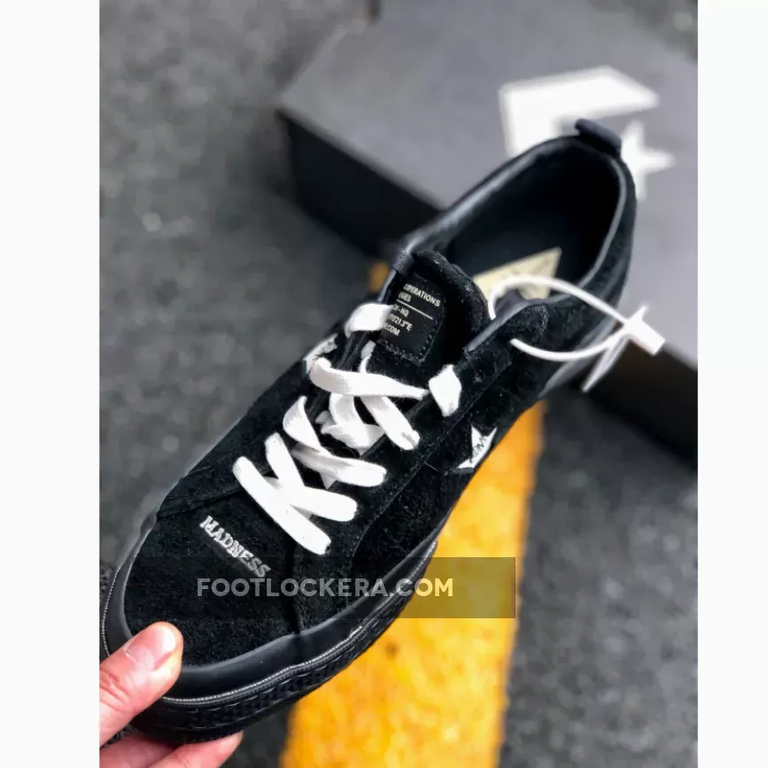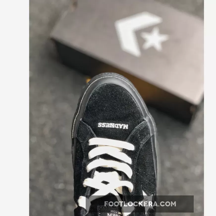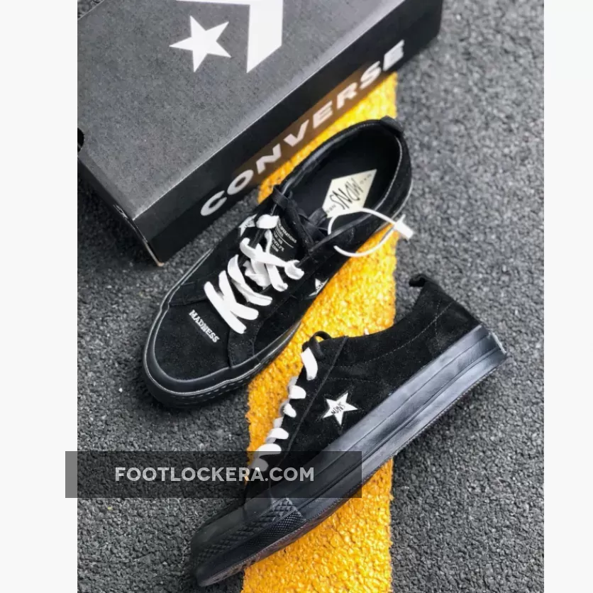 The classic low-top silhouette boasts a black suede upper, which shows varying hues of black due to its texture, black stitching throughout, off-white star branding with MADNESS logo embroidery, off-white embroidered detailing at the toe and off-white laces for a pop of contrast. A glossy black midsole keeps the colorway stealth while a gum outsole adds a classic element to the design.