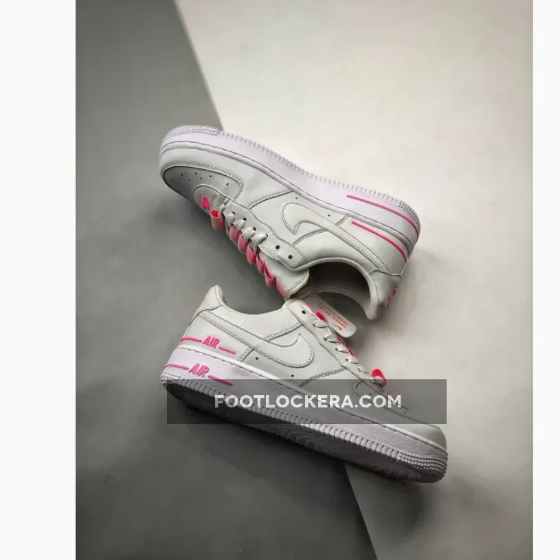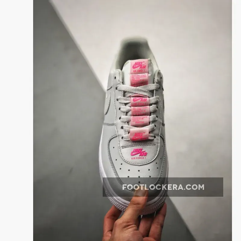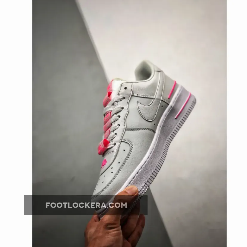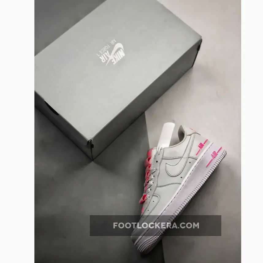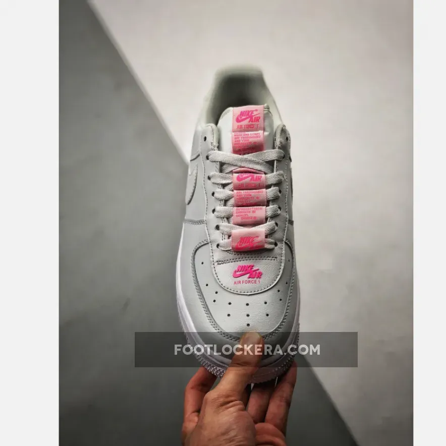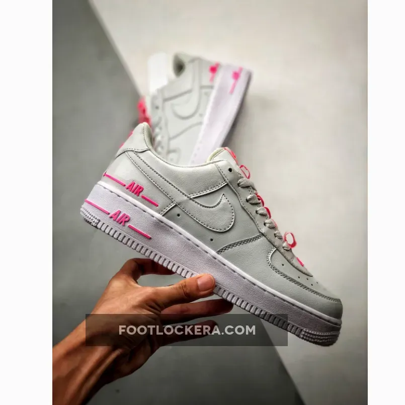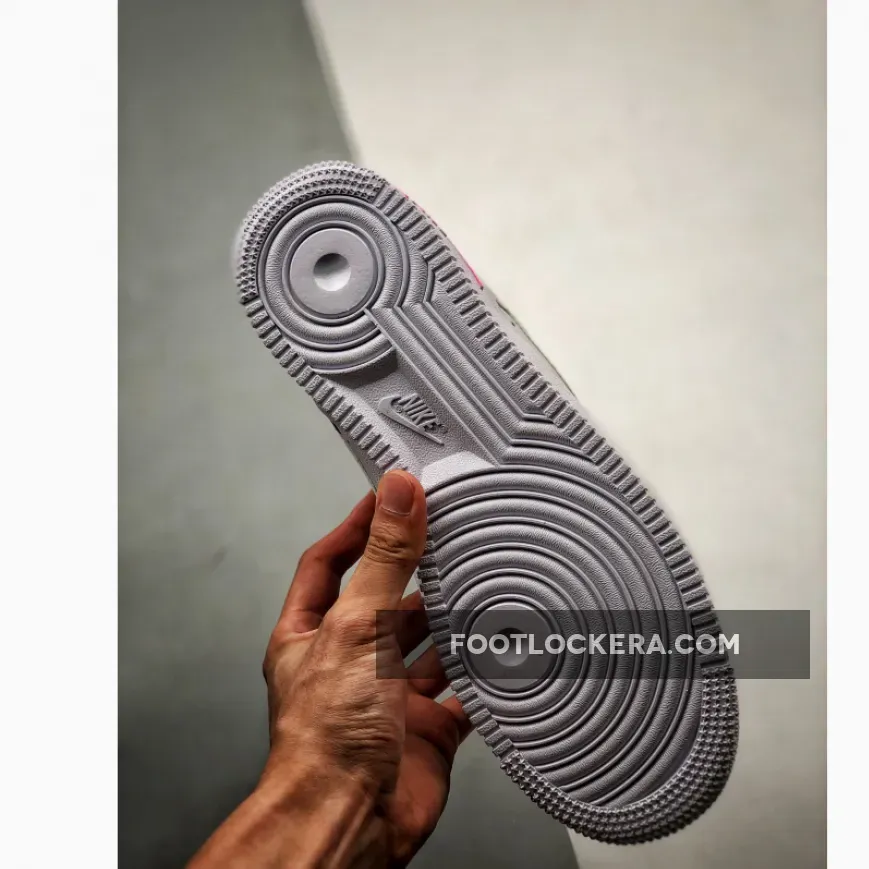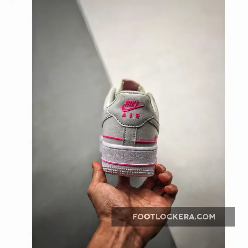 Smooth, light grey leather covers the upper of this grey and red Double Air Air Force 1, with the factory label that usually sits on the inside of the tongue repeatedly running down the centre of the lace unit. The perforation holes that usually appear scattered across the toebox have been replaced with a ‘Nike Air’ logo in bright pink. Light grey Swooshes sit stretched out across both side walls, blending in against the neutral coloured upper.