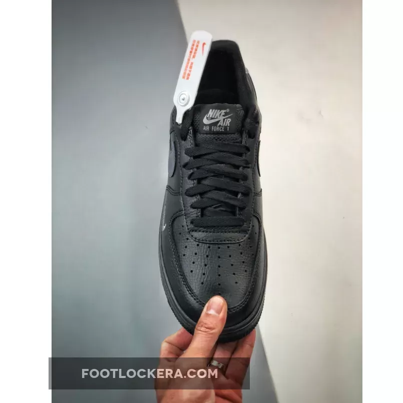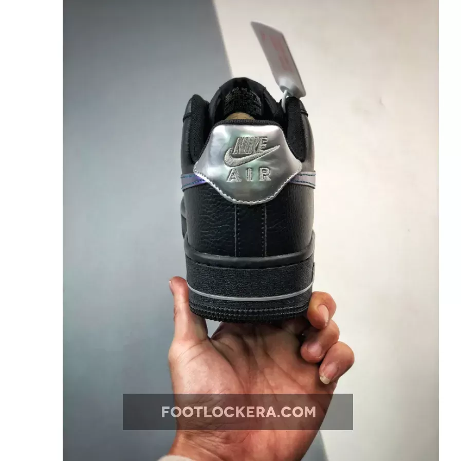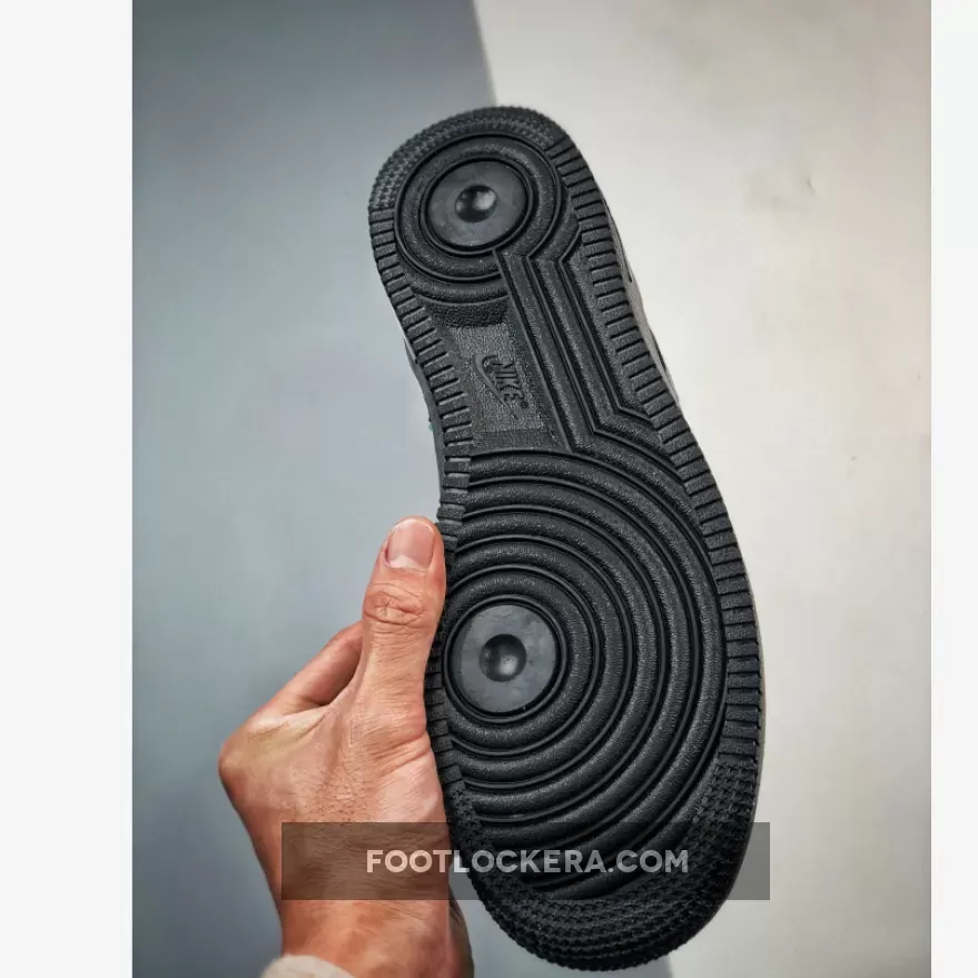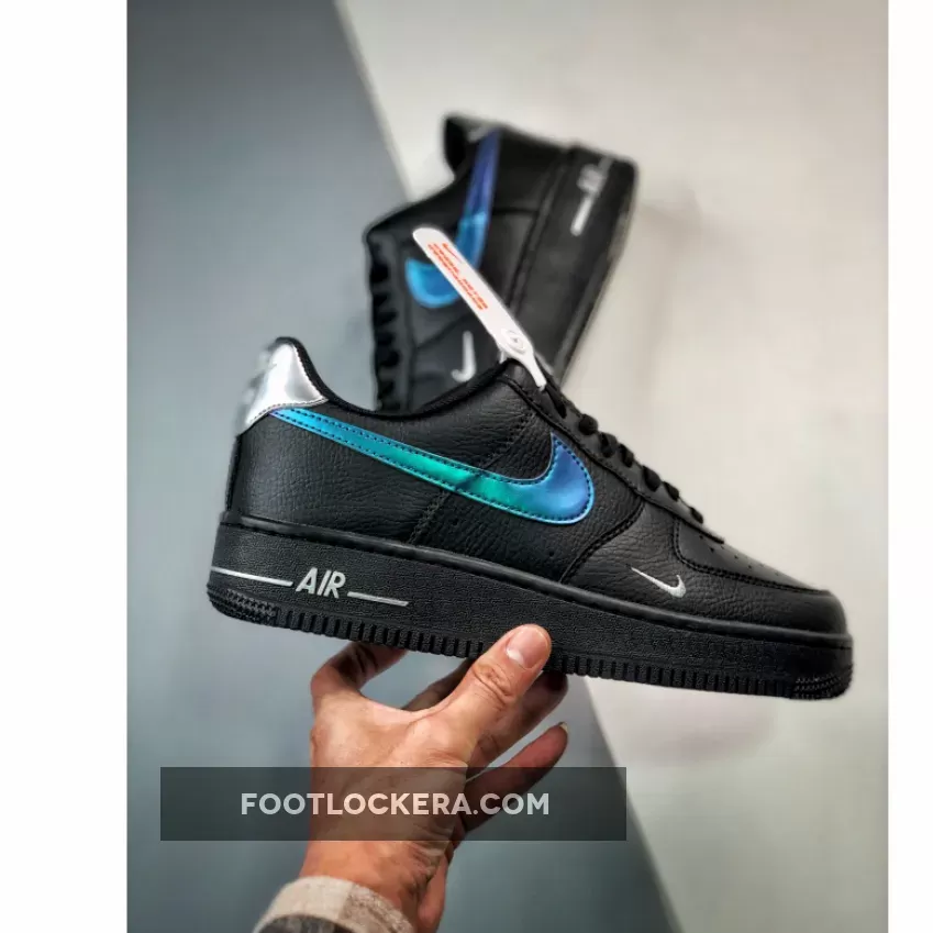 This low-cut AF1 has an all-black tumbled leather upper from heel to toe, matching the laces, the mesh tongue and the mesh sock liner. The signature profile metallic teal blue Swooshes sweep across both the medial and lateral mid-panels like bolts of blue lightning. The next colour to catch your eye is silver. This can be found on the embroidered mini Swooshes on the lateral toe cap, the branding on the black tongue tab and the heel tab with matching embroidered branding. The AIR branding at the midsole complements the silver hues with a Wolf Grey colour. A pitch black sole unit wraps up the look of these kicks.