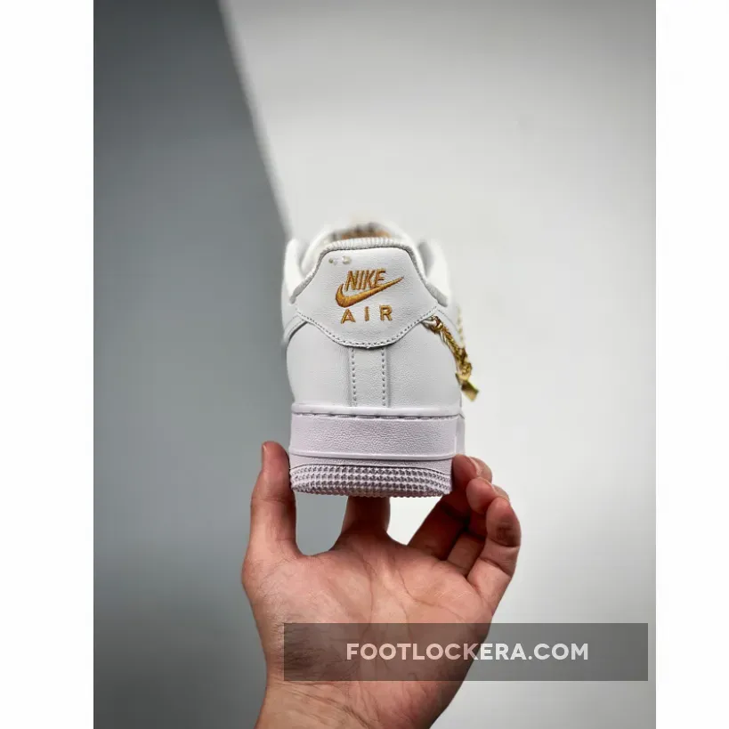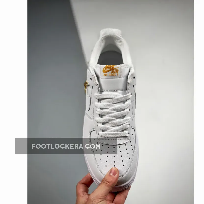 The base of the upper is all white-on-white smooth leather from toe to heel, including the profile Swooshes. All of these make the golden charms, hanging from the top of the eye stays and extending until the heel, stand out. The Metallic Gold Nike Air branding on the tongue matches nicely with the charms. Don’t forget to use our Air Force 1 size guide to know how they fit.