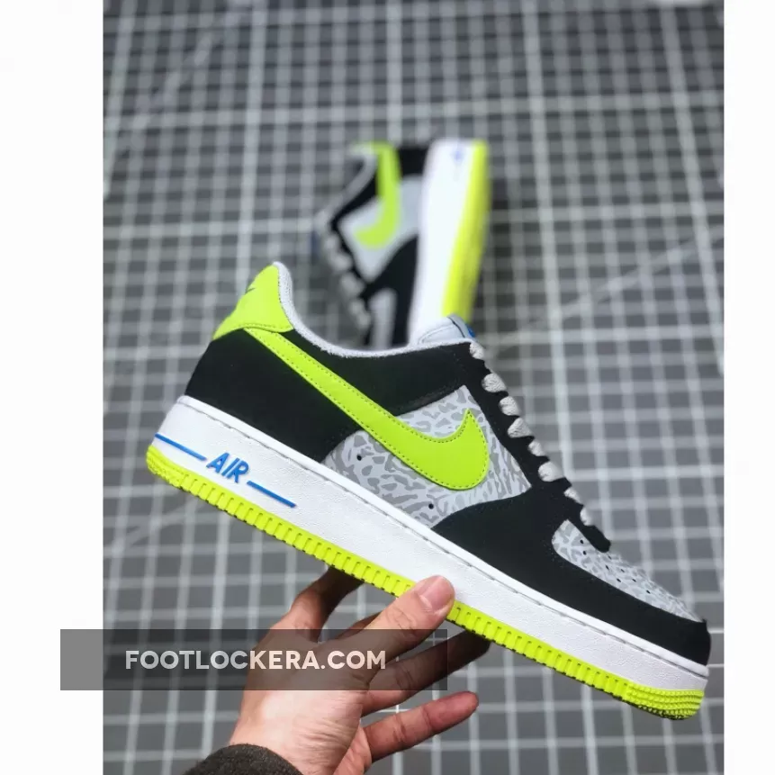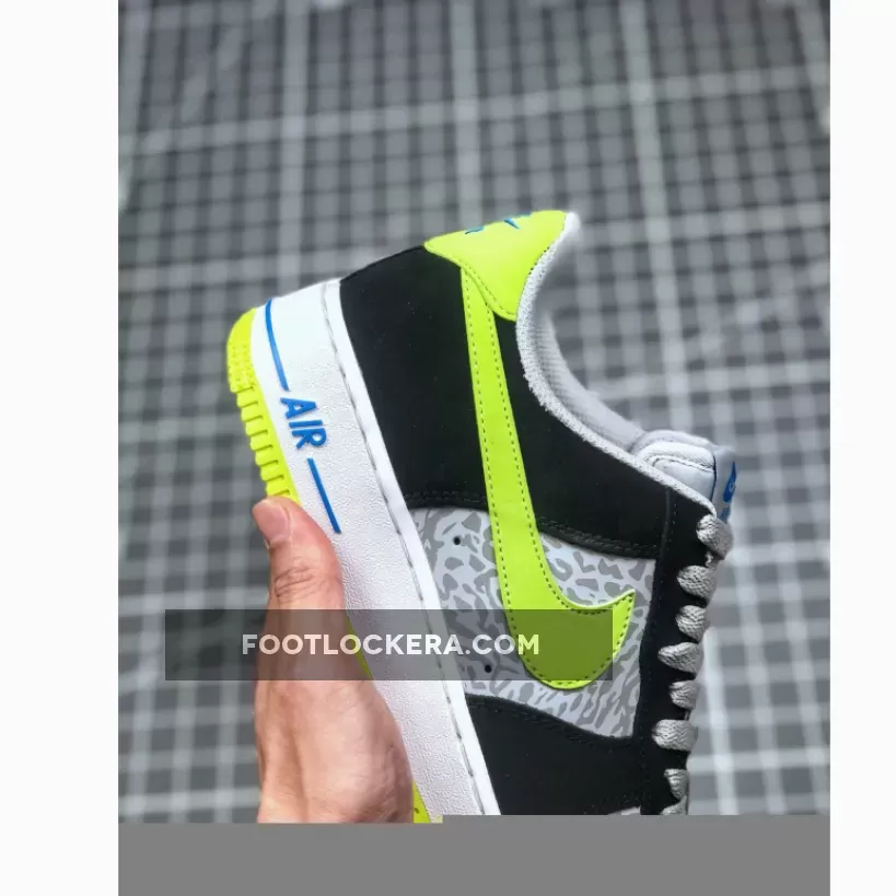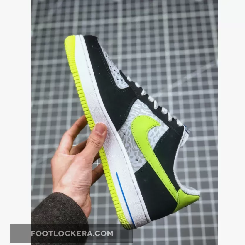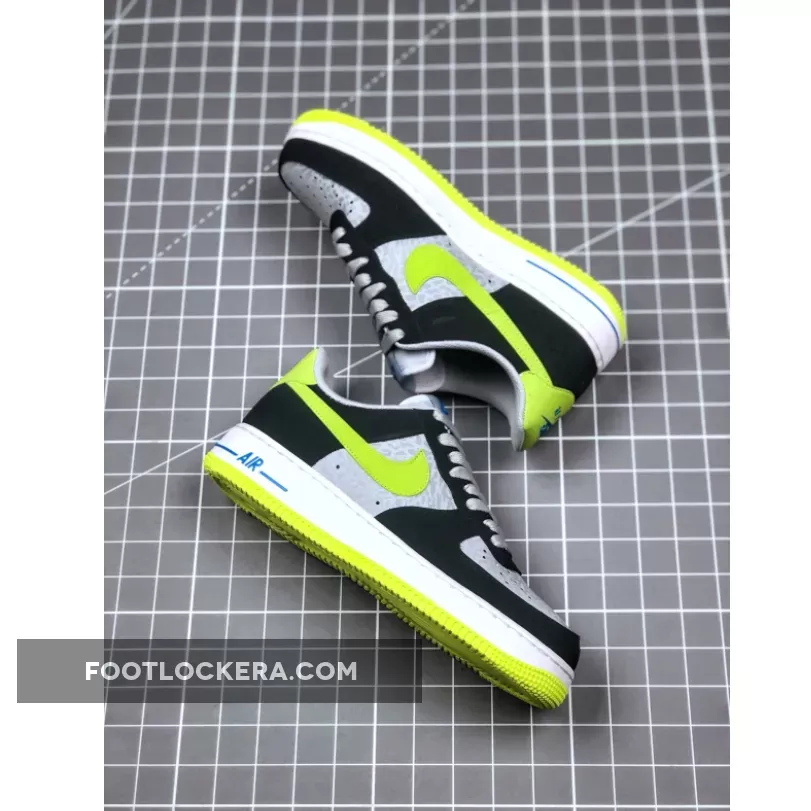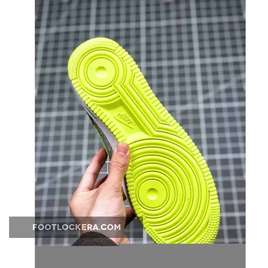 This Nike Air Force 1 Low comes in a reflect silver, volt and black colorway. Featuring a cement print reflect silver and black nubuck upper with volt accenting the Swoosh on the sides and outsole.