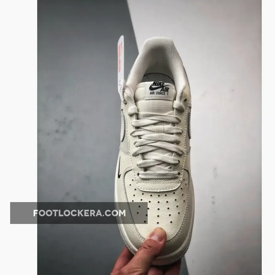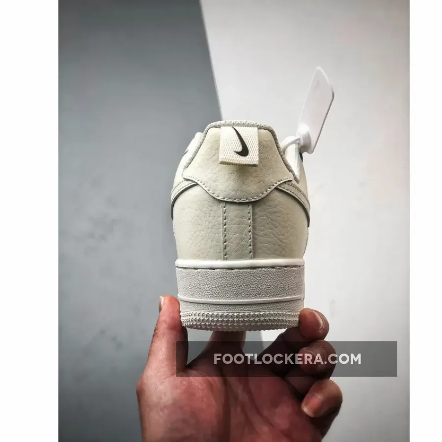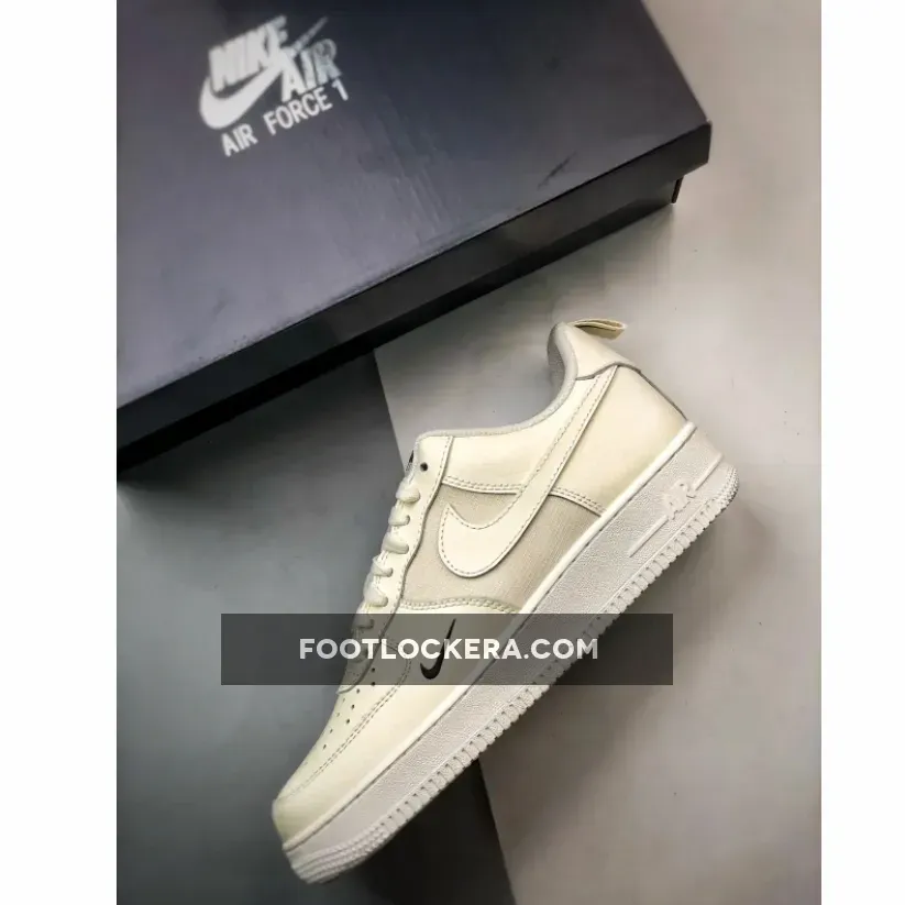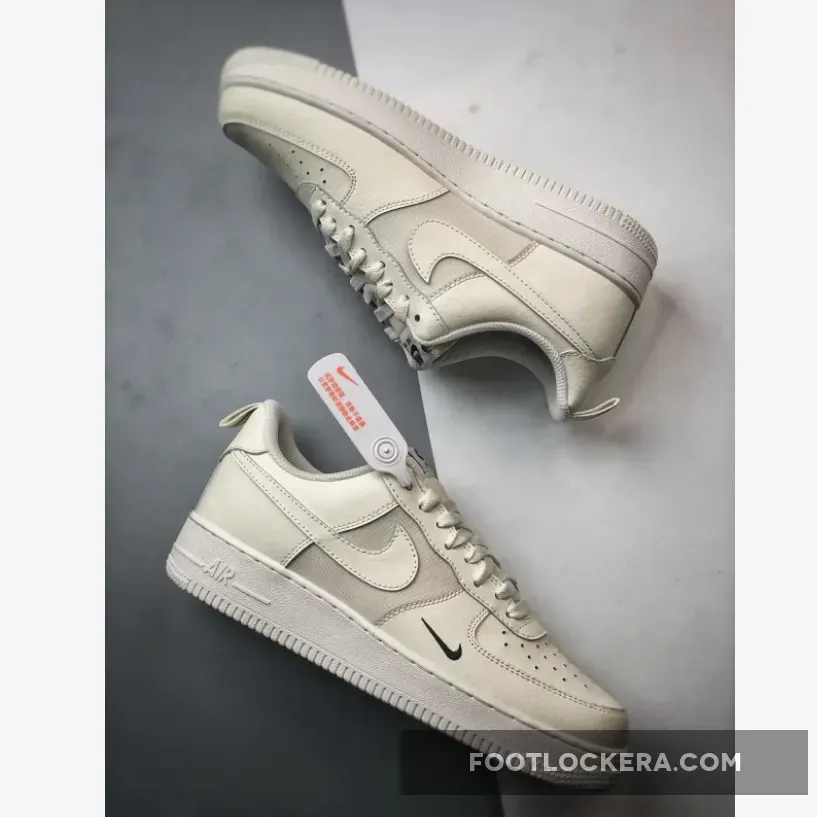 This iteration sports a pristine white leather upper with durable ripstop mesh on the quarter panel. The upper boasts a creamy, off-white hue, the sole unit a lighter sail shade, setting the stage for a minimalist yet striking look. A vibrant red mini Swoosh adorns the outer forefoot and heel pull tab, complementing the traditional leather Swooshes on the sides. Red AF1 branding appears on the nylon tongue and sockliner.