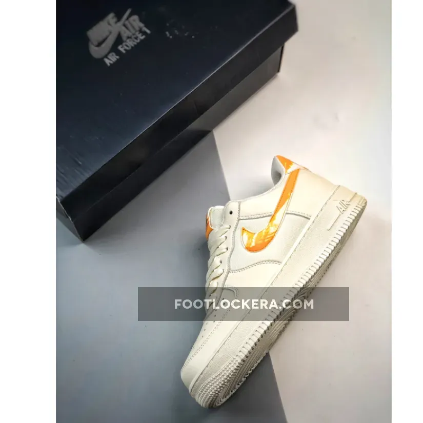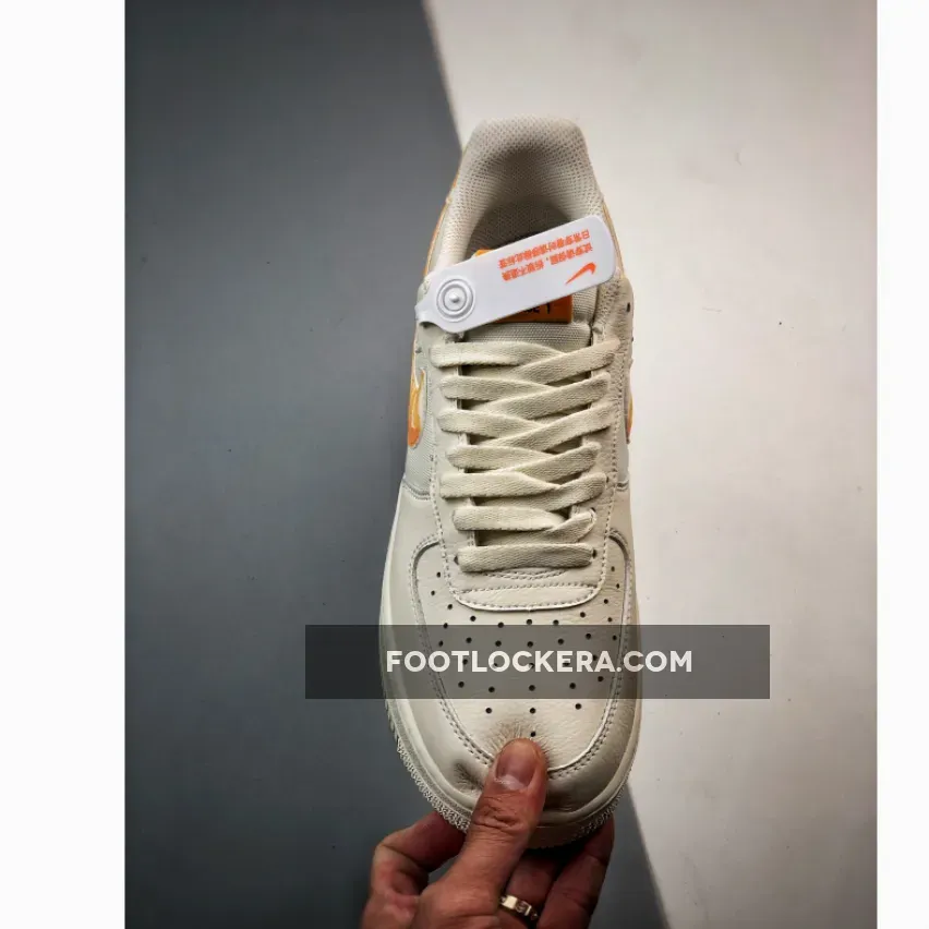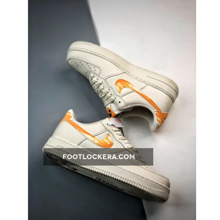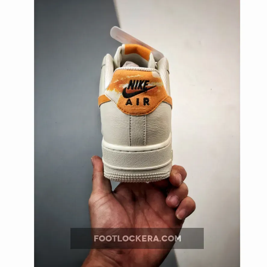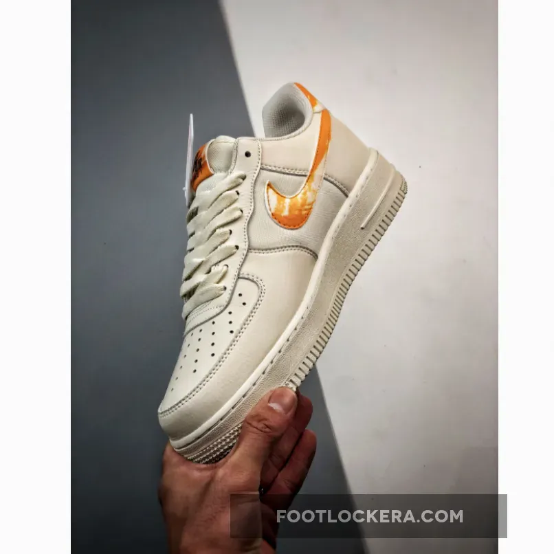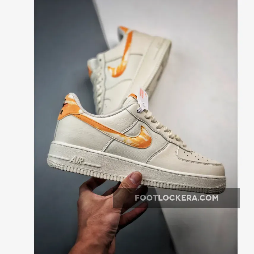 this Nike Air Force 1 Low features Sail across the upper while constructed with leather and mesh. Next, Orange streaks adorn the Swoosh logos, tongue labels, heels, and insoles. Black fills in the Nike branding on the tongue, heel tabs, and insoles.
