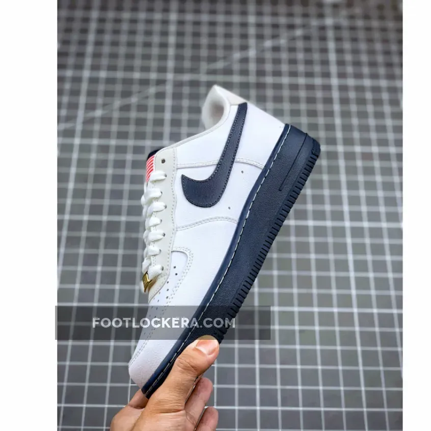 Dressed in a White, Sport Red, Metallic Gold, and Obsidian color scheme. This Nike Air Force 1 Low features a White tumbled leather upper paired with Obsidian Swoosh logos and rubber soles, along with Red contrasting accents throughout. An USA flag covers the tongue labels to complete the design.