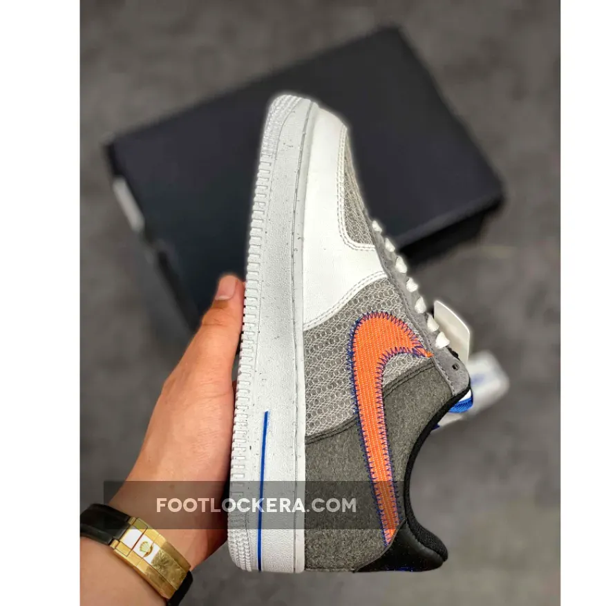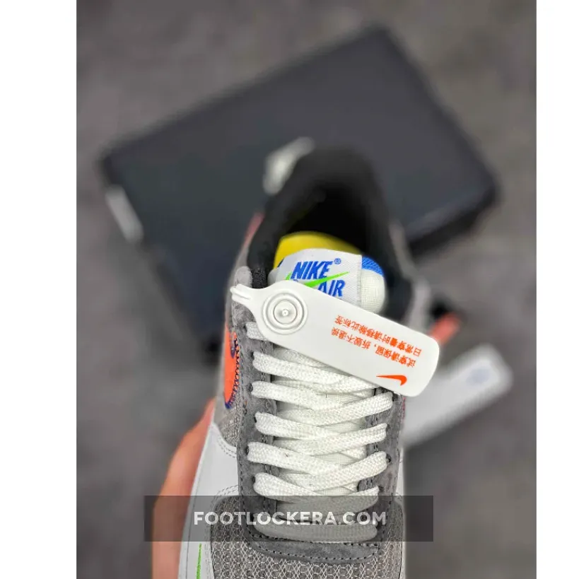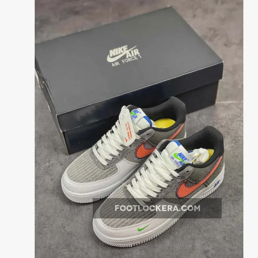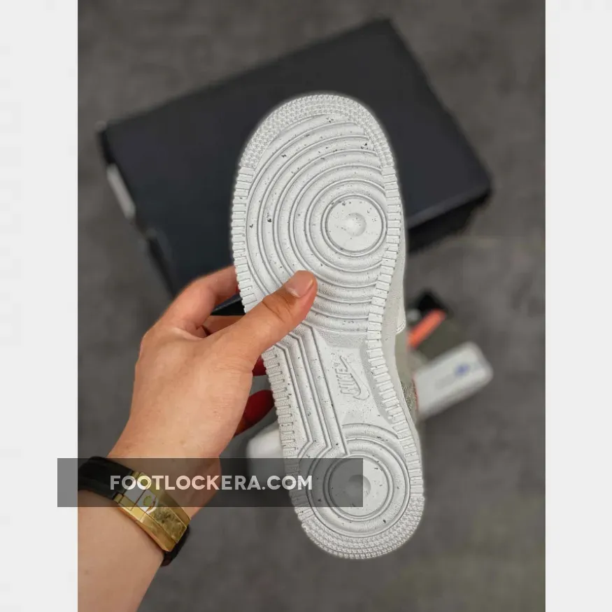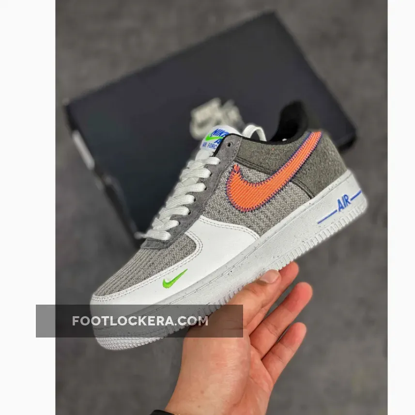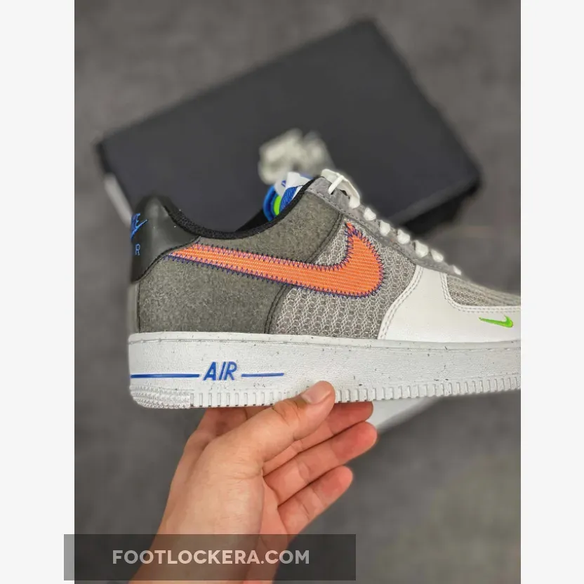 Dressed in a White, Sport Red, Grey, and Electric Green color scheme. This Nike Air Force 1 recycled yarns on the toe, side panels and eyelet overlays paired with a White leather toe overlay. Stitched Swooshes, mini Green embroidered Swooshes on the lateral toe atop a speckled midsole and recycled insoles completes the design.