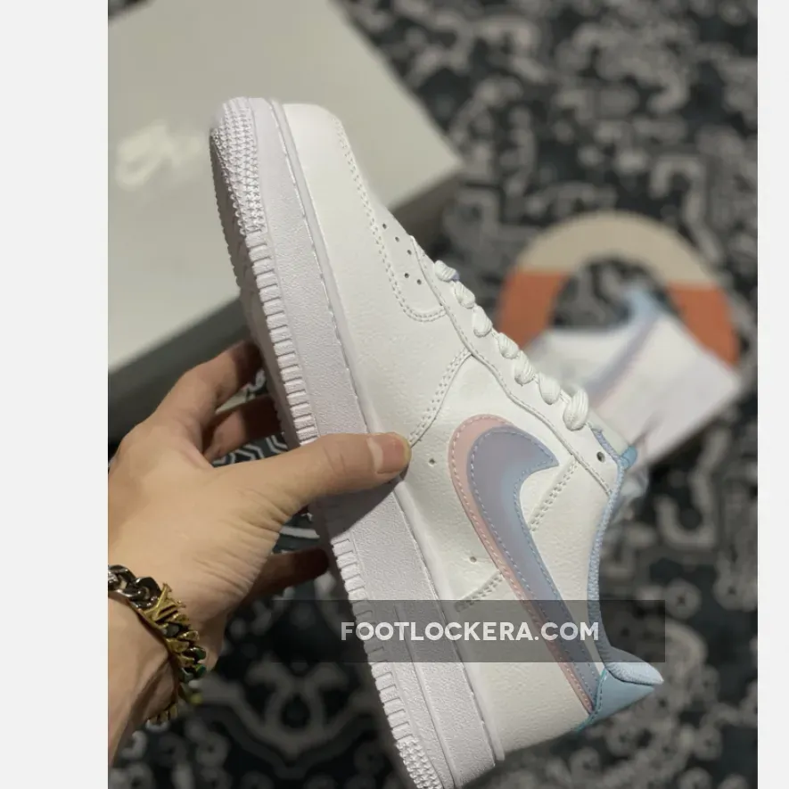 Translucent overlapped Swooshes in Arctic Punch and Light Armory Blue with white contrast stitches sit atop a clean leather base. Elsewhere, a balance of the two pastel shades is maintained. As the blue colors the heel, inside, and piping on the tongue, pink is applied to the tongue label. The colors alternate on the translucent lace dubraes to round out the look and add an extra element of fun.