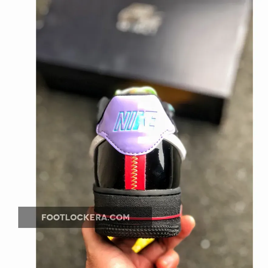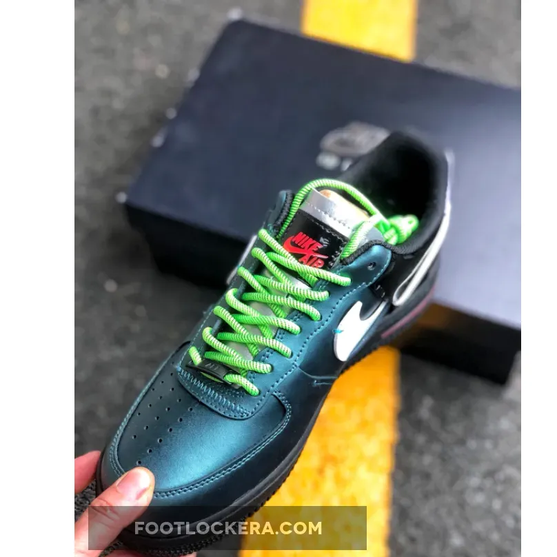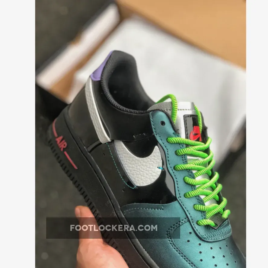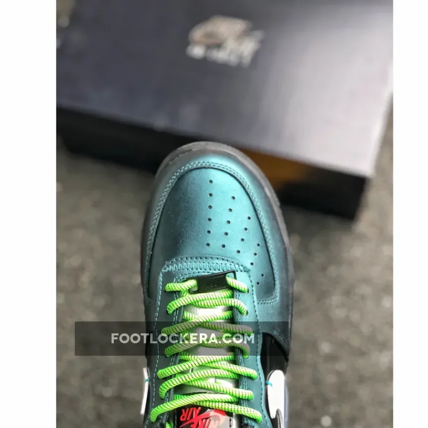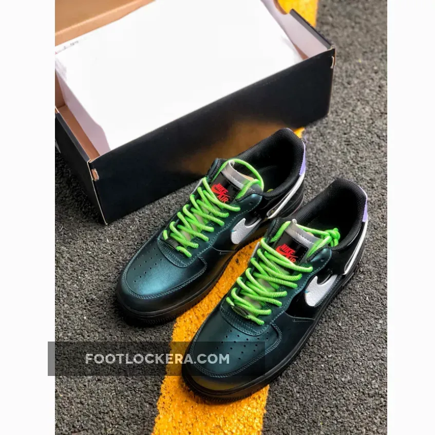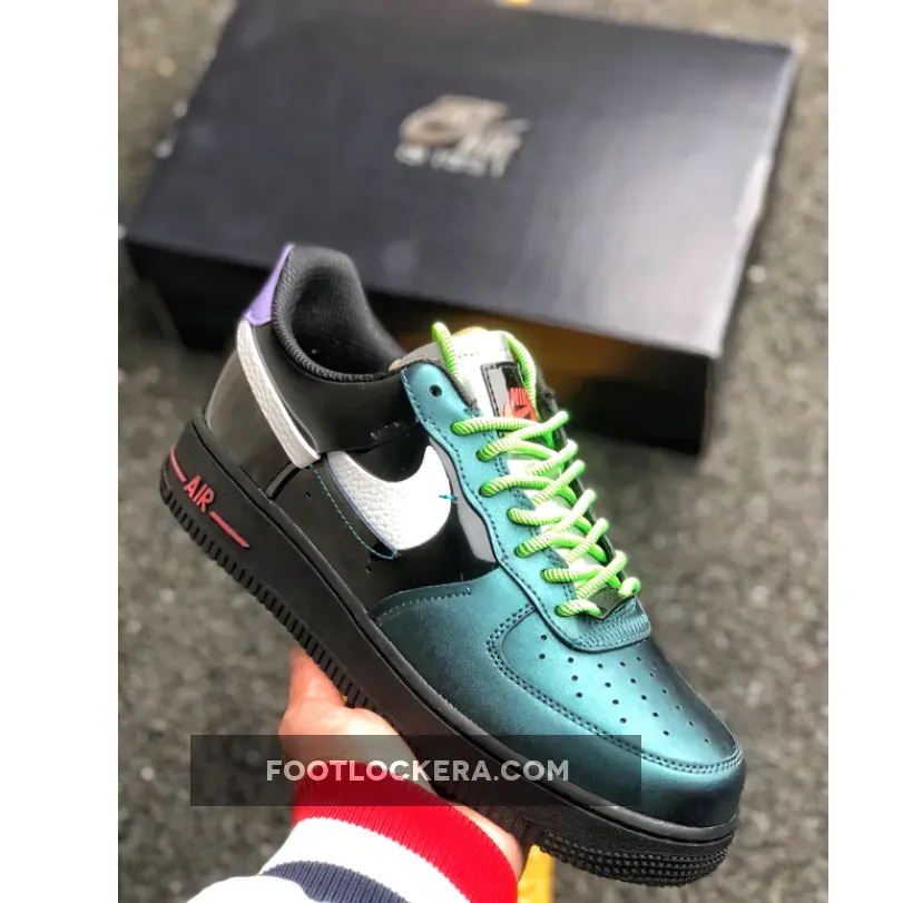 This reconstructed release of the Nike Air Force 1 features a metallic and iridescent upper with vibrant neon accents on the laces, heel tab, and AIR mark on the sole. A White tumbled leather broken Swoosh on the sides, Green rope laces and Purple patent leather heels completes the design.