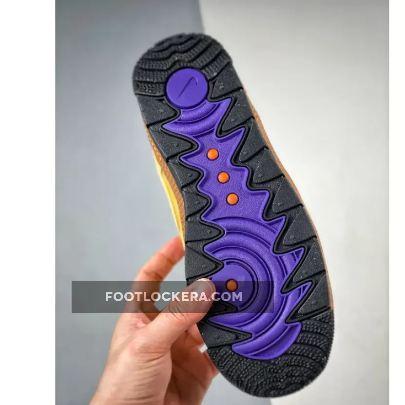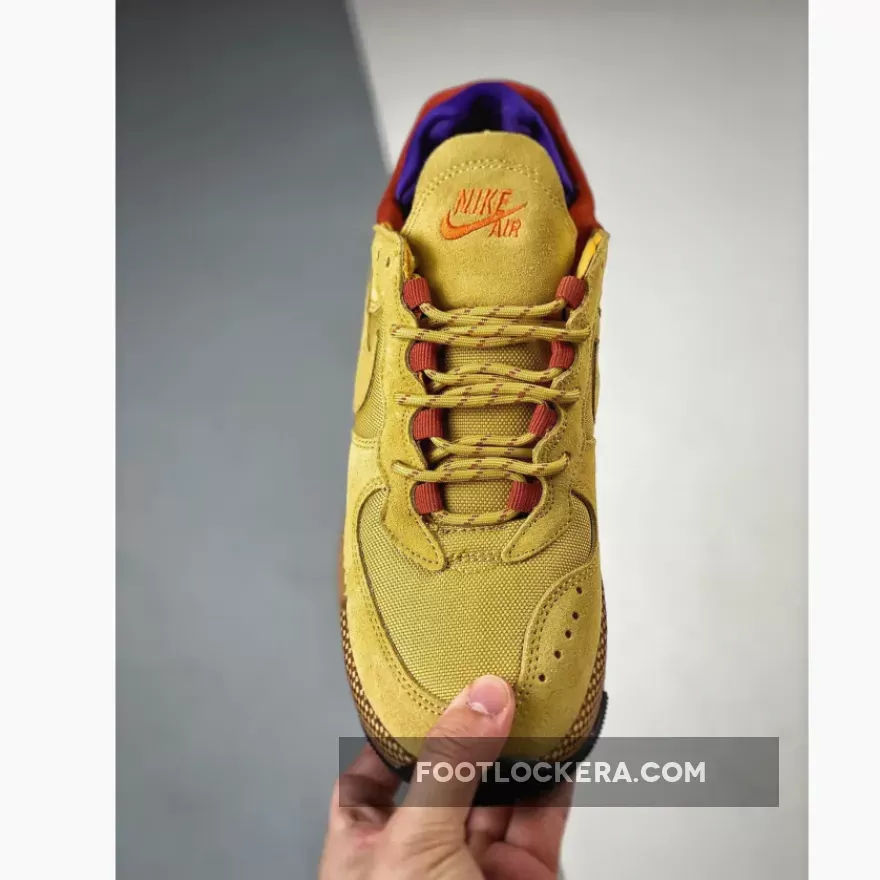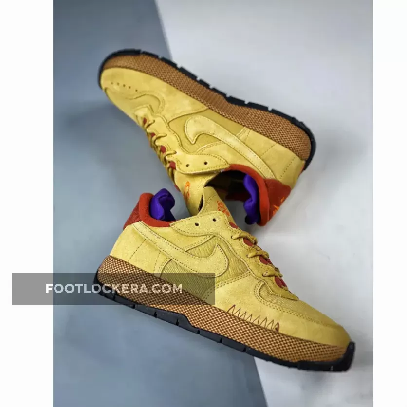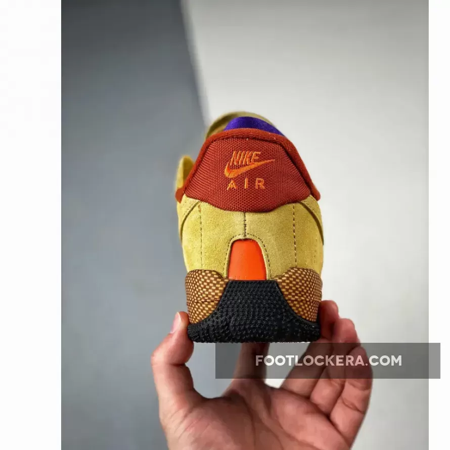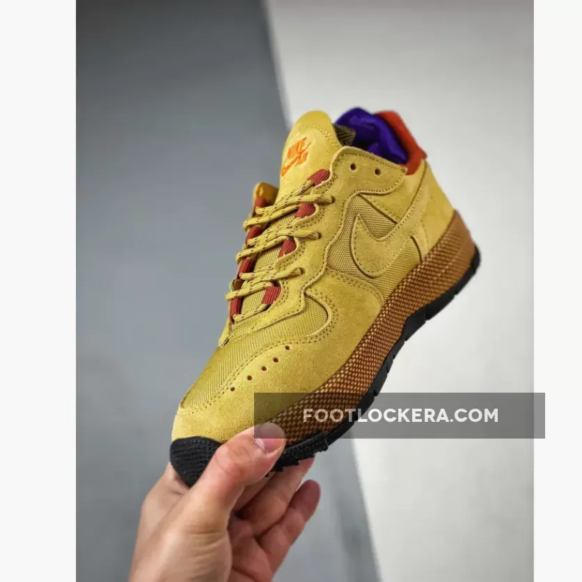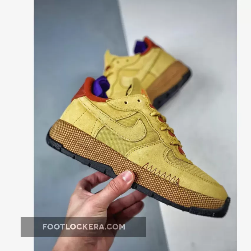 The Nike Air Force 1 Wild begins with a ballistic mesh base along with durable nubuck noted on the overlays. Additional standout details include pull tabs on the tongues, an added inner bootie for a snug fit, perforations and exposed stitching on the medial and lateral forefoot, a textile-wrapped midsole, and a trail-ready rubber outsole for optimum traction. This pair takes on a full Wheat Gold upper along with purple noted on the inner bootie and Rugged Orange hitting the heels ans tongue branding.