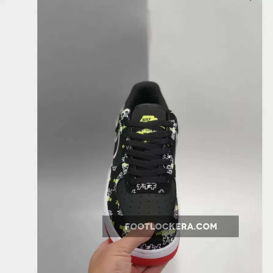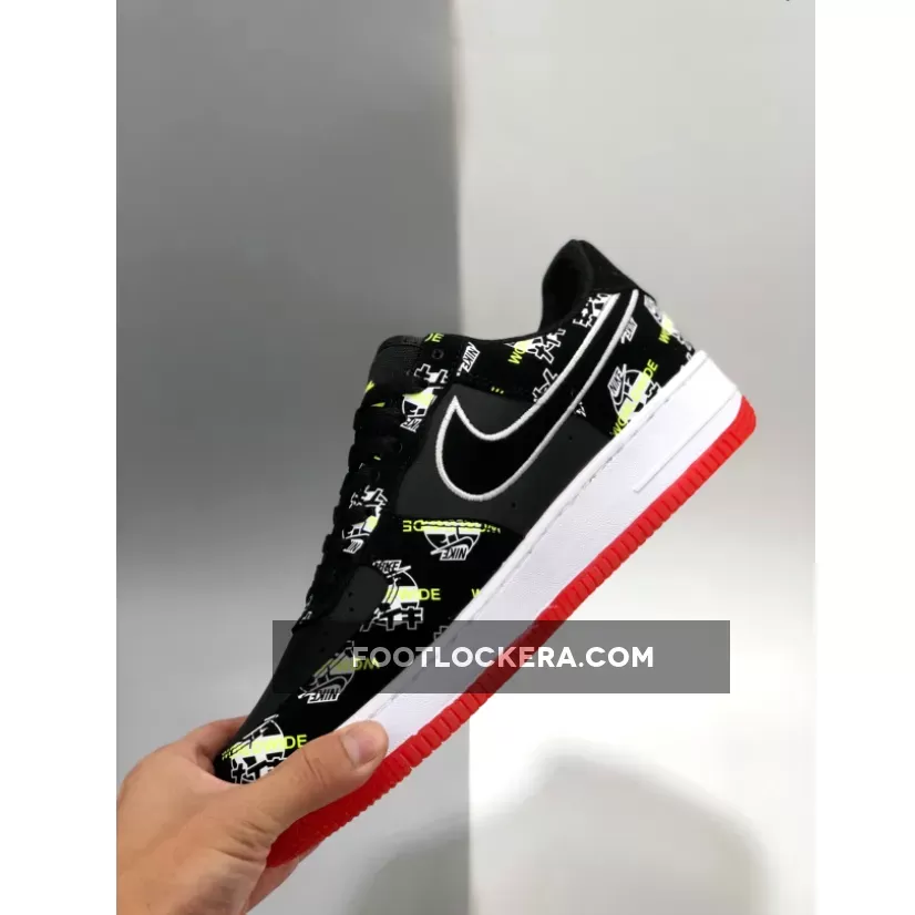 Dressed in a Black. Green Strike, and Flash Crimson color scheme. This Nike Air Force 1 Low features a Black upper covered in katakana and Nike’s globe logos.